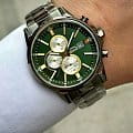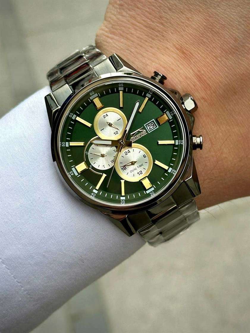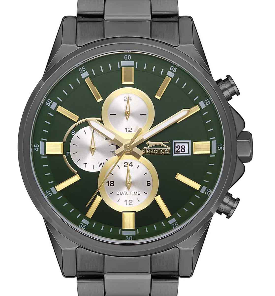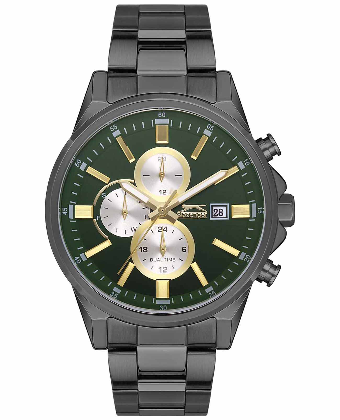 Часы Slazenger SL.09.2139.2.04 воплощают в себе элегантность и практичность, идеально подходящие для современных мужчин. Их зеленый циферблат защищен минеральным стекломМинеральное стеклоМинеральное стекло представляет собой искусственно выращенный минерал кварца. Такое стекло отличается особой устойчивостью к повреждениям и царапинам. Уступает по некоторым качествам сапфировому стеклу. и заключен в серый матовый корпус диаметром 46 мм, который изготовлен из прочного суперметалла с IP-покрытиемIP-покрытиеМетод ионного напыления. Демонстрирует повышенную устойчивость к истиранию, окислению и химическим веществам. Под воздействием высокого давления и температуры около 1500°C молекулы металла надёжно соединяются с частицами корпуса часов.. Часы оснащены указателями второго часового пояса, дня недели и текущего времени в 24-х часовом формате на дополнительных малых циферблатах. Окошко даты расположено в положении 3 часов. Стрелки и метки имеют люминесцентное покрытиеЛюминесцентное покрытиеПозволяет считывать показания времени в темноте. Производители наносят на стрелки, часовые индексы, безель или поверхность циферблата светонакопительный состав, дающий холодное свечение., что позволяет легко считывать время в темноте. Надежный кварцевый механизм обеспечивает точность, а водозащита 5 ATM делает их устойчивыми к воздействию воды. Браслет из суперметалла  с IP-покрытиемIP-покрытиеМетод ионного напыления. Демонстрирует повышенную устойчивость к истиранию, окислению и химическим веществам. Под воздействием высокого давления и температуры около 1500°C молекулы металла надёжно соединяются с частицами корпуса часов. имеет раскладную застёжкуРаскладная застёжкаТакой тип застёжки используется только на браслетах из металла. Она никогда не раскрывается полностью, происходит разделение на 2 и более частей. Раскладывающая застёжка снизит вероятность потери часов к минимуму., что подчеркивает современный стиль и позволяет легко снимать часы. Ширина ремешка 22 мм.