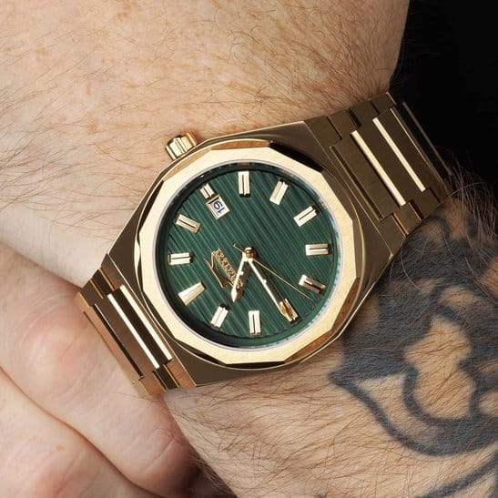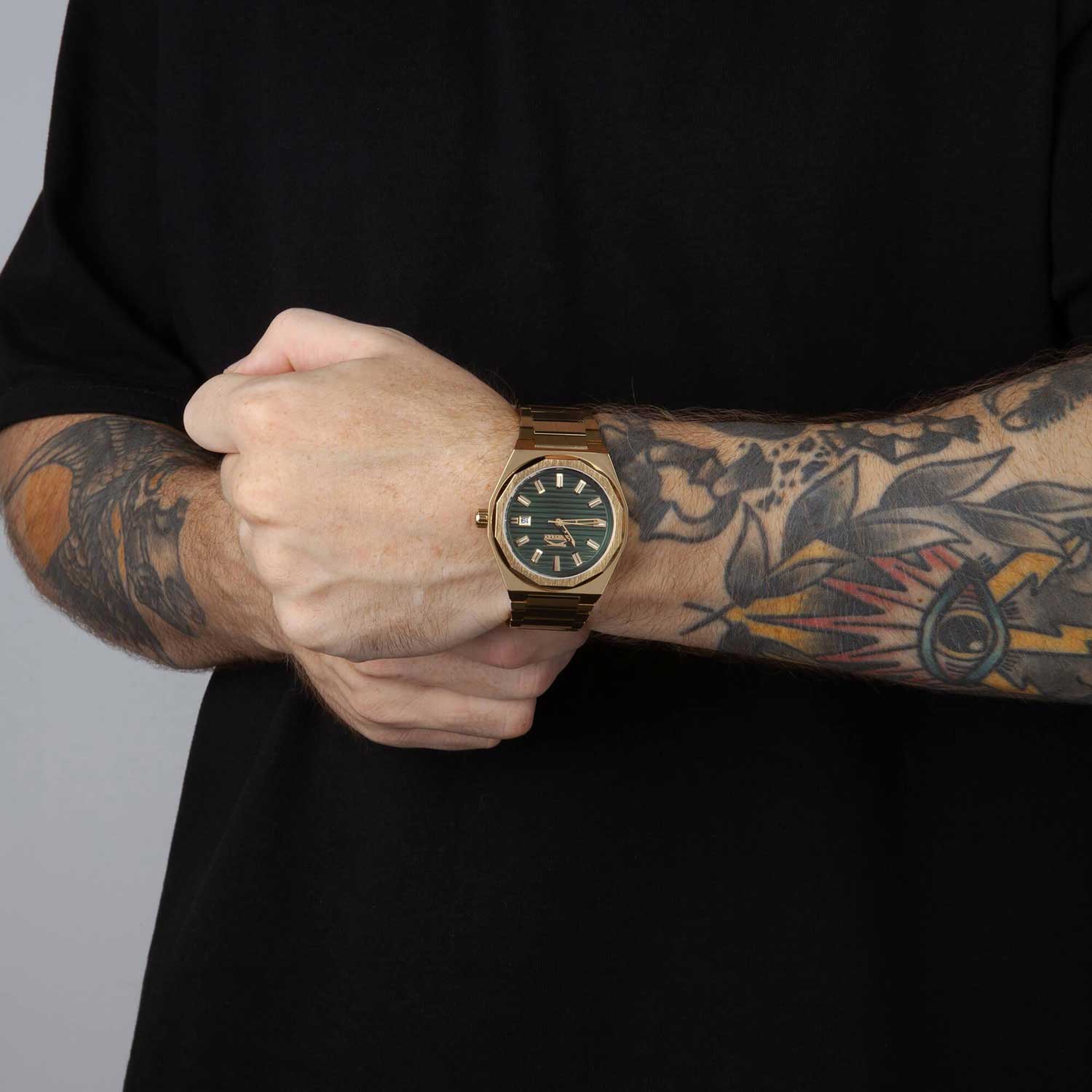 Часы Slazenger SL.09.2143.1.03 воплощают в себе элегантность и практичность, идеально подходящие для современных мужчин. Их зеленый циферблат защищен минеральным стекломМинеральное стеклоМинеральное стекло представляет собой искусственно выращенный минерал кварца. Такое стекло отличается особой устойчивостью к повреждениям и царапинам. Уступает по некоторым качествам сапфировому стеклу. и заключен в золотистый корпус диаметром 41,5 мм, который изготовлен из прочного суперметалла с IP-покрытиемIP-покрытиеМетод ионного напыления. Демонстрирует повышенную устойчивость к истиранию, окислению и химическим веществам. Под воздействием высокого давления и температуры около 1500°C молекулы металла надёжно соединяются с частицами корпуса часов.. Окошко даты расположено в положении 3 часов. Надежный кварцевый механизм обеспечивает точность, а водозащита 5 ATM делает их устойчивыми к воздействию воды. Браслет из суперметалла с IP-покрытиемIP-покрытиеМетод ионного напыления. Демонстрирует повышенную устойчивость к истиранию, окислению и химическим веществам. Под воздействием высокого давления и температуры около 1500°C молекулы металла надёжно соединяются с частицами корпуса часов. имеет раскладную застёжкуРаскладная застёжкаТакой тип застёжки используется только на браслетах из металла. Она никогда не раскрывается полностью, происходит разделение на 2 и более частей. Раскладывающая застёжка снизит вероятность потери часов к минимуму., что подчеркивает современный стиль и позволяет легко снимать часы. Ширина браслета 22-26 мм.