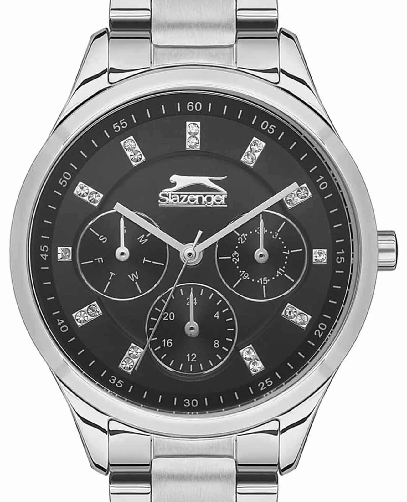 Часы Slazenger SL.09.2151.4.01 — это элегантный аксессуар, который прекрасно дополнит женственный образ. Эти наручные кварцевые часы сочетают в себе стиль и функциональность. Круглый корпус диаметром 35 мм изготовлен из суперметалла, который отличается повышенной прочностью. Черный циферблат выполнен по технологии Sunray, что создает эффект солнечных лучей, и украшен фианитами, придающими часам особую изысканность. На циферблате расположены метки в виде штрихов и точек, а также логотип бренда. Время отображается в 12- и 24-часовом формате, а также предусмотрены отдельные индикаторы для дня недели и числа. Минеральное стеклоМинеральное стеклоМинеральное стекло представляет собой искусственно выращенный минерал кварца. Такое стекло отличается особой устойчивостью к повреждениям и царапинам. Уступает по некоторым качествам сапфировому стеклу. обеспечивает надежную защиту от царапин. Водозащита уровня 30WR позволяет защищать часы от случайных попаданий воды. Металлический браслет с раскладной застёжкойРаскладная застёжкаТакой тип застёжки используется только на браслетах из металла. Она никогда не раскрывается полностью, происходит разделение на 2 и более частей. Раскладывающая застёжка снизит вероятность потери часов к минимуму. гарантирует комфортное ношение и надежную фиксацию на запястье. Рифленая заводная головка добавляет удобства в управлении настройками. Эти часы станут идеальным выбором для тех, кто ценит сочетание классического дизайна и практичности.