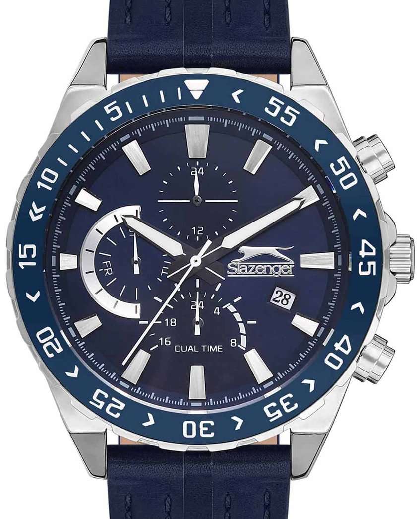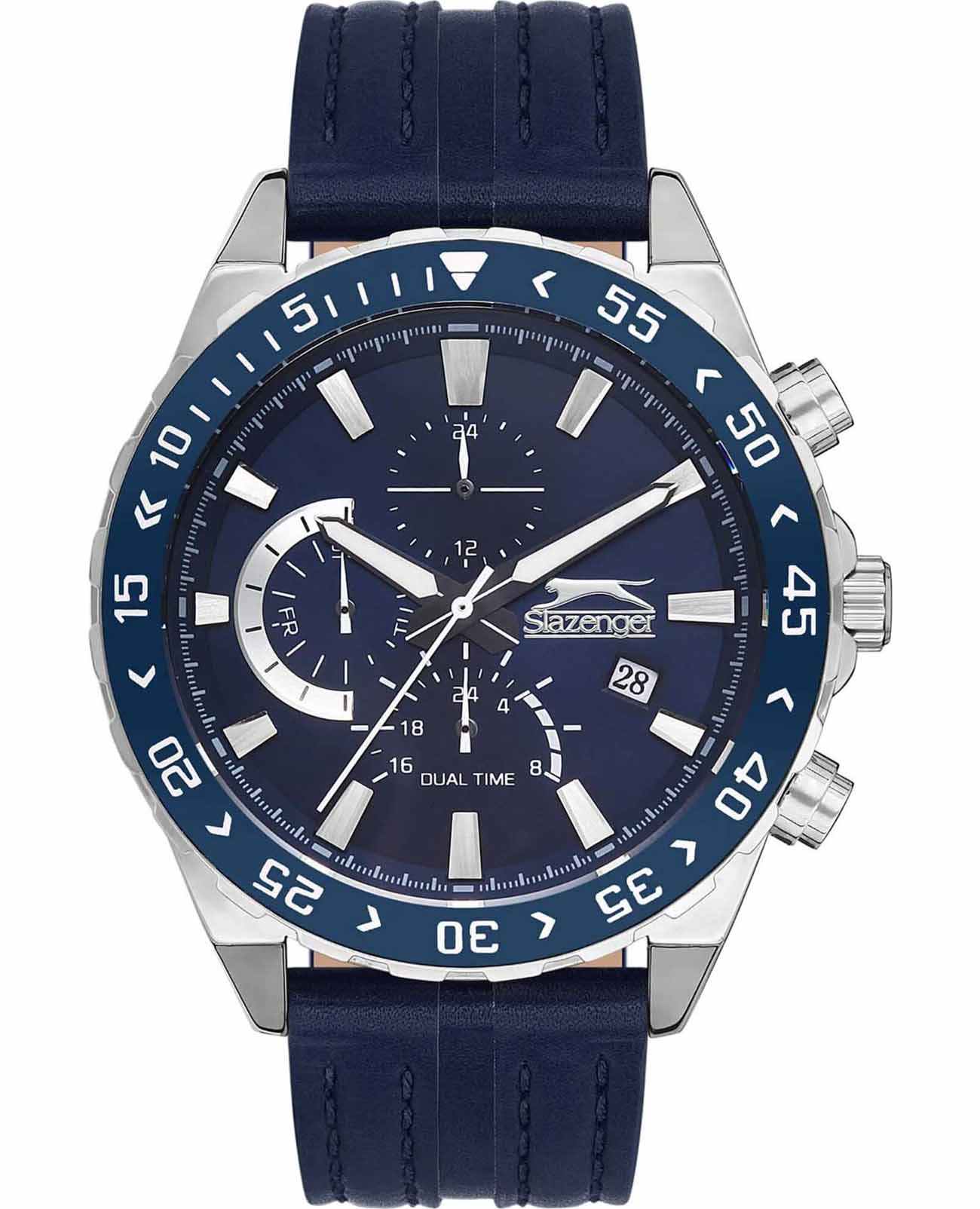 Slazenger SL.09.2152.2.02 – это великолепное сочетание стиля и функциональности, созданное для тех, кто ценит элегантность и надежность. Эти наручные часы работают на кварцевом механизме, обеспечивая точность и долговечность. Корпус выполнен из прочного суперметалла, а безельБезельВнешний ободок, закрепляющий стекло. В спортивных часах так называется поворотное кольцо с делениями на циферблате, выполняет роль таймера – замеряет отрезки времени на шкале. Неподвижный безель – элемент декора. Однонаправленно вращающийся безель на дайверских часах позволяет фиксировать моменты погружения и выныривания на поверхность. из суперметалла с синим IP-покрытиемIP-покрытиеМетод ионного напыления. Демонстрирует повышенную устойчивость к истиранию, окислению и химическим веществам. Под воздействием высокого давления и температуры около 1500°C молекулы металла надёжно соединяются с частицами корпуса часов., что придает часам современный и утонченный вид. Синий циферблат, оформленный в технике Sunray, украшен логотипом бренда и часовыми метками в виде штрихов, что добавляет аксессуару изысканности. Особенностью данной модели является наличие календаря, отображающего дату и день недели, а также возможность следить за временем во втором часовом поясе. Все это удобно размещено на отдельных циферблатах, что делает использование часов максимально комфортным. Рифленая заводная головка снабжена защитой, что обеспечивает дополнительную надежность. Часы также обладают водозащитой на уровне 50WR, что позволяет им выдерживать воздействие воды в повседневных ситуациях. Минеральное стеклоМинеральное стеклоМинеральное стекло представляет собой искусственно выращенный минерал кварца. Такое стекло отличается особой устойчивостью к повреждениям и царапинам. Уступает по некоторым качествам сапфировому стеклу. защищает циферблат от царапин и повреждений, сохраняя его внешний вид безупречным. Люминесцентное покрытиеЛюминесцентное покрытиеПозволяет считывать показания времени в темноте. Производители наносят на стрелки, часовые индексы, безель или поверхность циферблата светонакопительный состав, дающий холодное свечение. на стрелках обеспечивает отличную видимость в темноте. Завершающим штрихом образа является кожаный ремешок с классической застежкой, который обеспечивает удобную посадку на запястье и добавляет модели роскошный акцент.