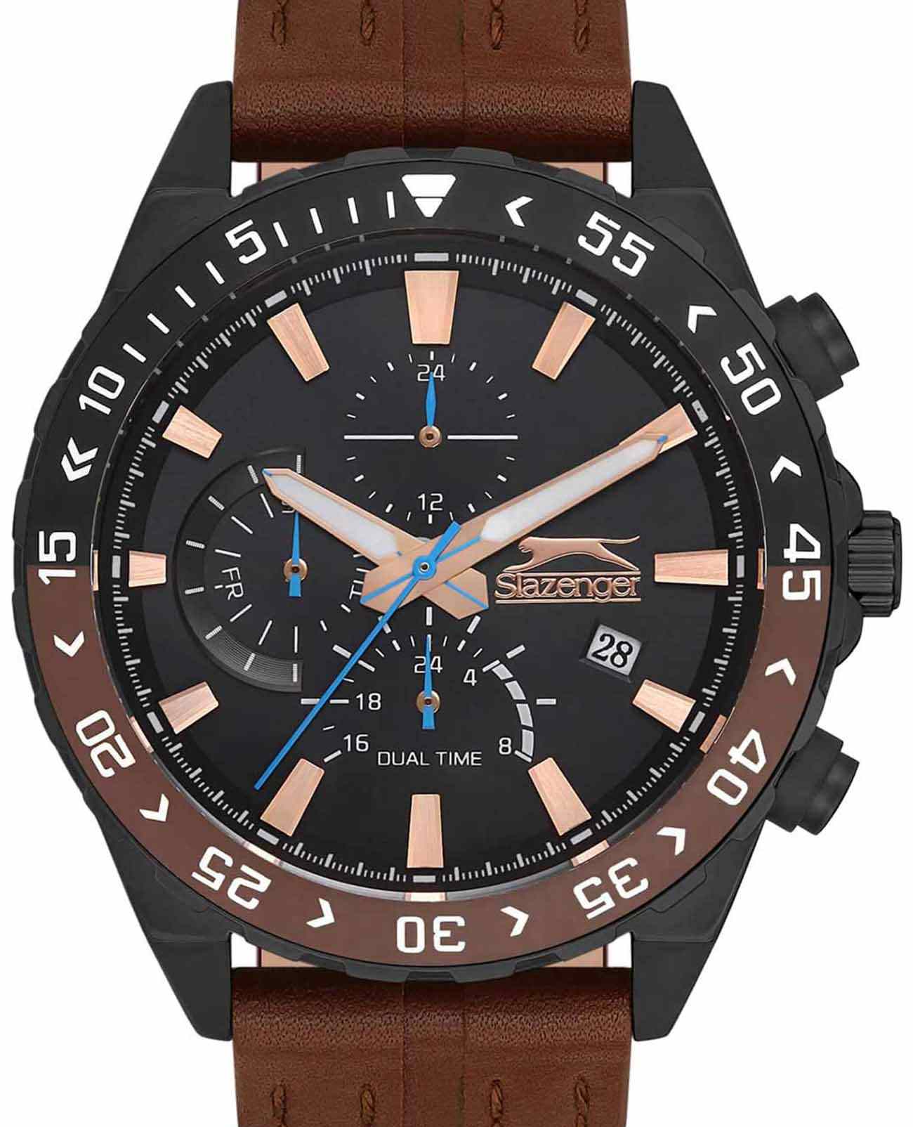 Slazenger SL.09.2152.2.04 – это великолепное сочетание стиля и функциональности, созданное для тех, кто ценит элегантность и надежность. Эти наручные часы работают на кварцевом механизме, обеспечивая точность и долговечность. Корпус выполнен из прочного суперметалла с черным IP-покрытиемIP-покрытиеМетод ионного напыления. Демонстрирует повышенную устойчивость к истиранию, окислению и химическим веществам. Под воздействием высокого давления и температуры около 1500°C молекулы металла надёжно соединяются с частицами корпуса часов., а безельБезельВнешний ободок, закрепляющий стекло. В спортивных часах так называется поворотное кольцо с делениями на циферблате, выполняет роль таймера – замеряет отрезки времени на шкале. Неподвижный безель – элемент декора. Однонаправленно вращающийся безель на дайверских часах позволяет фиксировать моменты погружения и выныривания на поверхность. с черным и коричневым IP-покрытиемIP-покрытиеМетод ионного напыления. Демонстрирует повышенную устойчивость к истиранию, окислению и химическим веществам. Под воздействием высокого давления и температуры около 1500°C молекулы металла надёжно соединяются с частицами корпуса часов., что придает часам современный и утонченный вид. Черный циферблат, оформленный в технике Sunray, украшен логотипом бренда и часовыми метками в виде штрихов, что добавляет аксессуару изысканности. Особенностью данной модели является наличие календаря, отображающего дату и день недели, а также возможность следить за временем во втором часовом поясе. Все это удобно размещено на отдельных циферблатах, что делает использование часов максимально комфортным. Рифленая заводная головка снабжена защитой, что обеспечивает дополнительную надежность. Часы также обладают водозащитой на уровне 50WR, что позволяет им выдерживать воздействие воды в повседневных ситуациях. Минеральное стеклоМинеральное стеклоМинеральное стекло представляет собой искусственно выращенный минерал кварца. Такое стекло отличается особой устойчивостью к повреждениям и царапинам. Уступает по некоторым качествам сапфировому стеклу. защищает циферблат от царапин и повреждений, сохраняя его внешний вид безупречным. Люминесцентное покрытиеЛюминесцентное покрытиеПозволяет считывать показания времени в темноте. Производители наносят на стрелки, часовые индексы, безель или поверхность циферблата светонакопительный состав, дающий холодное свечение. на стрелках обеспечивает отличную видимость в темноте. Завершающим штрихом образа является кожаный ремешок с классической застежкой, который обеспечивает удобную посадку на запястье и добавляет модели роскошный акцент.