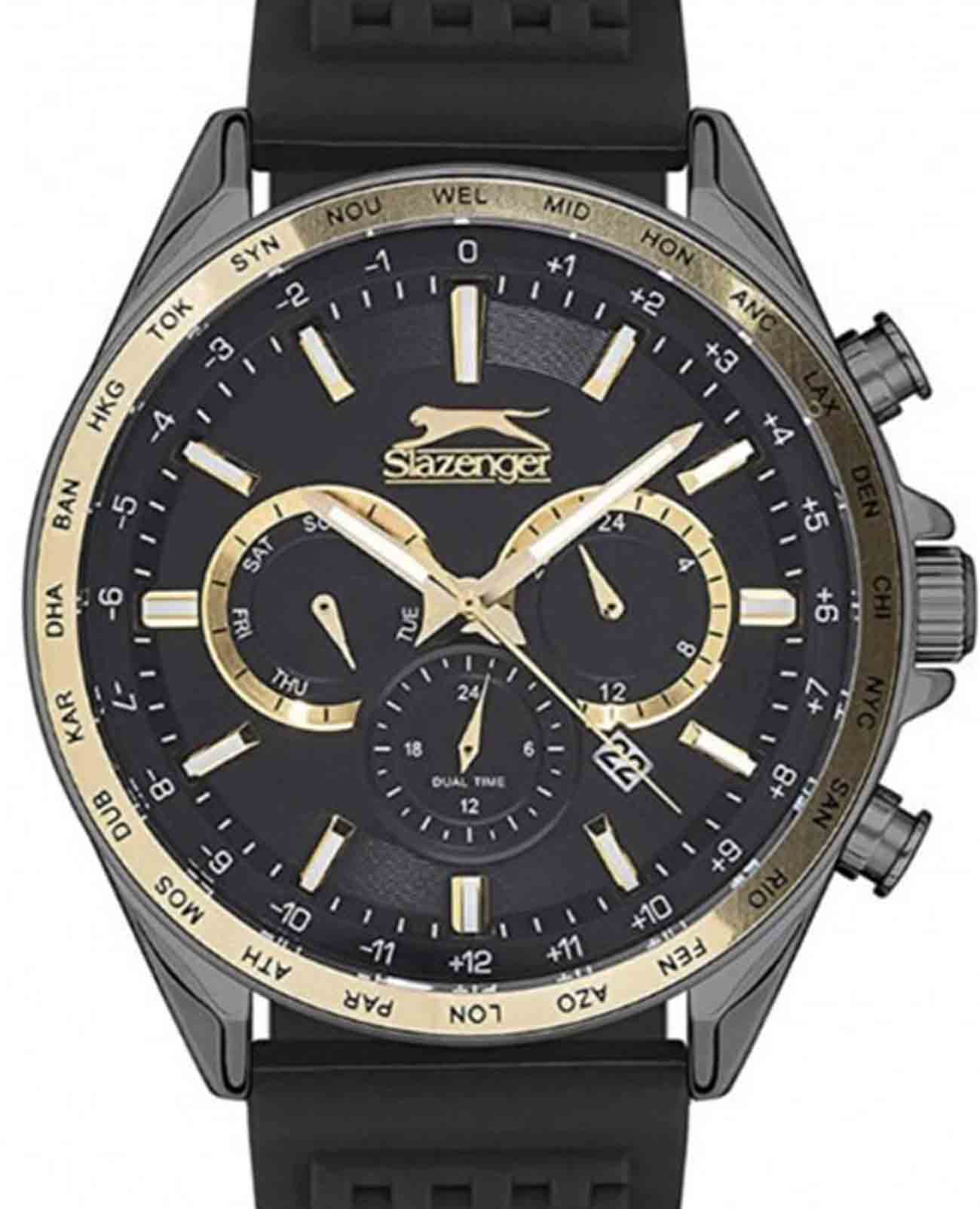 Мужские наручные часы Slazenger SL.09.2179.2.05 — стильный аксессуар с ярко выраженными спортивными чертами, который станет надежным спутником в повседневной жизни. Эти часы оснащены кварцевым механизмом, обеспечивающим высокую точность хода. Металлический корпус с черным IP-покрытиемIP-покрытиеМетод ионного напыления. Демонстрирует повышенную устойчивость к истиранию, окислению и химическим веществам. Под воздействием высокого давления и температуры около 1500°C молекулы металла надёжно соединяются с частицами корпуса часов. в сочетании с черным силиконовый ремешком на классической застежке шириной 22 мм создает гармоничный и современный образ. Диаметр корпуса составляет 45 мм, а толщина — 11 мм, что придает часам стильный и выразительный вид.  БезельБезельВнешний ободок, закрепляющий стекло. В спортивных часах так называется поворотное кольцо с делениями на циферблате, выполняет роль таймера – замеряет отрезки времени на шкале. Неподвижный безель – элемент декора. Однонаправленно вращающийся безель на дайверских часах позволяет фиксировать моменты погружения и выныривания на поверхность. с золотистым IP-покрытиемIP-покрытиеМетод ионного напыления. Демонстрирует повышенную устойчивость к истиранию, окислению и химическим веществам. Под воздействием высокого давления и температуры около 1500°C молекулы металла надёжно соединяются с частицами корпуса часов., что придает ему дополнительную прочность и устойчивость к износу. Минеральное стеклоМинеральное стеклоМинеральное стекло представляет собой искусственно выращенный минерал кварца. Такое стекло отличается особой устойчивостью к повреждениям и царапинам. Уступает по некоторым качествам сапфировому стеклу. защищает циферблат от царапин и внешних воздействий, а водозащита уровня WR 50 позволяет не беспокоиться о случайных контактах с водой, будь то дождь или мытье рук. Особенностью данной модели является наличие календаря, отображающего дату и день недели, а также возможность следить за временем во втором часовом поясе.  Люминесцентное покрытиеЛюминесцентное покрытиеПозволяет считывать показания времени в темноте. Производители наносят на стрелки, часовые индексы, безель или поверхность циферблата светонакопительный состав, дающий холодное свечение. на стрелках и метках обеспечивает отличную видимость в темноте.