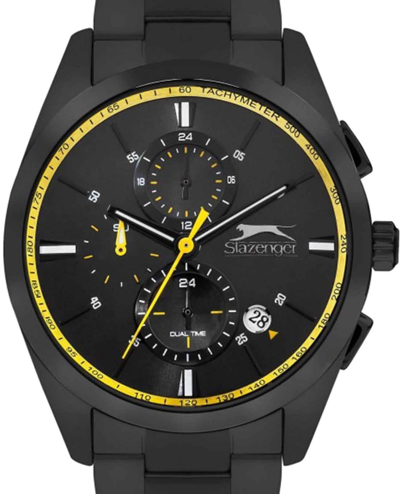 Часы Slazenger SL.09.2215.2.05 представляют собой стильные мужские наручные часы, которые сочетают в себе элегантный дизайн и функциональность. Изготовленные в Англии, эти кварцевые часы оснащены прочным металлическим корпусом и черным металлическим браслетом с раскладной застёжкойРаскладная застёжкаТакой тип застёжки используется только на браслетах из металла. Она никогда не раскрывается полностью, происходит разделение на 2 и более частей. Раскладывающая застёжка снизит вероятность потери часов к минимуму., который обеспечивает надежную фиксацию на запястье, также на них нанесено IP-покрытиеIP-покрытиеМетод ионного напыления. Демонстрирует повышенную устойчивость к истиранию, окислению и химическим веществам. Под воздействием высокого давления и температуры около 1500°C молекулы металла надёжно соединяются с частицами корпуса часов.. Минеральное стеклоМинеральное стеклоМинеральное стекло представляет собой искусственно выращенный минерал кварца. Такое стекло отличается особой устойчивостью к повреждениям и царапинам. Уступает по некоторым качествам сапфировому стеклу. защищает черный циферблат от царапин, а водозащита WR 50 позволяет использовать их в условиях повышенной влажности. Диаметр корпуса составляет 43 мм, а толщина — 14 мм, что делает часы удобными для ежедневного ношения. Ширина ремешка — 22 мм, что обеспечивает комфорт и стильный вид на руке. Дополнительные функции включают отображение второго часового поясаВторой часовой поясФункция, позволяющая отображать время двух часовых поясов одновременно., дня недели и текущего времени в 24-часовом формате, а также наличие окошка даты для удобства пользователя. Стрелки снабжены люминесцентным покрытиемЛюминесцентное покрытиеПозволяет считывать показания времени в темноте. Производители наносят на стрелки, часовые индексы, безель или поверхность циферблата светонакопительный состав, дающий холодное свечение., что позволяет легко считывать время в темноте. Часы также оснащены тахиметромТахиметрРазмеченная шкала, располагается на ободке или безеле часов. Тахиметр позволяет рассчитать скорость на определённом участке пути, расстояние измеряется в километрах или милях., что добавляет им функциональности и может быть полезно для измерения скорости.