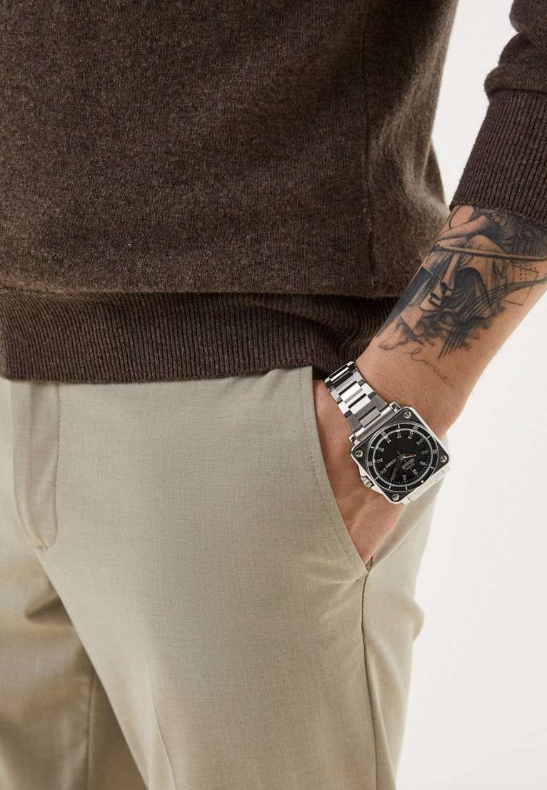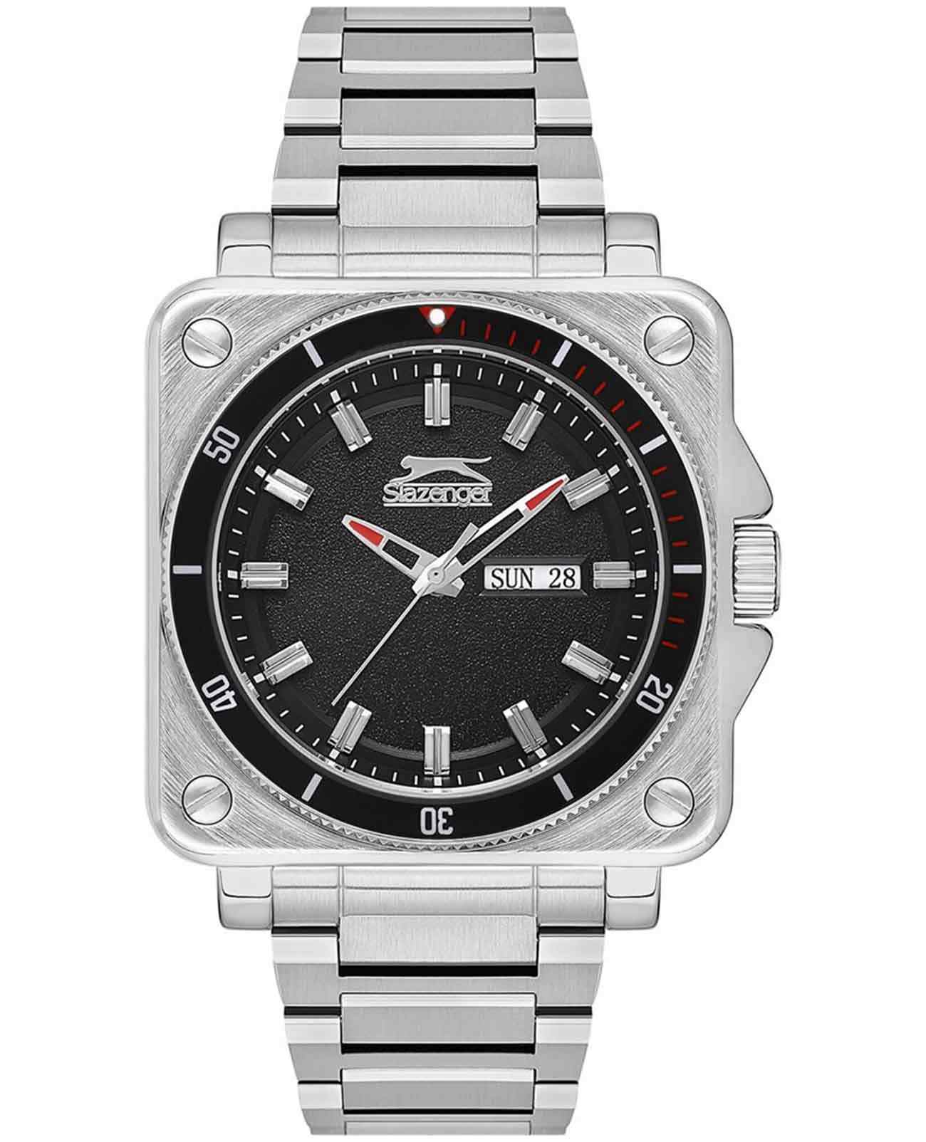 Часы Slazenger SL.09.2232.1.01 — это современная модель, сочетающая стиль и практичность. Корпус квадратной формы выполнен из прочного металла, а круглый черный циферблат придает дизайну особую выразительность. На вращающийся безельБезельВнешний ободок, закрепляющий стекло. В спортивных часах так называется поворотное кольцо с делениями на циферблате, выполняет роль таймера – замеряет отрезки времени на шкале. Неподвижный безель – элемент декора. Однонаправленно вращающийся безель на дайверских часах позволяет фиксировать моменты погружения и выныривания на поверхность. нанесено черное IP-покрытиеIP-покрытиеМетод ионного напыления. Демонстрирует повышенную устойчивость к истиранию, окислению и химическим веществам. Под воздействием высокого давления и температуры около 1500°C молекулы металла надёжно соединяются с частицами корпуса часов.. Серебристый металлический браслет снабжен надежной раскладной застёжкойРаскладная застёжкаТакой тип застёжки используется только на браслетах из металла. Она никогда не раскрывается полностью, происходит разделение на 2 и более частей. Раскладывающая застёжка снизит вероятность потери часов к минимуму., обеспечивающей удобство при повседневном ношении. Модель оснащена кварцевым механизмом, минеральное стеклоМинеральное стеклоМинеральное стекло представляет собой искусственно выращенный минерал кварца. Такое стекло отличается особой устойчивостью к повреждениям и царапинам. Уступает по некоторым качествам сапфировому стеклу., защищающим от случайных повреждений, и водозащитой уровня WR 50, позволяющей не бояться контакта с водой в повседневных ситуациях. На циферблате расположены окошки даты и дня недели. Для удобства использования в темное время суток предусмотрено люминесцентное покрытиеЛюминесцентное покрытиеПозволяет считывать показания времени в темноте. Производители наносят на стрелки, часовые индексы, безель или поверхность циферблата светонакопительный состав, дающий холодное свечение. стрелок. Заводная головка дополнительно защищена от случайных нажатий. Габариты корпуса составляют 43 на 43 мм, толщина — 11 мм.