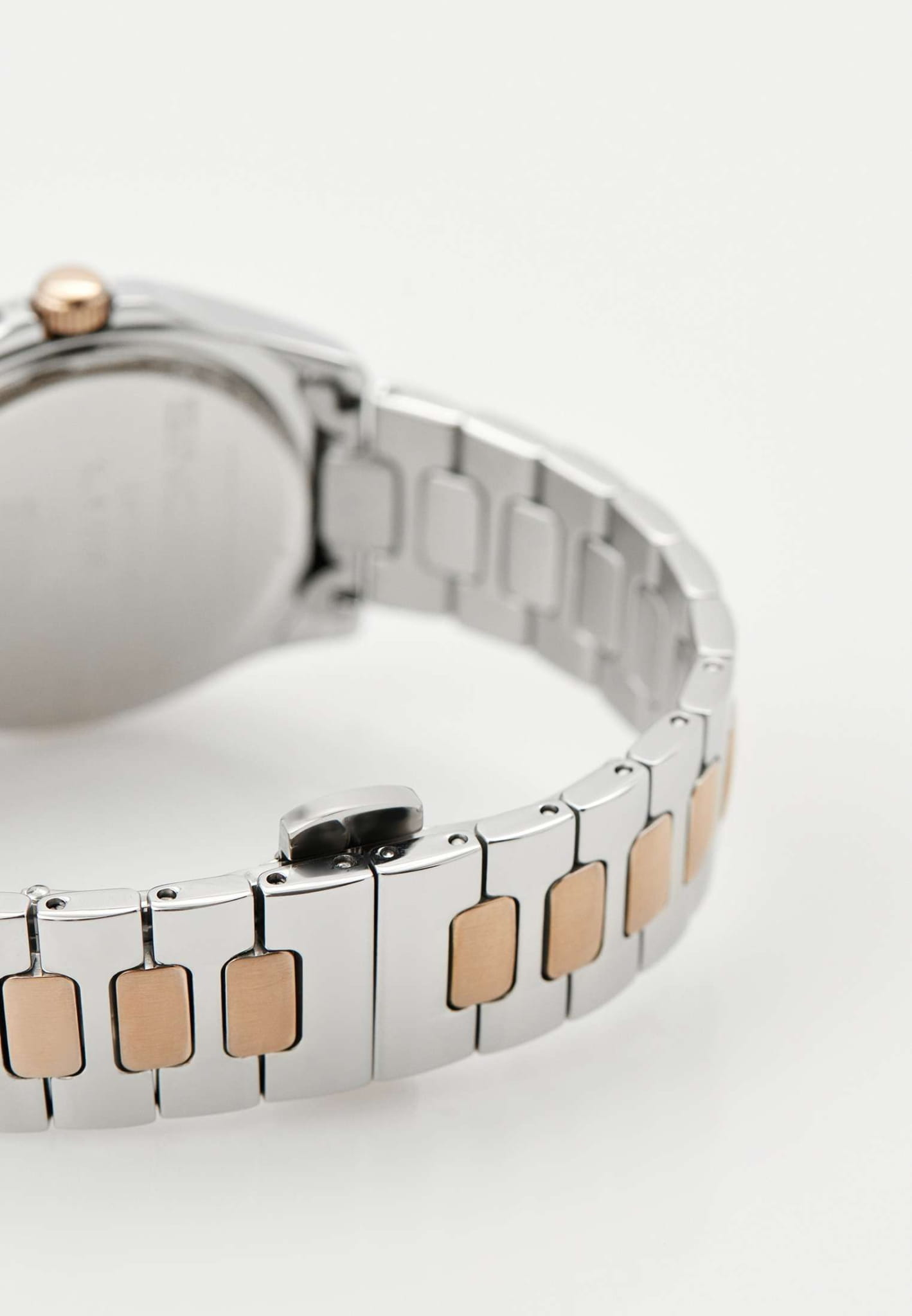Часы Slazenger SL.09.2238.3.05 – это изысканный аксессуар, который станет стильным акцентом любого образа. Модель оснащена надежным кварцевым механизмом. Корпус из прочного металла размером 34х34 мм украшен россыпью сверкающих фианитов по безелюБезельВнешний ободок, закрепляющий стекло. В спортивных часах так называется поворотное кольцо с делениями на циферблате, выполняет роль таймера – замеряет отрезки времени на шкале. Неподвижный безель – элемент декора. Однонаправленно вращающийся безель на дайверских часах позволяет фиксировать моменты погружения и выныривания на поверхность., который к тому же с розово-золотистым IP-покрытиемIP-покрытиеМетод ионного напыления. Демонстрирует повышенную устойчивость к истиранию, окислению и химическим веществам. Под воздействием высокого давления и температуры около 1500°C молекулы металла надёжно соединяются с частицами корпуса часов., что придает часам особое сияние и элегантность. Белый перламутровый циферблат с логотипом бренда защищен стойким к царапинам минеральным стекломМинеральное стеклоМинеральное стекло представляет собой искусственно выращенный минерал кварца. Такое стекло отличается особой устойчивостью к повреждениям и царапинам. Уступает по некоторым качествам сапфировому стеклу.. Четкие часовые метки в виде лаконичных штрихов и крупная арабская цифра 12 обеспечивают удобство чтения времени. Заводная головка с рифлением дополнена защитой для повышения долговечности. Металлический браслет с частичным розово-золотистым IP-покрытиемIP-покрытиеМетод ионного напыления. Демонстрирует повышенную устойчивость к истиранию, окислению и химическим веществам. Под воздействием высокого давления и температуры около 1500°C молекулы металла надёжно соединяются с частицами корпуса часов. шириной 18 мм надежно фиксируется на запястье с помощью застежки «бабочка»Застёжка "бабочка"Такой вид застёжки дополняется предохранителями, помогающими избежать случайного раскрытия браслета. Обладают изящным исполнением. . Для удобства использования в темное время суток предусмотрено люминесцентное покрытиеЛюминесцентное покрытиеПозволяет считывать показания времени в темноте. Производители наносят на стрелки, часовые индексы, безель или поверхность циферблата светонакопительный состав, дающий холодное свечение. стрелок. Водозащита 30WR позволяет не беспокоиться о случайных брызгах. Вес изделия составляет 92 грамма, что делает часы комфортными для ежедневного ношения. Эти часы идеально подойдут для тех, кто ценит гармонию стиля, качества и функциональности.