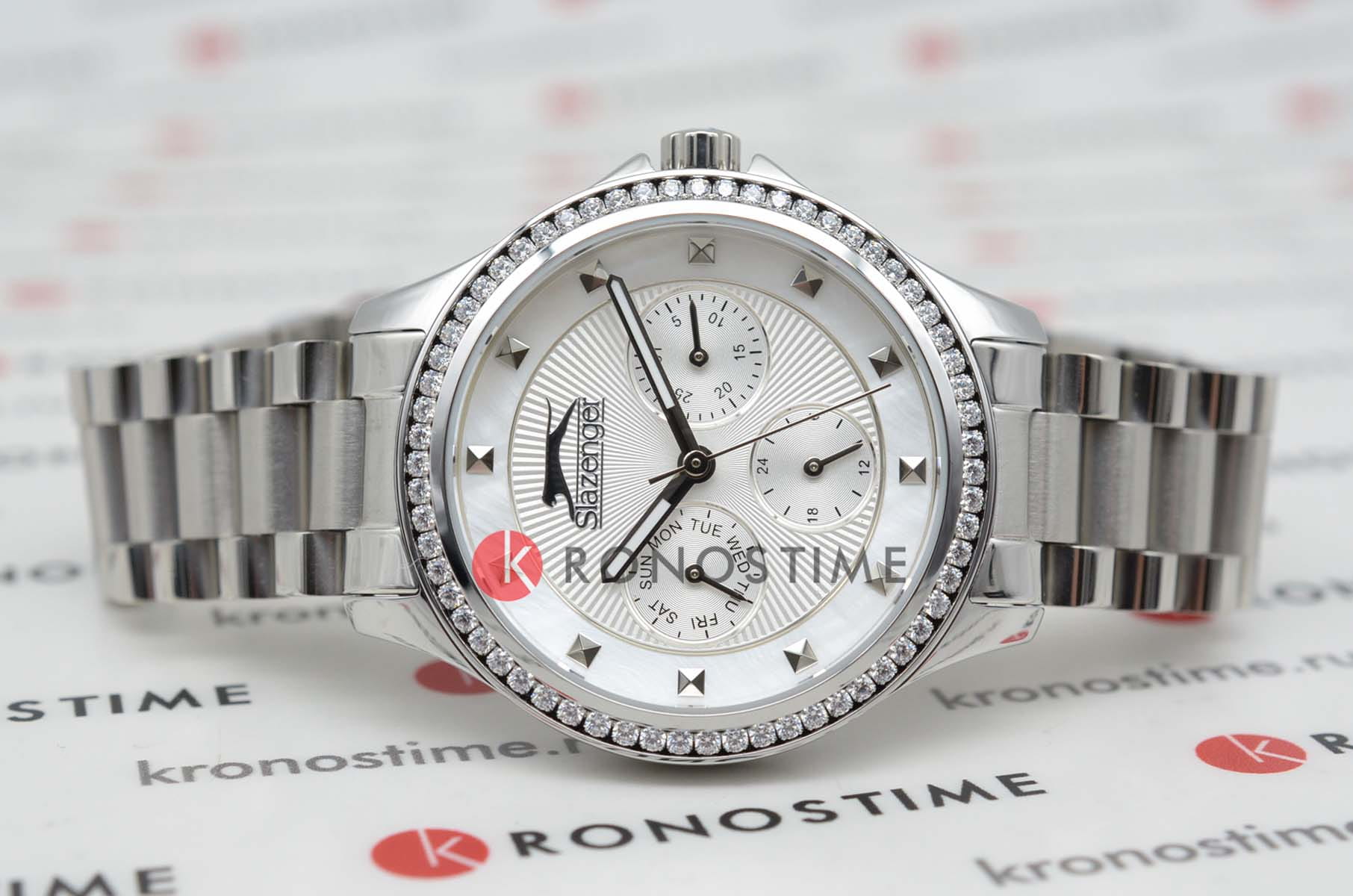 Эти женские часы Slazenger SL.09.2241.4.01 выполнены в современном стиле и станет элегантным дополнением к любому образу. Корпус и браслет изготовлены из прочного металла серебристого цвета, безельБезельВнешний ободок, закрепляющий стекло. В спортивных часах так называется поворотное кольцо с делениями на циферблате, выполняет роль таймера – замеряет отрезки времени на шкале. Неподвижный безель – элемент декора. Однонаправленно вращающийся безель на дайверских часах позволяет фиксировать моменты погружения и выныривания на поверхность. украшен изящными кристаллами, которые придают часам особую привлекательность. На циферблате расположены дополнительные малые циферблаты для отображения даты, дня недели и времени в 24-часовом формате, что делает их функциональными и удобными для ежедневного использования. Минеральное стеклоМинеральное стеклоМинеральное стекло представляет собой искусственно выращенный минерал кварца. Такое стекло отличается особой устойчивостью к повреждениям и царапинам. Уступает по некоторым качествам сапфировому стеклу. надежно защищает циферблат от царапин, а водозащита уровня WR 30 предохраняет механизм от случайных брызг воды. Заводная головка оснащена защитой, а стрелки имеют подсветку для легкого считывания времени в темноте. Диаметр корпуса составляет 34 мм, ширина браслета — 16 мм, толщина корпуса — 9 мм. Часы фиксируются на руке с помощью удобной раскладной застёжкиРаскладная застёжкаТакой тип застёжки используется только на браслетах из металла. Она никогда не раскрывается полностью, происходит разделение на 2 и более частей. Раскладывающая застёжка снизит вероятность потери часов к минимуму.. Вес изделия подобран для комфортной ежедневной носки. Для удобства использования в темное время суток предусмотрено люминесцентное покрытиеЛюминесцентное покрытиеПозволяет считывать показания времени в темноте. Производители наносят на стрелки, часовые индексы, безель или поверхность циферблата светонакопительный состав, дающий холодное свечение. стрелок.