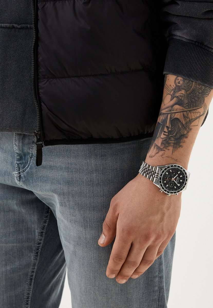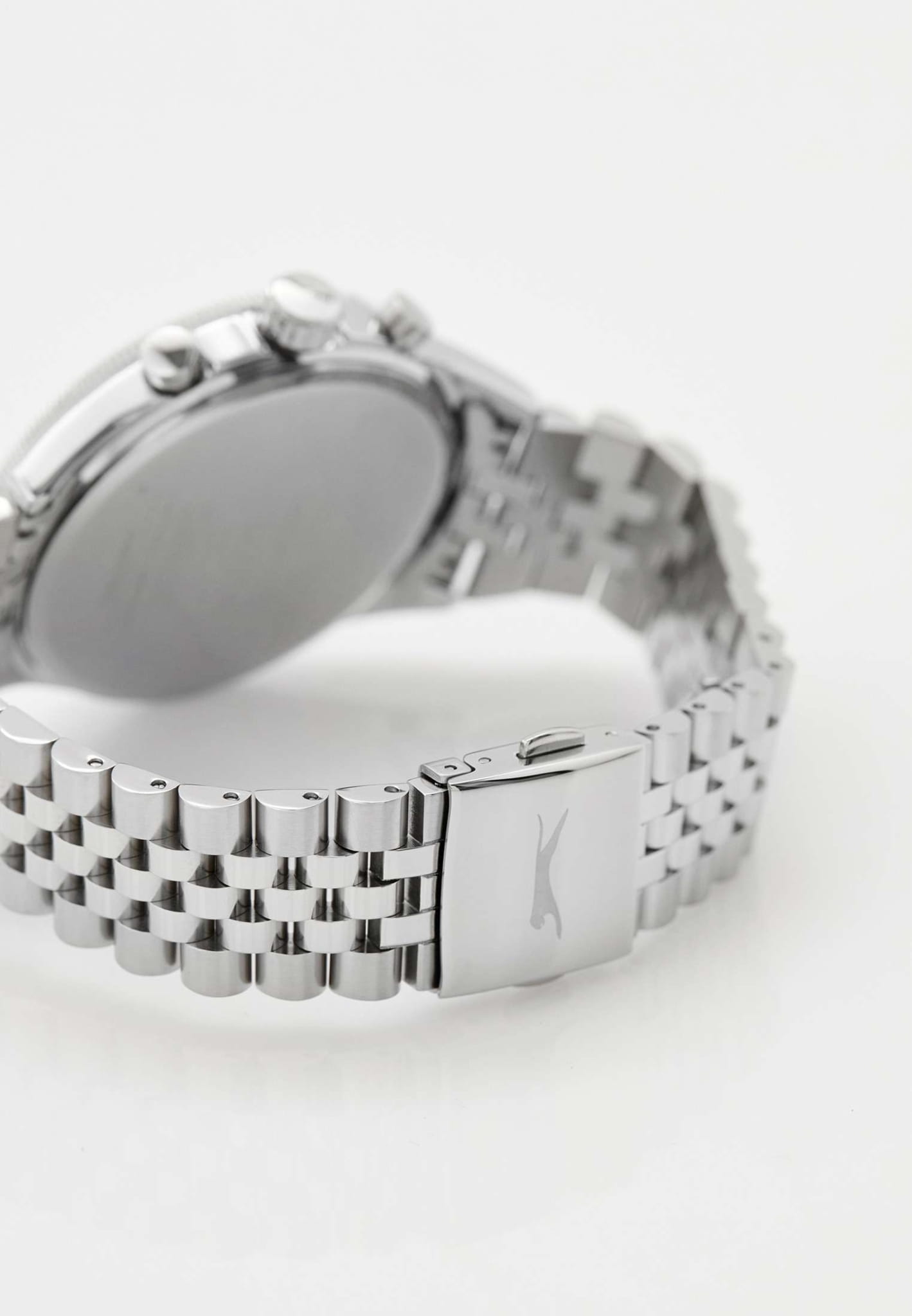 Часы Slazenger SL.09.2248.2.01 — это современная модель с выразительным спортивным характером, идеально подходящая для активного образа жизни. Корпус выполнен из прочного металла, черный циферблат защищён минеральным стекломМинеральное стеклоМинеральное стекло представляет собой искусственно выращенный минерал кварца. Такое стекло отличается особой устойчивостью к повреждениям и царапинам. Уступает по некоторым качествам сапфировому стеклу., устойчивым к царапинам. Часы также оснащены шкалой тахиметраТахиметрРазмеченная шкала, располагается на ободке или безеле часов. Тахиметр позволяет рассчитать скорость на определённом участке пути, расстояние измеряется в километрах или милях., что добавляет им функциональности и может быть полезно для измерения скорости.  На безельБезельВнешний ободок, закрепляющий стекло. В спортивных часах так называется поворотное кольцо с делениями на циферблате, выполняет роль таймера – замеряет отрезки времени на шкале. Неподвижный безель – элемент декора. Однонаправленно вращающийся безель на дайверских часах позволяет фиксировать моменты погружения и выныривания на поверхность. нанесено черное IP-покрытиеIP-покрытиеМетод ионного напыления. Демонстрирует повышенную устойчивость к истиранию, окислению и химическим веществам. Под воздействием высокого давления и температуры около 1500°C молекулы металла надёжно соединяются с частицами корпуса часов..  Диаметр корпуса составляет 46 мм, толщина — 11 мм, а ширина браслета — 22 мм.  Часы оснащены металлическим браслетом с надежной раскладной застёжкойРаскладная застёжкаТакой тип застёжки используется только на браслетах из металла. Она никогда не раскрывается полностью, происходит разделение на 2 и более частей. Раскладывающая застёжка снизит вероятность потери часов к минимуму., благодаря чему часы удобно сидят на руке и не вызывают дискомфорта даже при длительном ношении. Вес модели составляет 130 грамм. Надёжный кварцевый механизм обеспечивает точность времени, а уровень водозащиты WR 50 позволяет использовать часы в повседневных условиях, не опасаясь случайных брызг или дождя. Для удобства использования в темное время суток предусмотрено люминесцентное покрытиеЛюминесцентное покрытиеПозволяет считывать показания времени в темноте. Производители наносят на стрелки, часовые индексы, безель или поверхность циферблата светонакопительный состав, дающий холодное свечение. стрелок и меток. Дополнительные малые циферблаты показывают дату, день недели и текущее время в 24-часовом формате, что делает использование часов ещё более удобным и функциональным.