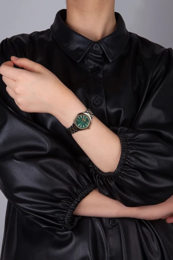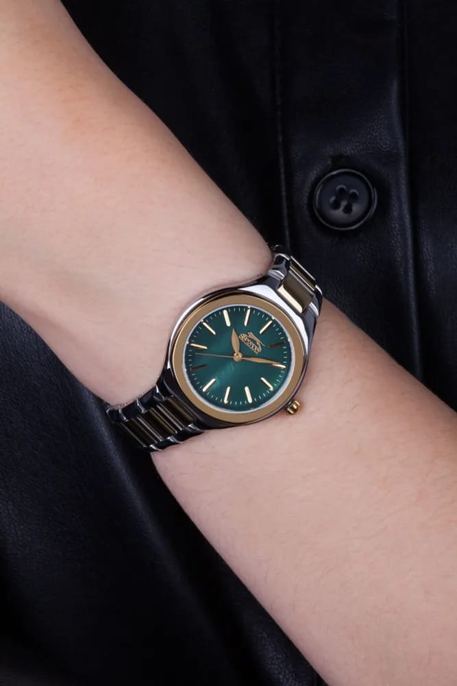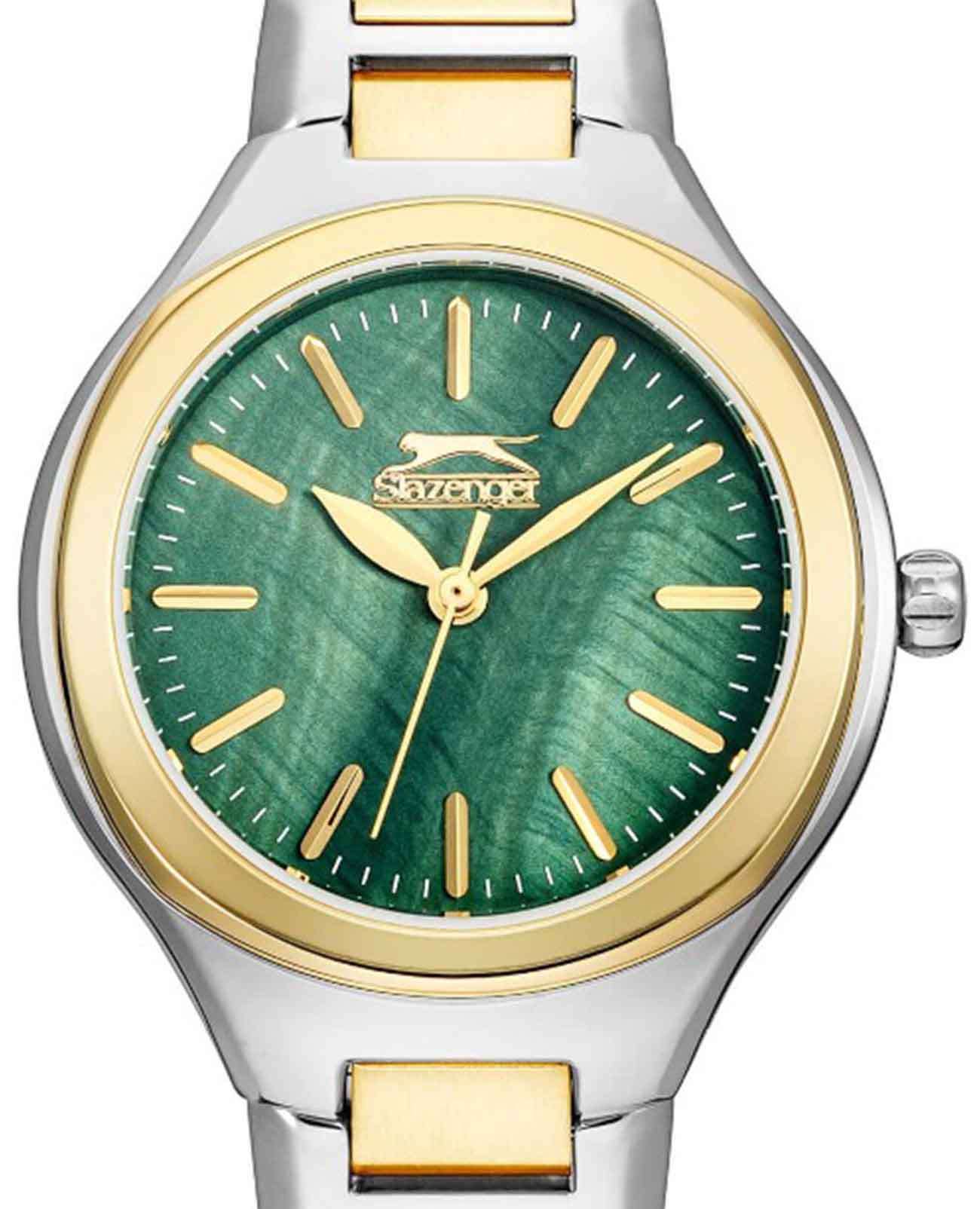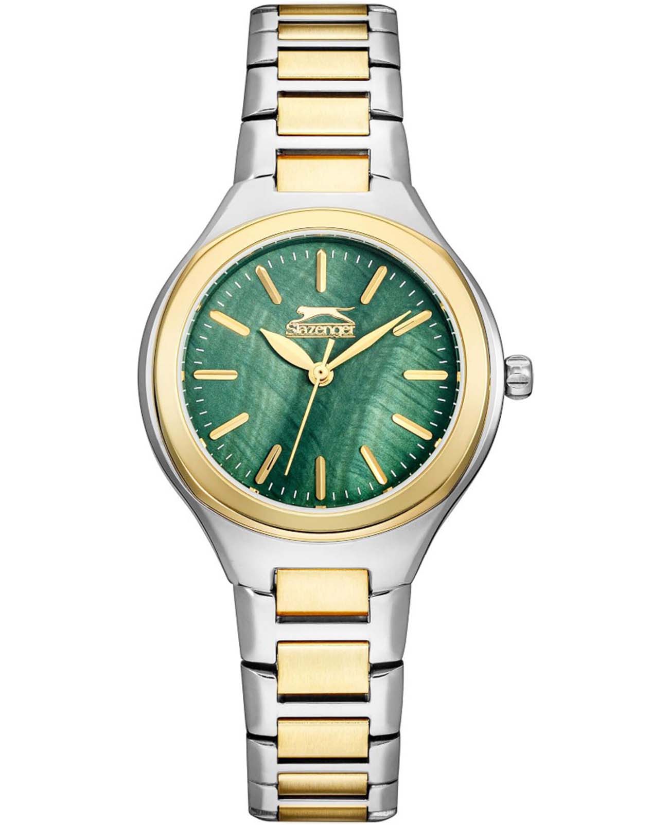 Часы Slazenger SL.09.2254.3.08 — это стильный и надежный аксессуар, который подчеркнет ваш индивидуальный образ. Корпус и браслет выполнены из инновационного суперметалла — сплава на основе меди с пониженным содержанием цинка и никеля, обладающего особой прочностью и долговечностью благодаря специальной технологии покрытия, а на безельБезельВнешний ободок, закрепляющий стекло. В спортивных часах так называется поворотное кольцо с делениями на циферблате, выполняет роль таймера – замеряет отрезки времени на шкале. Неподвижный безель – элемент декора. Однонаправленно вращающийся безель на дайверских часах позволяет фиксировать моменты погружения и выныривания на поверхность. нанесено золотистое IP-покрытиеIP-покрытиеМетод ионного напыления. Демонстрирует повышенную устойчивость к истиранию, окислению и химическим веществам. Под воздействием высокого давления и температуры около 1500°C молекулы металла надёжно соединяются с частицами корпуса часов.. Модель оснащена точным кварцевым механизмом, который обеспечивает стабильную работу и не требует ежедневного завода. Под прочным минеральным стекломМинеральное стеклоМинеральное стекло представляет собой искусственно выращенный минерал кварца. Такое стекло отличается особой устойчивостью к повреждениям и царапинам. Уступает по некоторым качествам сапфировому стеклу. расположен лаконичный перламутровый зеленый циферблат, придающий часам элегантный и современный вид. Стальной браслет с частичным золотистым IP-покрытиемIP-покрытиеМетод ионного напыления. Демонстрирует повышенную устойчивость к истиранию, окислению и химическим веществам. Под воздействием высокого давления и температуры около 1500°C молекулы металла надёжно соединяются с частицами корпуса часов. с раскладной застёжкойРаскладная застёжкаТакой тип застёжки используется только на браслетах из металла. Она никогда не раскрывается полностью, происходит разделение на 2 и более частей. Раскладывающая застёжка снизит вероятность потери часов к минимуму. обеспечивает комфортную посадку. Диаметр корпуса составляет 32 мм, толщина — 8 мм, что делает часы аккуратными и удобными для повседневного ношения. Класс водозащиты 3 атмосферы защищает механизм от случайных брызг и капель дождя.