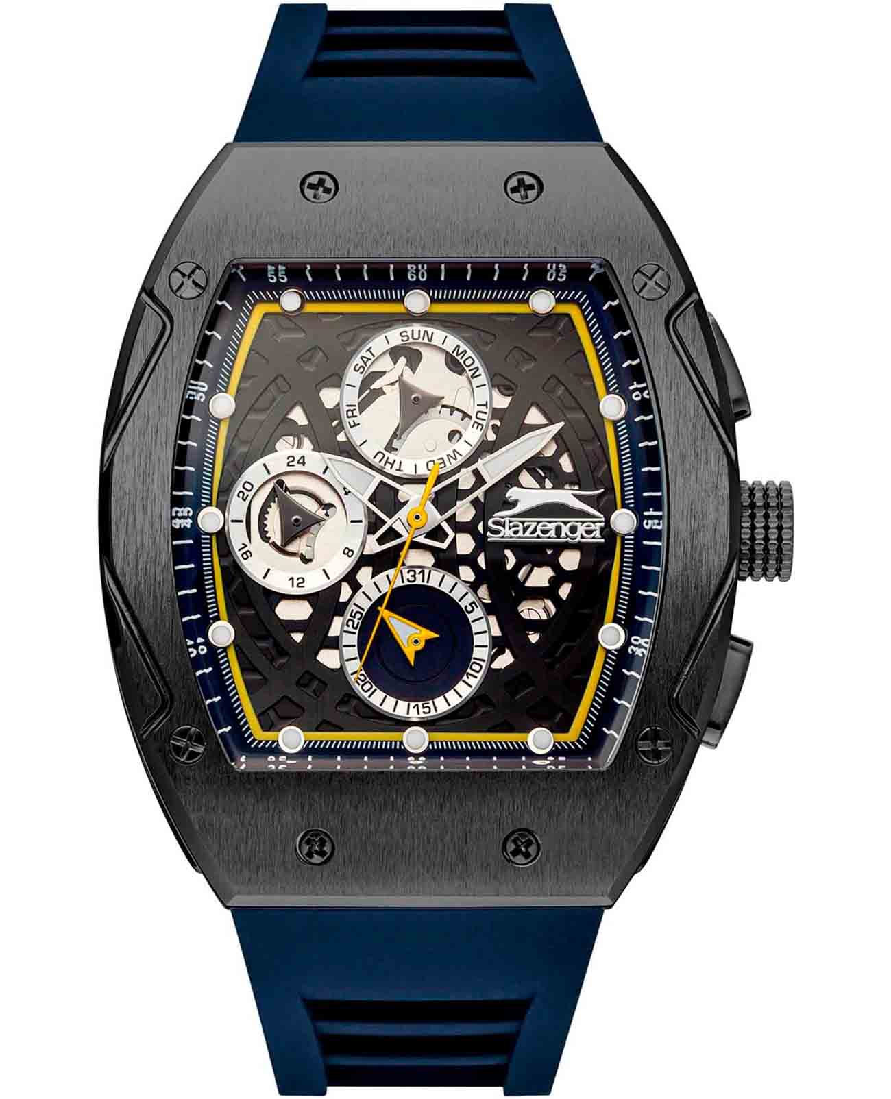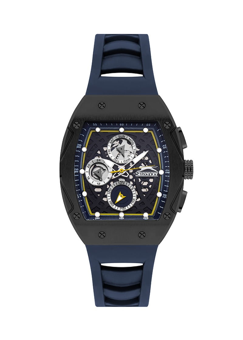Часы Slazenger SL.09.2257.2.03 — это современная модель, сочетающая стильный внешний вид и функциональность. Крупный корпус размером 44х53 мм выполнен из металла с прочным черным IP-покрытиемIP-покрытиеМетод ионного напыления. Демонстрирует повышенную устойчивость к истиранию, окислению и химическим веществам. Под воздействием высокого давления и температуры около 1500°C молекулы металла надёжно соединяются с частицами корпуса часов., что придает часам выразительный характер и надежную защиту от внешних воздействий. Сатинированный безельБезельВнешний ободок, закрепляющий стекло. В спортивных часах так называется поворотное кольцо с делениями на циферблате, выполняет роль таймера – замеряет отрезки времени на шкале. Неподвижный безель – элемент декора. Однонаправленно вращающийся безель на дайверских часах позволяет фиксировать моменты погружения и выныривания на поверхность. гармонично сочетается с черным циферблатом, украшенным логотипом бренда и аккуратными часовыми метками в виде точек. Минеральное стеклоМинеральное стеклоМинеральное стекло представляет собой искусственно выращенный минерал кварца. Такое стекло отличается особой устойчивостью к повреждениям и царапинам. Уступает по некоторым качествам сапфировому стеклу. обеспечивает защиту от случайных царапин, а стрелки и метки с люминесцентным покрытиемЛюминесцентное покрытиеПозволяет считывать показания времени в темноте. Производители наносят на стрелки, часовые индексы, безель или поверхность циферблата светонакопительный состав, дающий холодное свечение. удобно подсвечиваются в темноте после зарядки на свету. На циферблате расположены отдельные индикаторы даты, дня недели, а также 12- и 24-часового формата времени. За точность хода отвечает кварцевый механизм, не требующий ежедневного завода. Модель снабжена синим силиконовым ремешком шириной 26 мм с классической застежкой, который комфортно фиксируется на запястье и подходит для активного образа жизни. Водозащита 50WR позволяет не снимать часы при мытье рук или во время прогулок под дождем.