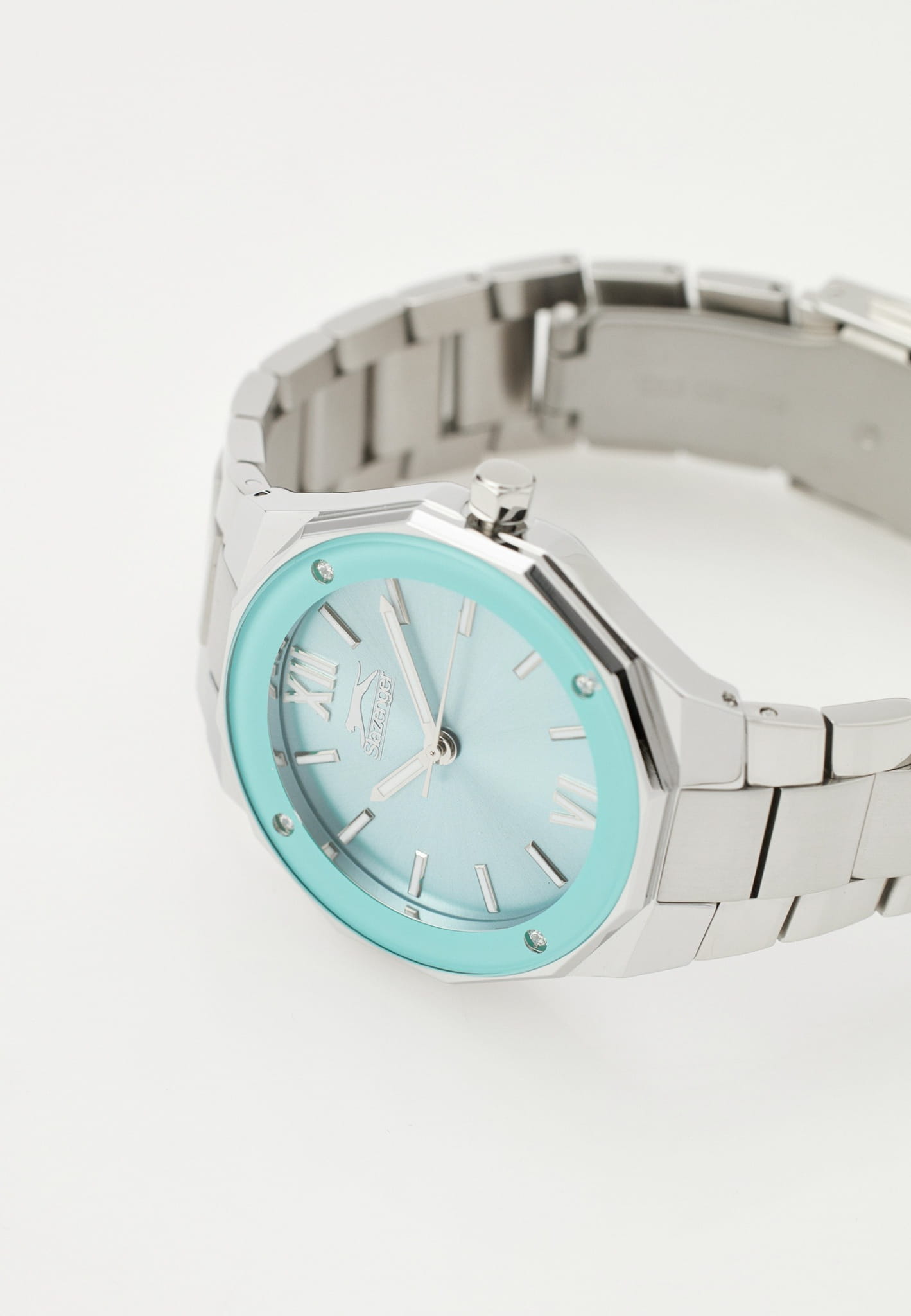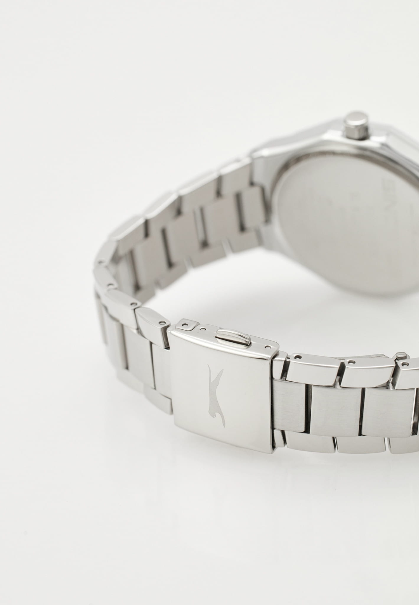 Часы Slazenger SL.09.2258.3.05 — это изысканный аксессуар, который гармонично подчеркнёт ваш индивидуальный стиль. Корпус и браслет выполнены из инновационного суперметалла — сплава на основе меди с пониженным содержанием цинка и никеля, обладающего специальным защитным покрытием, а циферблат украшен 4 кристаллами. Надёжный кварцевый механизм обеспечивает точный ход, а прочное минеральное стеклоМинеральное стеклоМинеральное стекло представляет собой искусственно выращенный минерал кварца. Такое стекло отличается особой устойчивостью к повреждениям и царапинам. Уступает по некоторым качествам сапфировому стеклу. устойчиво к царапинам и защищает серебристый циферблат от внешних воздействий. Диаметр корпуса составляет 38 мм, толщина — всего 8 мм, что делает модель элегантной и удобной для ежедневного ношения. Водонепроницаемость до 3 бар позволяет не беспокоиться о случайных брызгах или каплях дождя. Стрелки с люминесцентным покрытиемЛюминесцентное покрытиеПозволяет считывать показания времени в темноте. Производители наносят на стрелки, часовые индексы, безель или поверхность циферблата светонакопительный состав, дающий холодное свечение. удобно подсвечиваются в темноте после зарядки на свету. Стальной браслет с раскладной застёжкойРаскладная застёжкаТакой тип застёжки используется только на браслетах из металла. Она никогда не раскрывается полностью, происходит разделение на 2 и более частей. Раскладывающая застёжка снизит вероятность потери часов к минимуму. обеспечивает комфортную посадку. Часы станут отличным выбором как для повседневной жизни, так и для особых случаев, а также послужат прекрасным подарком на любой праздник.