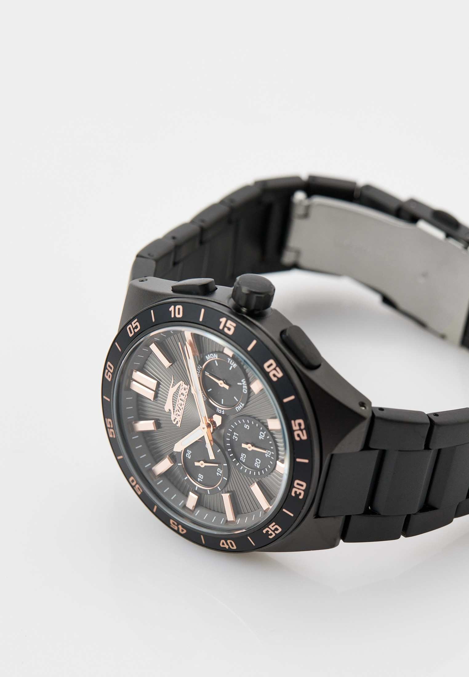 Часы Slazenger SL.09.2285.2.05 — это стильное решение для тех, кто ценит сочетание выразительного дизайна и функциональности. Модель оснащена надежным кварцевым механизмом, который заключен в прочный корпус диаметром 45 мм и толщиной 13 мм, выполненный из суперметалла с черным IP-покрытиемIP-покрытиеМетод ионного напыления. Демонстрирует повышенную устойчивость к истиранию, окислению и химическим веществам. Под воздействием высокого давления и температуры около 1500°C молекулы металла надёжно соединяются с частицами корпуса часов. — современного сплава на основе меди с пониженным содержанием цинка и никеля, обладающего высокой прочностью и устойчивостью к износу, а на безельБезельВнешний ободок, закрепляющий стекло. В спортивных часах так называется поворотное кольцо с делениями на циферблате, выполняет роль таймера – замеряет отрезки времени на шкале. Неподвижный безель – элемент декора. Однонаправленно вращающийся безель на дайверских часах позволяет фиксировать моменты погружения и выныривания на поверхность. нанесено черное IP-покрытиеIP-покрытиеМетод ионного напыления. Демонстрирует повышенную устойчивость к истиранию, окислению и химическим веществам. Под воздействием высокого давления и температуры около 1500°C молекулы металла надёжно соединяются с частицами корпуса часов. и секундная шкала. Минеральное стеклоМинеральное стеклоМинеральное стекло представляет собой искусственно выращенный минерал кварца. Такое стекло отличается особой устойчивостью к повреждениям и царапинам. Уступает по некоторым качествам сапфировому стеклу. защищает черный циферблат от царапин и повреждений. Часы оснащены дополнительными циферблатами для отображения 24-часового времени, даты и дня недели, что делает использование еще более удобным. Браслет также выполнен из суперметалла с черным IP-покрытиемIP-покрытиеМетод ионного напыления. Демонстрирует повышенную устойчивость к истиранию, окислению и химическим веществам. Под воздействием высокого давления и температуры около 1500°C молекулы металла надёжно соединяются с частицами корпуса часов. и с раскладной застёжкойРаскладная застёжкаТакой тип застёжки используется только на браслетах из металла. Она никогда не раскрывается полностью, происходит разделение на 2 и более частей. Раскладывающая застёжка снизит вероятность потери часов к минимуму. и гармонично дополняет общий облик аксессуара. Циферблат оснащён люминесцентным покрытиемЛюминесцентное покрытиеПозволяет считывать показания времени в темноте. Производители наносят на стрелки, часовые индексы, безель или поверхность циферблата светонакопительный состав, дающий холодное свечение. стрелок и меток, что позволяет легко определять время даже в условиях плохой освещенности. Класс водозащиты 5 АТМ позволяет не бояться случайных брызг и дождя, а гарантия 12 месяцев подтверждает высокое качество изделия.