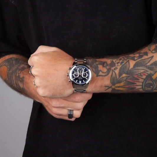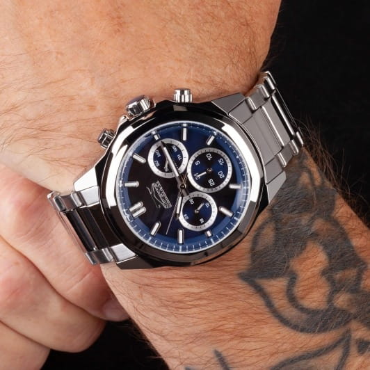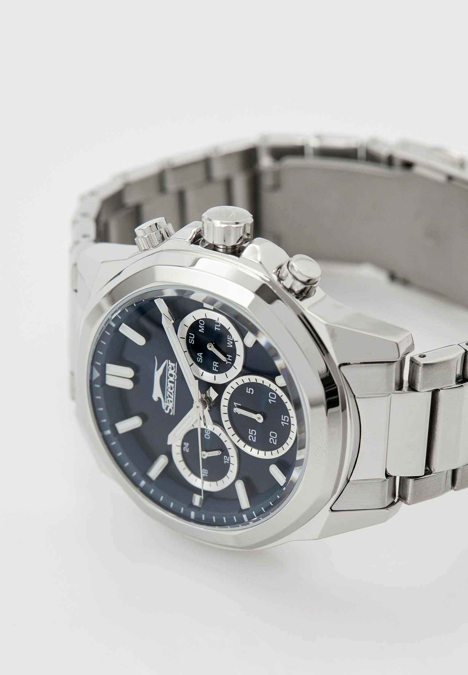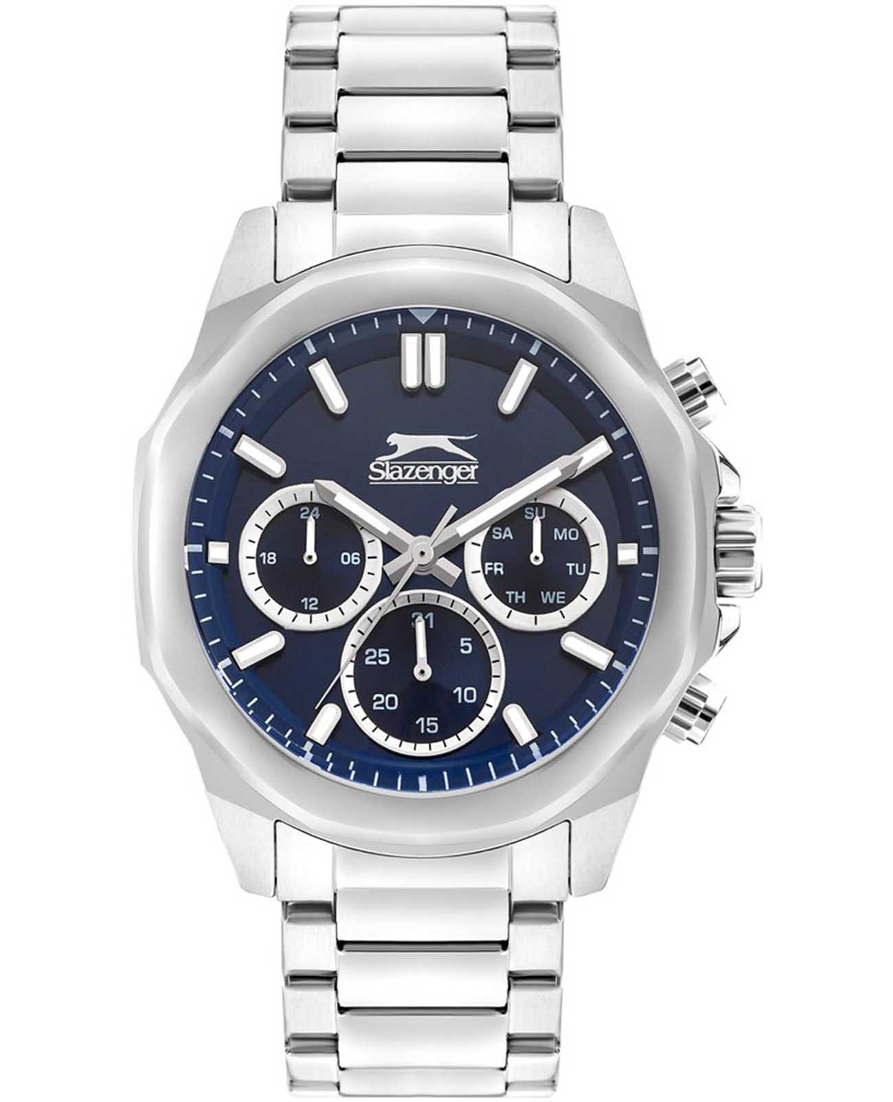 Часы Slazenger SL.09.2289.2.06 — это сочетание современного дизайна и функциональности, идеально подходящее для тех, кто ценит стиль и надежность. Корпус и браслет выполнены из прочного суперметалла, что придаёт модели солидный и эффектный вид. Синий циферблат с лаконичными отметками и фирменным логотипом защищён устойчивым к царапинам минеральным стекломМинеральное стеклоМинеральное стекло представляет собой искусственно выращенный минерал кварца. Такое стекло отличается особой устойчивостью к повреждениям и царапинам. Уступает по некоторым качествам сапфировому стеклу.. Дополнительные функции включают отображение даты и дня недели, а также 12- и 24-часовой формат времени на отдельных мини-циферблатах, что делает использование часов максимально удобным. Заводная головка оснащена защитой, а надёжная раскладная застёжкаРаскладная застёжкаТакой тип застёжки используется только на браслетах из металла. Она никогда не раскрывается полностью, происходит разделение на 2 и более частей. Раскладывающая застёжка снизит вероятность потери часов к минимуму. обеспечивает комфортную посадку на запястье. Особое внимание привлекает восьмигранный безельБезельВнешний ободок, закрепляющий стекло. В спортивных часах так называется поворотное кольцо с делениями на циферблате, выполняет роль таймера – замеряет отрезки времени на шкале. Неподвижный безель – элемент декора. Однонаправленно вращающийся безель на дайверских часах позволяет фиксировать моменты погружения и выныривания на поверхность.. Циферблат оснащён люминесцентным покрытиемЛюминесцентное покрытиеПозволяет считывать показания времени в темноте. Производители наносят на стрелки, часовые индексы, безель или поверхность циферблата светонакопительный состав, дающий холодное свечение. стрелок и меток, что позволяет легко определять время даже в условиях плохой освещенности. Водозащита 50WR позволяет не беспокоиться о случайных брызгах и дождевых каплях. Диаметр корпуса составляет 46 мм, толщина — 14 мм, вес — 165 г, благодаря чему часы выглядят внушительно и подчёркивают индивидуальный стиль владельца. Эта модель станет отличным акцентом в вашем образе и подчеркнёт вашу уверенность в любой ситуации.