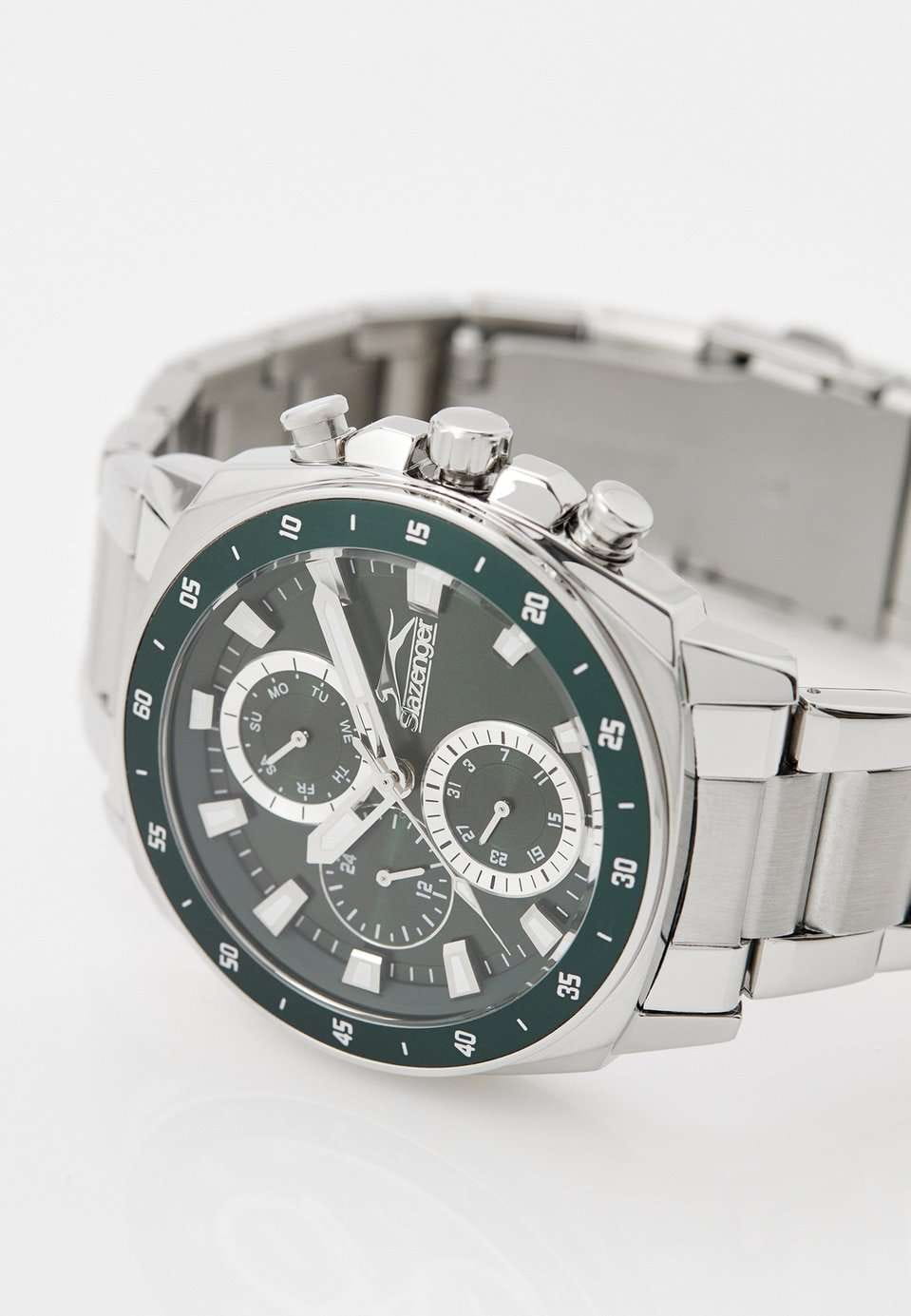 Slazenger SL.09.2292.2.03 — это стильные наручные часы, выполненные в современном дизайне и отлично подходящие для повседневного использования. Корпус диаметром 45 мм изготовлен из прочного металла и дополнен минеральным стекломМинеральное стеклоМинеральное стекло представляет собой искусственно выращенный минерал кварца. Такое стекло отличается особой устойчивостью к повреждениям и царапинам. Уступает по некоторым качествам сапфировому стеклу., которое защищает зеленый циферблат. Серебристый металлический браслет шириной 24 мм оснащён надежной раскладной застёжкойРаскладная застёжкаТакой тип застёжки используется только на браслетах из металла. Она никогда не раскрывается полностью, происходит разделение на 2 и более частей. Раскладывающая застёжка снизит вероятность потери часов к минимуму., которая обеспечивает комфортную посадку на руке. Кварцевый механизм гарантирует точный ход, а водозащита уровня WR 50 позволяет не снимать часы во время мытья рук или под дождём. Модель оснащена люминесцентным покрытиемЛюминесцентное покрытиеПозволяет считывать показания времени в темноте. Производители наносят на стрелки, часовые индексы, безель или поверхность циферблата светонакопительный состав, дающий холодное свечение. стрелок и меток, что облегчает считывание времени в темноте. Дополнительные малые циферблаты отображают дату, день недели и текущее время в 24-часовом формате. Часы также оснащены заводной головкой с защитой и безелемБезельВнешний ободок, закрепляющий стекло. В спортивных часах так называется поворотное кольцо с делениями на циферблате, выполняет роль таймера – замеряет отрезки времени на шкале. Неподвижный безель – элемент декора. Однонаправленно вращающийся безель на дайверских часах позволяет фиксировать моменты погружения и выныривания на поверхность. с зеленым IP-покрытиемIP-покрытиеМетод ионного напыления. Демонстрирует повышенную устойчивость к истиранию, окислению и химическим веществам. Под воздействием высокого давления и температуры около 1500°C молекулы металла надёжно соединяются с частицами корпуса часов. и секундной разметкой. Вес изделия составляет 173 грамма.