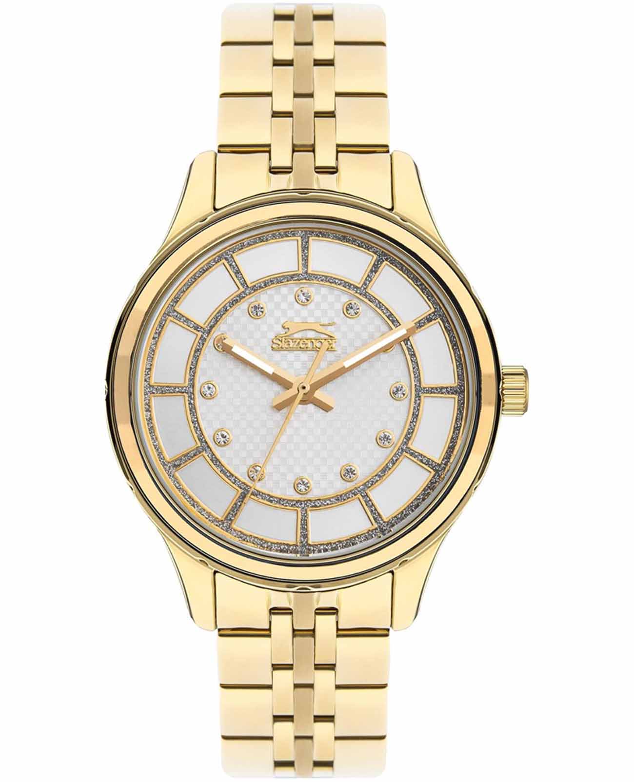 Женские наручные часы Slazenger SL.09.2295.3.06 — это элегантный аксессуар, который подчеркнет утончённый стиль своей обладательницы. Корпус диаметром 36 мм и толщиной 11,5 мм выполнен из прочного металла с золотистым IP-покрытиемIP-покрытиеМетод ионного напыления. Демонстрирует повышенную устойчивость к истиранию, окислению и химическим веществам. Под воздействием высокого давления и температуры около 1500°C молекулы металла надёжно соединяются с частицами корпуса часов. и надёжно защищён минеральным стекломМинеральное стеклоМинеральное стекло представляет собой искусственно выращенный минерал кварца. Такое стекло отличается особой устойчивостью к повреждениям и царапинам. Уступает по некоторым качествам сапфировому стеклу., устойчивым к царапинам. Серебристый циферблат украшен изящными кристаллами, придающими часам особый блеск и изысканность. Модель оснащена люминесцентным покрытиемЛюминесцентное покрытиеПозволяет считывать показания времени в темноте. Производители наносят на стрелки, часовые индексы, безель или поверхность циферблата светонакопительный состав, дающий холодное свечение. стрелок, что облегчает считывание времени в темноте. Особое внимание привлекает безельБезельВнешний ободок, закрепляющий стекло. В спортивных часах так называется поворотное кольцо с делениями на циферблате, выполняет роль таймера – замеряет отрезки времени на шкале. Неподвижный безель – элемент декора. Однонаправленно вращающийся безель на дайверских часах позволяет фиксировать моменты погружения и выныривания на поверхность. с золотистым IP-покрытиемIP-покрытиеМетод ионного напыления. Демонстрирует повышенную устойчивость к истиранию, окислению и химическим веществам. Под воздействием высокого давления и температуры около 1500°C молекулы металла надёжно соединяются с частицами корпуса часов.. Металлический браслет с золотистым IP-покрытиемIP-покрытиеМетод ионного напыления. Демонстрирует повышенную устойчивость к истиранию, окислению и химическим веществам. Под воздействием высокого давления и температуры около 1500°C молекулы металла надёжно соединяются с частицами корпуса часов. шириной 16 мм оснащён удобной раскладной застёжкойРаскладная застёжкаТакой тип застёжки используется только на браслетах из металла. Она никогда не раскрывается полностью, происходит разделение на 2 и более частей. Раскладывающая застёжка снизит вероятность потери часов к минимуму. для комфортной посадки на запястье. Кварцевый механизм обеспечивает точность хода, а водозащита уровня WR 30 защищает часы от случайных брызг. Для удобства в условиях плохой освещённости предусмотрена подсветка стрелок. Вес изделия составляет 95 граммов.