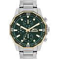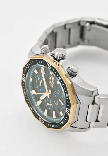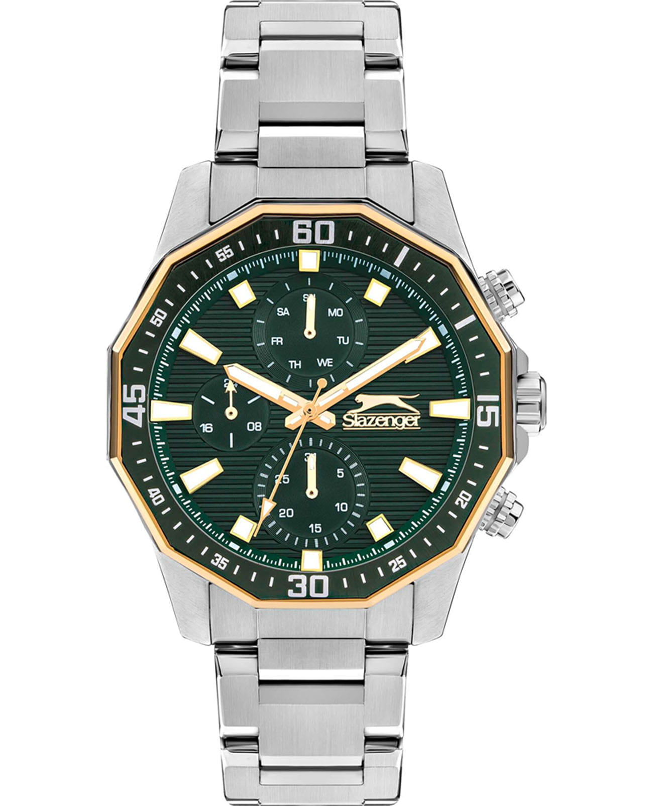 Мужские кварцевые часы Slazenger SL.09.2297.2.07 — это выразительный и функциональный аксессуар, сочетающий прочность, стиль и насыщенную комплектацию. Корпус из суперметалла защищён минеральным стекломМинеральное стеклоМинеральное стекло представляет собой искусственно выращенный минерал кварца. Такое стекло отличается особой устойчивостью к повреждениям и царапинам. Уступает по некоторым качествам сапфировому стеклу.. Циферблат зелёного цвета оформлен с вынесенными индикаторами: даты, дня недели и 24-часового формата времени. Стрелки и метки покрыты люминесцентным покрытиемЛюминесцентное покрытиеПозволяет считывать показания времени в темноте. Производители наносят на стрелки, часовые индексы, безель или поверхность циферблата светонакопительный состав, дающий холодное свечение., что обеспечивает хорошую читаемость в темноте. Браслет выполнен из суперметалла с раскладной застёжкойРаскладная застёжкаТакой тип застёжки используется только на браслетах из металла. Она никогда не раскрывается полностью, происходит разделение на 2 и более частей. Раскладывающая застёжка снизит вероятность потери часов к минимуму., обеспечивая надёжность и комфорт ношения. Водонепроницаемость 50 м позволяет использовать часы в повседневных условиях, защищая от случайных брызг и капель дождя. Модель подчёркивает индивидуальность и уверенность владельца, оставаясь универсальным выбором для повседневного и торжественного образа.