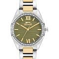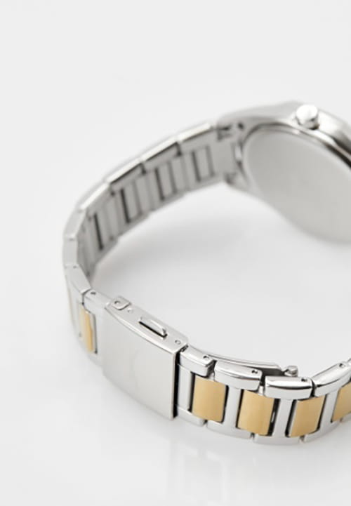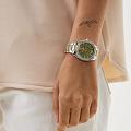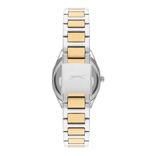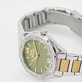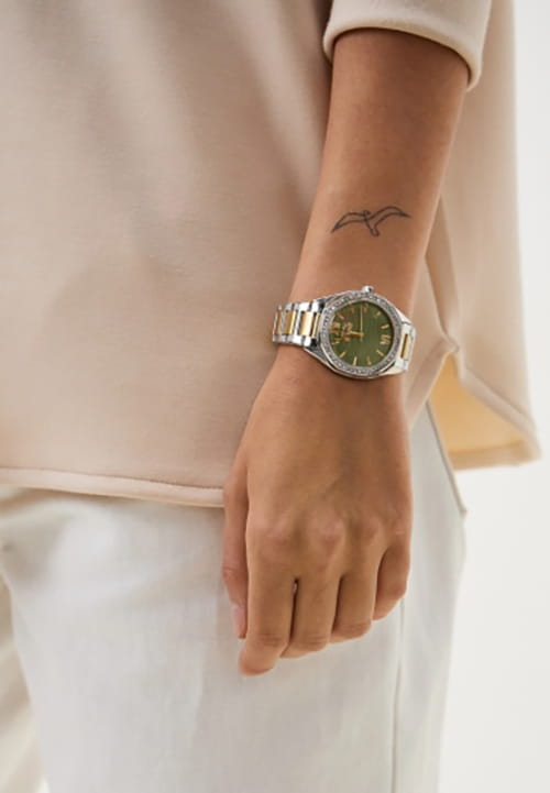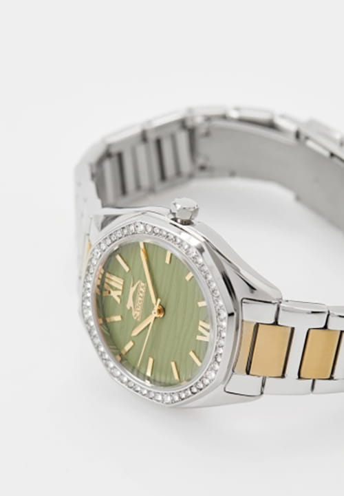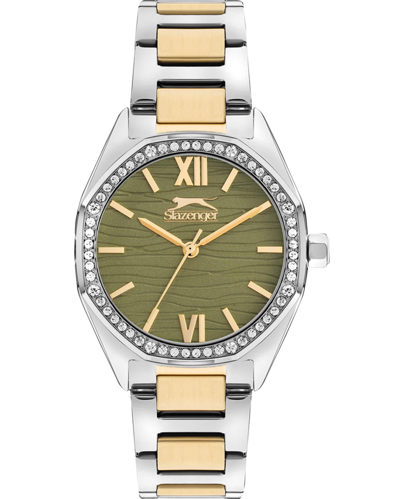 Женские кварцевые часы Slazenger SL.09.2301.3.10 — это элегантный и изысканный аксессуар, подчеркивающий стиль и утончённость. Корпус из суперметалла, браслет из суперметалла с IP-покрытиемIP-покрытиеМетод ионного напыления. Демонстрирует повышенную устойчивость к истиранию, окислению и химическим веществам. Под воздействием высокого давления и температуры около 1500°C молекулы металла надёжно соединяются с частицами корпуса часов., защищён минеральным стекломМинеральное стеклоМинеральное стекло представляет собой искусственно выращенный минерал кварца. Такое стекло отличается особой устойчивостью к повреждениям и царапинам. Уступает по некоторым качествам сапфировому стеклу.. Циферблат зелёного цвета с волнистым рельефным рисунком оформлен штриховыми метками и римскими цифрами VI и XII, дополнен логотипом бренда. Безель гранёный, украшен паве из фианитов, придающих модели изысканное сияние. Заводная головка — граненая, добавляющая детали дизайна. Браслет фиксируется на раскладной застёжкеРаскладная застёжкаТакой тип застёжки используется только на браслетах из металла. Она никогда не раскрывается полностью, происходит разделение на 2 и более частей. Раскладывающая застёжка снизит вероятность потери часов к минимуму., обеспечивая надёжность и комфорт ношения. Водонепроницаемость 30 м позволяет использовать часы в повседневных условиях, защищая от случайных брызг и капель дождя. Модель идеально подходит как для повседневного, так и для торжественного образа.