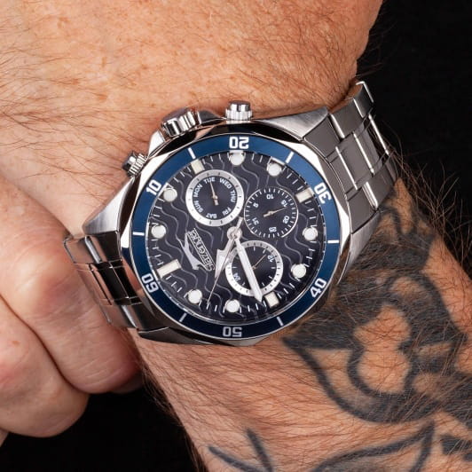 Мужские кварцевые часы Slazenger SL.09.2309.2.03 — это выразительный и функциональный аксессуар, сочетающий прочность, стиль и насыщенную комплектацию. Корпус и браслет выполнены из суперметалла, защищён минеральным стекломМинеральное стеклоМинеральное стекло представляет собой искусственно выращенный минерал кварца. Такое стекло отличается особой устойчивостью к повреждениям и царапинам. Уступает по некоторым качествам сапфировому стеклу.. Циферблат синего цвета оформлен с вынесенными малыми циферблатами для индикации дня недели, даты и времени в 24-часовом формате. Стрелки и метки оснащены люминесцентным покрытиемЛюминесцентное покрытиеПозволяет считывать показания времени в темноте. Производители наносят на стрелки, часовые индексы, безель или поверхность циферблата светонакопительный состав, дающий холодное свечение., обеспечивающим хорошую читаемость в темноте. Заводная головка снабжена защитой, а задняя крышка — завинчивающаяся, что повышает надёжность конструкции. Браслет фиксируется на раскладной застёжкеРаскладная застёжкаТакой тип застёжки используется только на браслетах из металла. Она никогда не раскрывается полностью, происходит разделение на 2 и более частей. Раскладывающая застёжка снизит вероятность потери часов к минимуму., обеспечивая удобство и безопасность ношения. Водонепроницаемость 50 м позволяет использовать часы в повседневных условиях, защищая от случайных брызг и капель дождя. Модель подчёркивает индивидуальность владельца и идеально подходит как для повседневного, так и для делового образа.