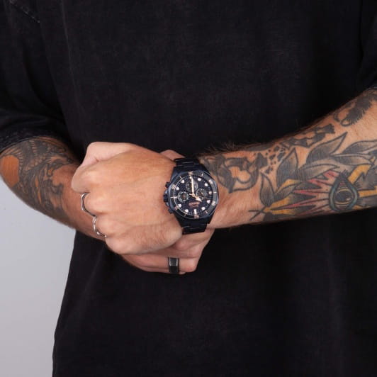 Мужские кварцевые часы Slazenger SL.09.2309.2.07 — это выразительный и функциональный аксессуар, сочетающий прочность, стиль и насыщенную комплектацию. Корпус и браслет выполнены из суперметалла с IP-покрытиемIP-покрытиеМетод ионного напыления. Демонстрирует повышенную устойчивость к истиранию, окислению и химическим веществам. Под воздействием высокого давления и температуры около 1500°C молекулы металла надёжно соединяются с частицами корпуса часов., защищён минеральным стекломМинеральное стеклоМинеральное стекло представляет собой искусственно выращенный минерал кварца. Такое стекло отличается особой устойчивостью к повреждениям и царапинам. Уступает по некоторым качествам сапфировому стеклу.. Циферблат синего цвета оформлен с вынесенными малыми циферблатами для индикации дня недели, даты и времени в 24-часовом формате. Стрелки и метки оснащены люминесцентным покрытиемЛюминесцентное покрытиеПозволяет считывать показания времени в темноте. Производители наносят на стрелки, часовые индексы, безель или поверхность циферблата светонакопительный состав, дающий холодное свечение., обеспечивающим хорошую читаемость в темноте. Заводная головка снабжена защитой, а задняя крышка — завинчивающаяся, что повышает надёжность конструкции. Браслет комбинированного цвета фиксируется на раскладной застёжкеРаскладная застёжкаТакой тип застёжки используется только на браслетах из металла. Она никогда не раскрывается полностью, происходит разделение на 2 и более частей. Раскладывающая застёжка снизит вероятность потери часов к минимуму., обеспечивая удобство и безопасность ношения. Водонепроницаемость 50 м позволяет использовать часы в повседневных условиях, защищая от случайных брызг и капель дождя. Модель подчёркивает индивидуальность владельца и идеально подходит как для повседневного, так и для делового образа.