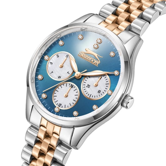 Женские кварцевые часы Slazenger — это элегантный и функциональный аксессуар. Корпус диаметром 34 мм и толщиной 11 мм выполнен из суперметалла. Циферблат синего цвета оформлен индексами и стрелками, украшен фианитами. Циферблат защищён минеральным стекломМинеральное стеклоМинеральное стекло представляет собой искусственно выращенный минерал кварца. Такое стекло отличается особой устойчивостью к повреждениям и царапинам. Уступает по некоторым качествам сапфировому стеклу.. Механизм — кварцевый. Часы оснащены индикацией дня недели, даты и 12/24-часового формата времени. Часы оснащены браслетом из суперметалла с IP-покрытиемIP-покрытиеМетод ионного напыления. Демонстрирует повышенную устойчивость к истиранию, окислению и химическим веществам. Под воздействием высокого давления и температуры около 1500°C молекулы металла надёжно соединяются с частицами корпуса часов. и раскладной застёжкойРаскладная застёжкаТакой тип застёжки используется только на браслетах из металла. Она никогда не раскрывается полностью, происходит разделение на 2 и более частей. Раскладывающая застёжка снизит вероятность потери часов к минимуму.. Водонепроницаемость 50 м позволяет использовать часы в повседневных условиях. Гарантия — 12 месяцев. Идеальный выбор для тех, кто ценит стиль, функциональность и качество.