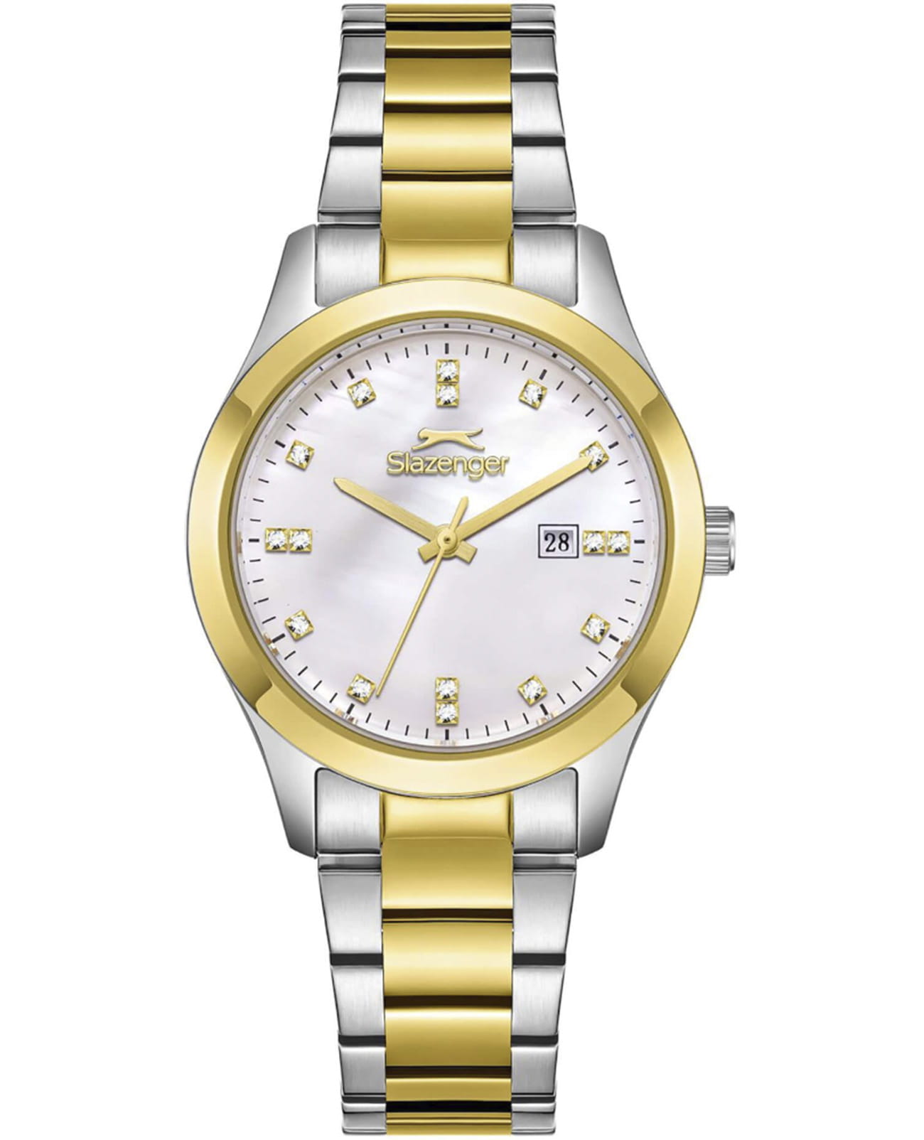 Женские кварцевые часы Slazenger — это элегантный аксессуар. Корпус диаметром 32 мм и толщиной 10 мм выполнен из нержавеющей стали 316L. БезельБезельВнешний ободок, закрепляющий стекло. В спортивных часах так называется поворотное кольцо с делениями на циферблате, выполняет роль таймера – замеряет отрезки времени на шкале. Неподвижный безель – элемент декора. Однонаправленно вращающийся безель на дайверских часах позволяет фиксировать моменты погружения и выныривания на поверхность. с IP-покрытиемIP-покрытиеМетод ионного напыления. Демонстрирует повышенную устойчивость к истиранию, окислению и химическим веществам. Под воздействием высокого давления и температуры около 1500°C молекулы металла надёжно соединяются с частицами корпуса часов.. Циферблат белого цвета с перламутровыми вставками оформлен индексами в виде фианитов. Циферблат защищён минеральным стекломМинеральное стеклоМинеральное стекло представляет собой искусственно выращенный минерал кварца. Такое стекло отличается особой устойчивостью к повреждениям и царапинам. Уступает по некоторым качествам сапфировому стеклу.. Механизм — кварцевый. Окошко даты расположено в положении 3 часов. Часы оснащены стальным браслетом с IP-покрытиемIP-покрытиеМетод ионного напыления. Демонстрирует повышенную устойчивость к истиранию, окислению и химическим веществам. Под воздействием высокого давления и температуры около 1500°C молекулы металла надёжно соединяются с частицами корпуса часов. и раскладной застёжкойРаскладная застёжкаТакой тип застёжки используется только на браслетах из металла. Она никогда не раскрывается полностью, происходит разделение на 2 и более частей. Раскладывающая застёжка снизит вероятность потери часов к минимуму.. Водонепроницаемость 50 м позволяет использовать часы в повседневных условиях. Гарантия — 12 месяцев. Идеальный выбор для тех, кто ценит стиль и качество.