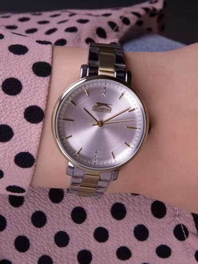 Женские кварцевые часы Slazenger — элегантный аксессуар с гармоничным дизайном и продуманной конструкцией. Корпус диаметром 35 мм и толщиной 8,5 мм выполнен из суперметалла. БезельБезельВнешний ободок, закрепляющий стекло. В спортивных часах так называется поворотное кольцо с делениями на циферблате, выполняет роль таймера – замеряет отрезки времени на шкале. Неподвижный безель – элемент декора. Однонаправленно вращающийся безель на дайверских часах позволяет фиксировать моменты погружения и выныривания на поверхность. с IP-покрытиемIP-покрытиеМетод ионного напыления. Демонстрирует повышенную устойчивость к истиранию, окислению и химическим веществам. Под воздействием высокого давления и температуры около 1500°C молекулы металла надёжно соединяются с частицами корпуса часов.. Циферблат серебристого цвета оформлен индексами и стрелками. Циферблат защищён минеральным стекломМинеральное стеклоМинеральное стекло представляет собой искусственно выращенный минерал кварца. Такое стекло отличается особой устойчивостью к повреждениям и царапинам. Уступает по некоторым качествам сапфировому стеклу.. Механизм — кварцевый калибр Miyota 2035. Браслет из суперметалла с IP-покрытиемIP-покрытиеМетод ионного напыления. Демонстрирует повышенную устойчивость к истиранию, окислению и химическим веществам. Под воздействием высокого давления и температуры около 1500°C молекулы металла надёжно соединяются с частицами корпуса часов.., обеспечивает цельный и утончённый образ. Часы оснащены раскладной застёжкойРаскладная застёжкаТакой тип застёжки используется только на браслетах из металла. Она никогда не раскрывается полностью, происходит разделение на 2 и более частей. Раскладывающая застёжка снизит вероятность потери часов к минимуму.. Водонепроницаемость 30 м позволяет использовать часы в повседневных условиях. Стильное решение для тех, кто ценит лаконичность и качество.