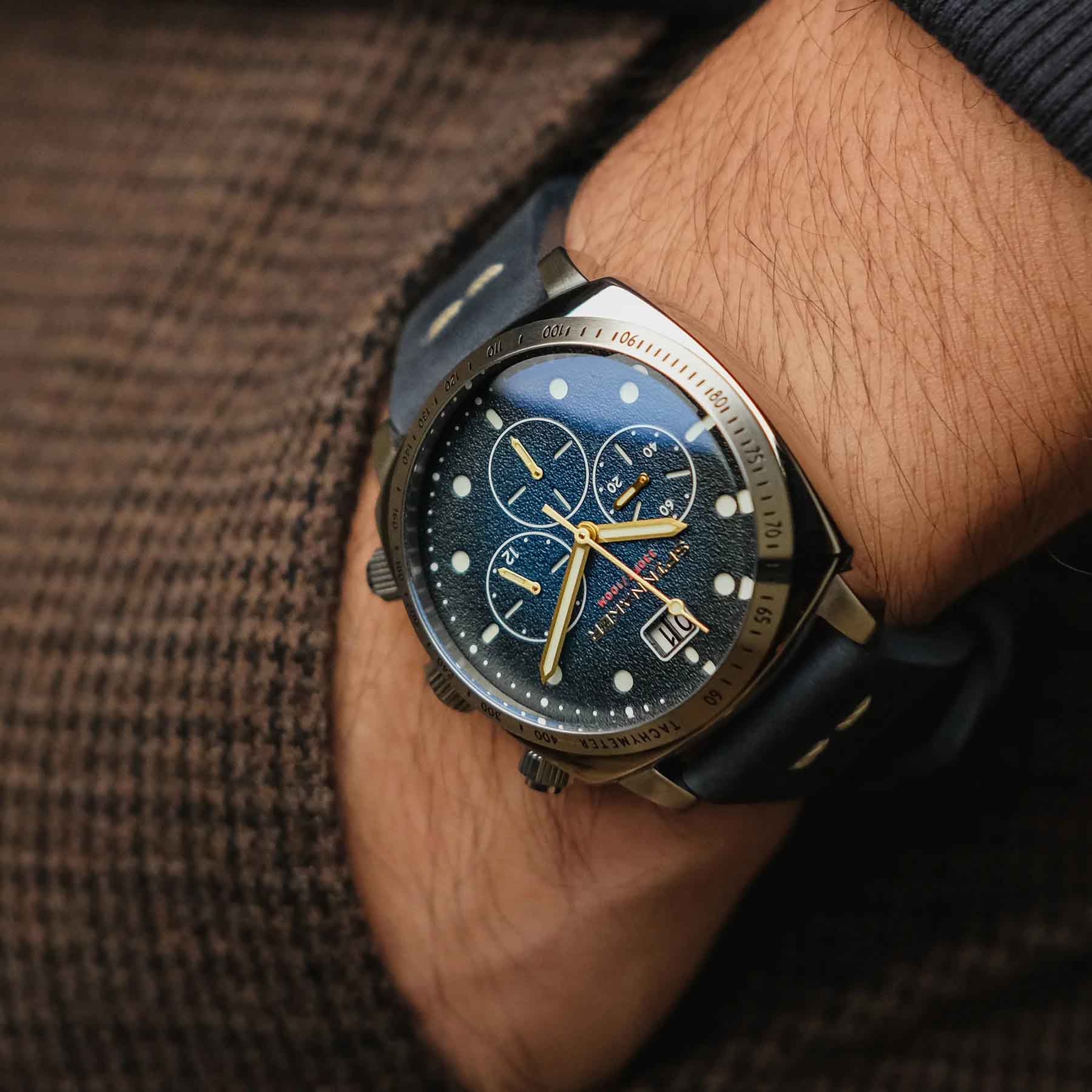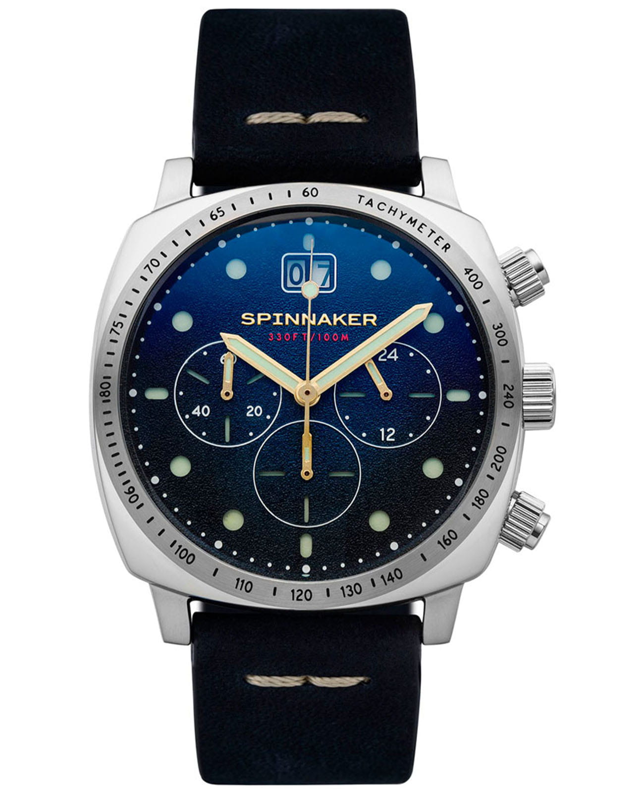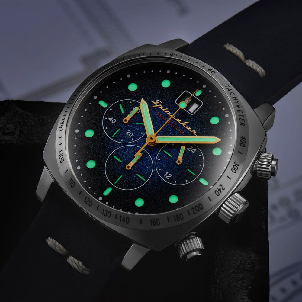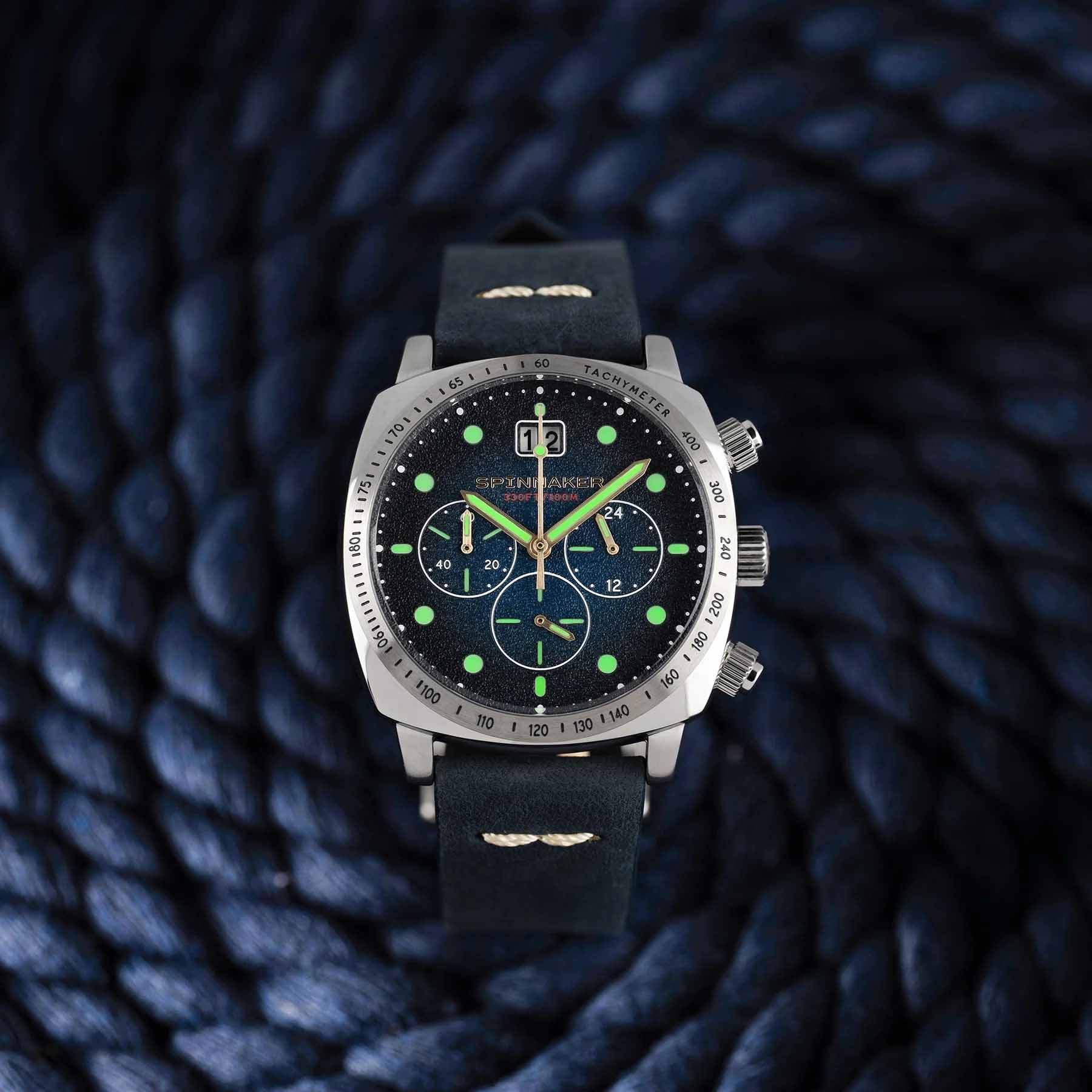 Мужской кварцевый хронографХронографФункция позволяет измерять отрезки времени с особой точностью: часы, минуты, секунды. Верным признаком хронографа является наличие на циферблате 3 дополнительных окошек-счётчиков. с секундомеромСекундомерСекундоме́р — прибор, способный измерять интервалы времени с точностью до долей секунды. и тахиметромТахиметрРазмеченная шкала, располагается на ободке или безеле часов. Тахиметр позволяет рассчитать скорость на определённом участке пути, расстояние измеряется в километрах или милях. Spinnaker Hull SP-5068-03. Калибр механизма TMI VK73. Центральные часовая и минутная стрелки, секундная стрелка вынесена на малый циферблат. Большая дата в позиции 12 часов. 12/24х часовой формат времени. Корпус выполнен из нержавеющей стали. Кожаный ремешок шириной 22 мм, стандартная застежка. Циферблат с люминесцентным покрытиемЛюминесцентное покрытиеПозволяет считывать показания времени в темноте. Производители наносят на стрелки, часовые индексы, безель или поверхность циферблата светонакопительный состав, дающий холодное свечение. стрелок и меток, дополнен выпуклым минеральным стекломМинеральное стеклоМинеральное стекло представляет собой искусственно выращенный минерал кварца. Такое стекло отличается особой устойчивостью к повреждениям и царапинам. Уступает по некоторым качествам сапфировому стеклу. , устойчивым к мелким механическим повреждениям. Водостойкость WR 100 (плавание без погружения).