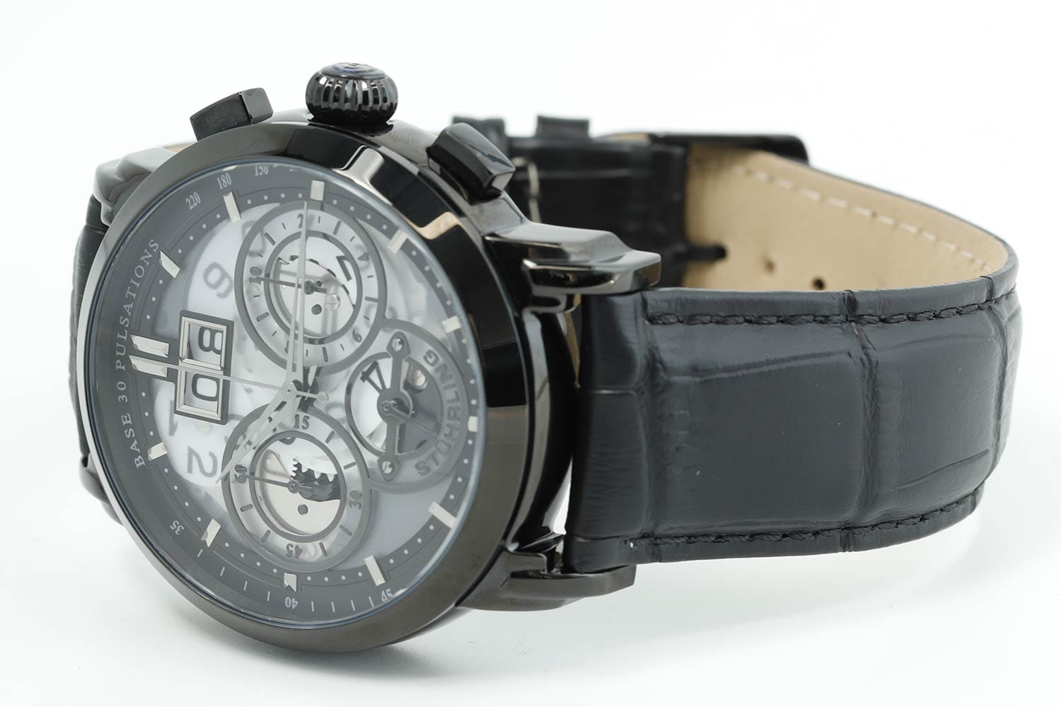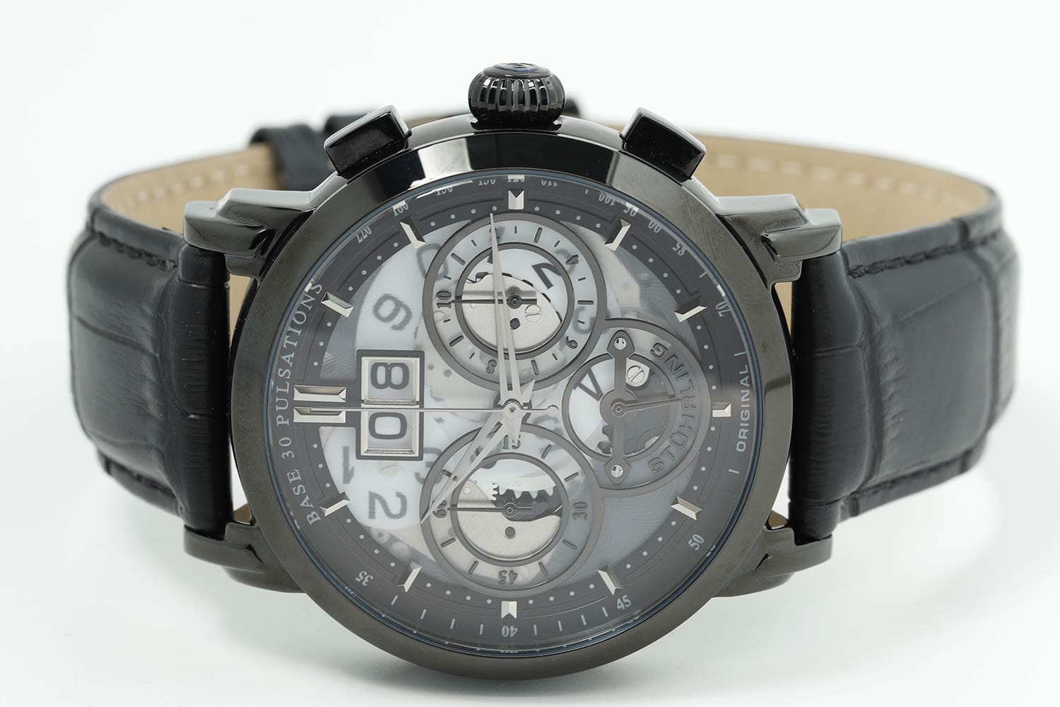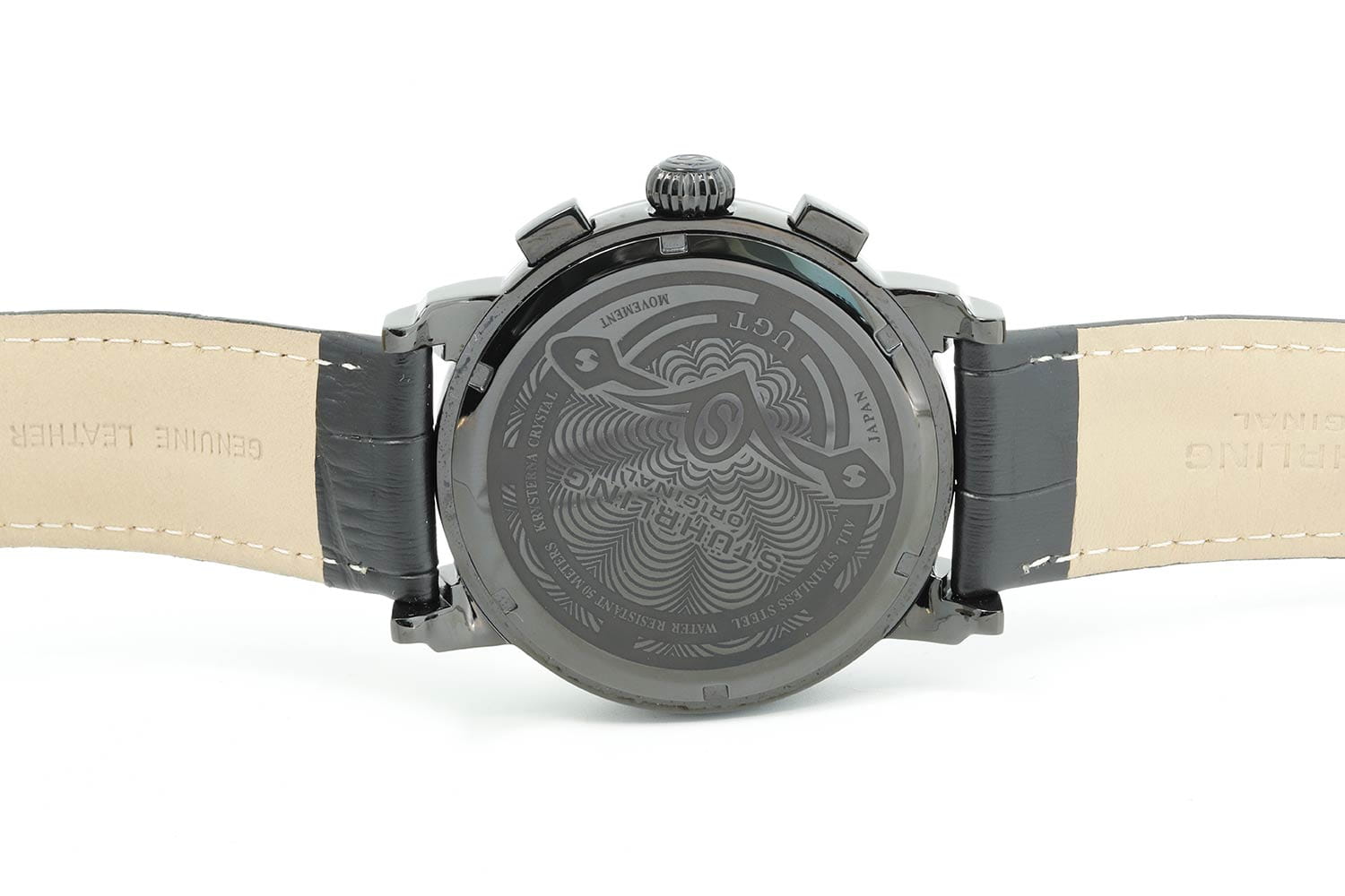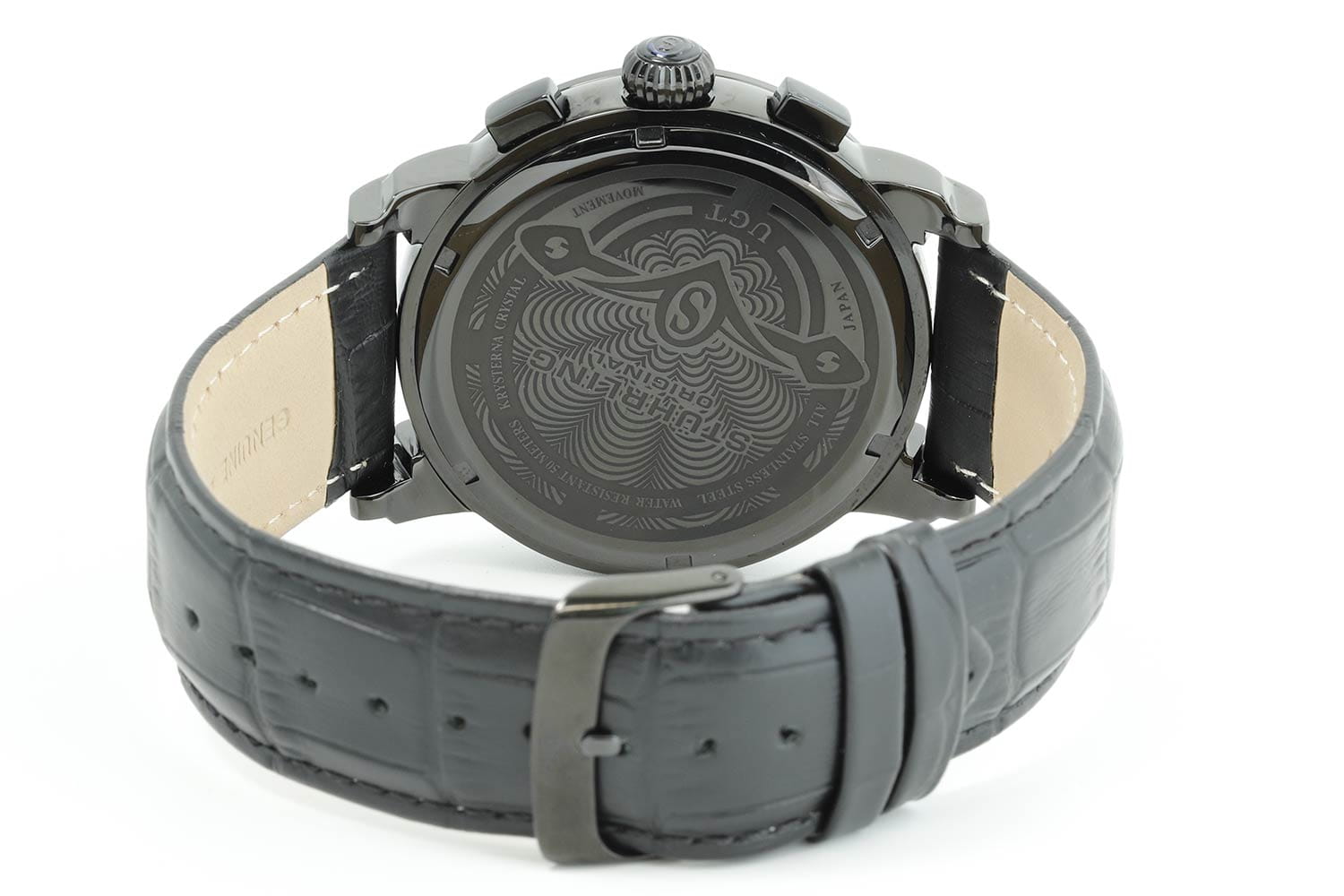 Stuhrling 392.03 — мощные мужские часы с выразительным индустриальным дизайном и технологичной эстетикой. Матовый корпус с PVD-покрытиемPVDУльтратонкое покрытие наносится в технике вакуумного напыления, сочетает в себе нитрид титана особой прочности со слоем золота или оксида хрома. Несёт в себе декоративную или защитную функцию. подчёркивает брутальный характер модели, а многослойный циферблат с тремя счётчиками хронографаХронографФункция позволяет измерять отрезки времени с особой точностью: часы, минуты, секунды. Верным признаком хронографа является наличие на циферблате 3 дополнительных окошек-счётчиков. и крупным окном даты создаёт эффект глубины и механической сложности. Контрастные стрелки и метки обеспечивают превосходную читаемость. Прочное стекло KrysternaKrysternaKrysterna — инновационное стекло для наручных часов. Благодаря уникальной структуре, Krysterna объединяет ключевые преимущества двух материалов: твердость сапфира, защищающую от царапин, и гибкость минерального стекла, обеспечивающую устойчивость к деформациям. Такая комбинация делает его идеальным решением для часов, подверженных экстремальным нагрузкам, сохраняя при этом оптическую прозрачность. защищает от царапин, а кожаный ремень с текстурой под крокодила придаёт модели утончённость и комфорт. Stuhrling — это современный баланс между инженерной мощью и смелым дизайнерским почерком.