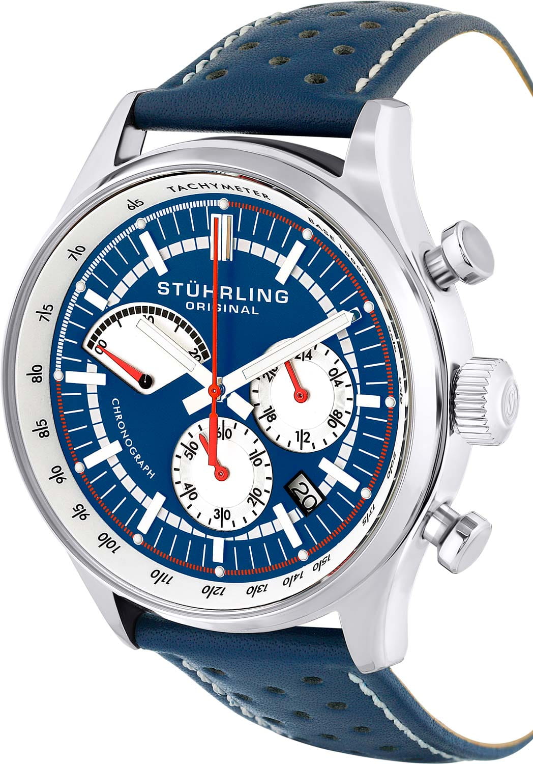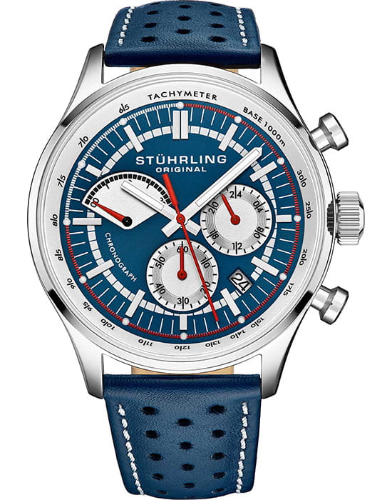 Stuhrling 934.02 — эффектные мужские часы в спортивно-классическом стиле, сочетающие энергичный характер и элегантное исполнение. Корпус из нержавеющей стали придаёт модели выразительность и статусный вид. Контрастный синий циферблат с белыми счётчиками хронографаХронографФункция позволяет измерять отрезки времени с особой точностью: часы, минуты, секунды. Верным признаком хронографа является наличие на циферблате 3 дополнительных окошек-счётчиков. и акцентами красного цвета создаёт динамичную композицию, а разметка тахиметра добавляет функциональности. Прочное стекло KrysternaKrysternaKrysterna — инновационное стекло для наручных часов. Благодаря уникальной структуре, Krysterna объединяет ключевые преимущества двух материалов: твердость сапфира, защищающую от царапин, и гибкость минерального стекла, обеспечивающую устойчивость к деформациям. Такая комбинация делает его идеальным решением для часов, подверженных экстремальным нагрузкам, сохраняя при этом оптическую прозрачность. защищает поверхность от царапин, сохраняя прозрачность и блеск. Перфорированный кожаный ремень со стандартной застежкой обеспечивает комфорт и спортивный характер образа. Stuhrling — выбор уверенного мужчины, для которого стиль, точность и мощная эстетика идут рука об руку.