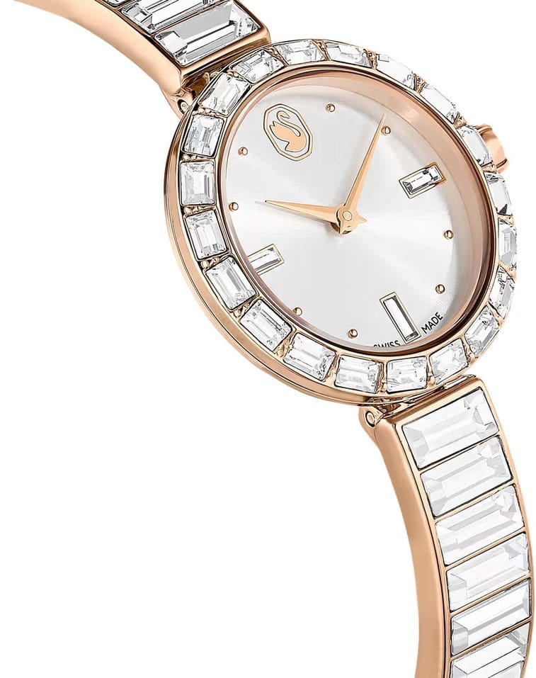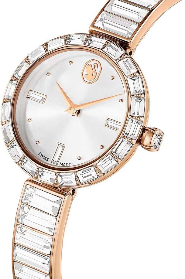 Часы Swarovski 5677484 – это гармоничное сочетание элегантности и функциональности, созданное для ценителей изысканных аксессуаров. Эти швейцарские кварцевые часы заключены в корпус из стали с розовым PVDPVDУльтратонкое покрытие наносится в технике вакуумного напыления, сочетает в себе нитрид титана особой прочности со слоем золота или оксида хрома. Несёт в себе декоративную или защитную функцию.-покрытием, который привлекает внимание своим утонченным стилем. Серебристый циферблат, выполненный по технологии Sunray, украшен логотипом Swarovski в виде лебедя на отметке 12 часов, добавляя часам особый шарм. БезельБезельВнешний ободок, закрепляющий стекло. В спортивных часах так называется поворотное кольцо с делениями на циферблате, выполняет роль таймера – замеряет отрезки времени на шкале. Неподвижный безель – элемент декора. Однонаправленно вращающийся безель на дайверских часах позволяет фиксировать моменты погружения и выныривания на поверхность., браслет и циферблат украшены мерцающими кристаллами Swarovski, создающими эффектный блеск и подчеркивающими роскошь изделия. Заводная головка дополнена кристаллом круглой огранки, придающим часам завершенность и изящество. Минеральное стеклоМинеральное стеклоМинеральное стекло представляет собой искусственно выращенный минерал кварца. Такое стекло отличается особой устойчивостью к повреждениям и царапинам. Уступает по некоторым качествам сапфировому стеклу. надежно защищает циферблат, а водозащита 50 WR позволяет не беспокоиться о контакте с водой в повседневных ситуациях. Стальной браслет с розовым PVDPVDУльтратонкое покрытие наносится в технике вакуумного напыления, сочетает в себе нитрид титана особой прочности со слоем золота или оксида хрома. Несёт в себе декоративную или защитную функцию.-покрытием, декорированный кристаллами, обеспечивает комфортное ношение и стильный внешний вид. С диаметром корпуса 25 мм и длиной браслета 16,5 см, эти часы станут изысканным дополнением к любому наряду. Часы Swarovski 5677484 – это не просто аксессуар, а настоящее произведение искусства, способное стать ярким акцентом вашего образа.