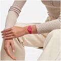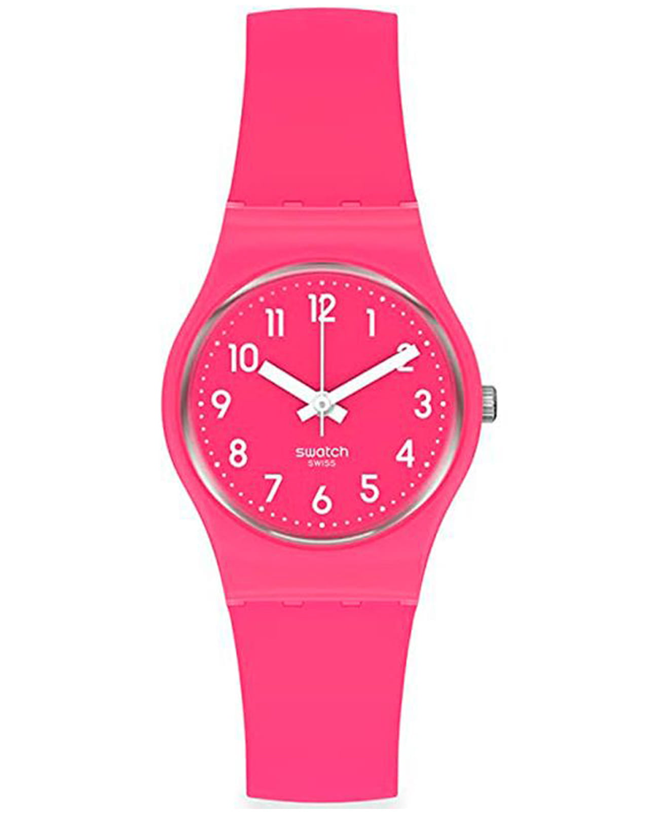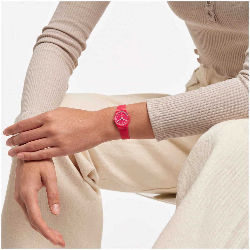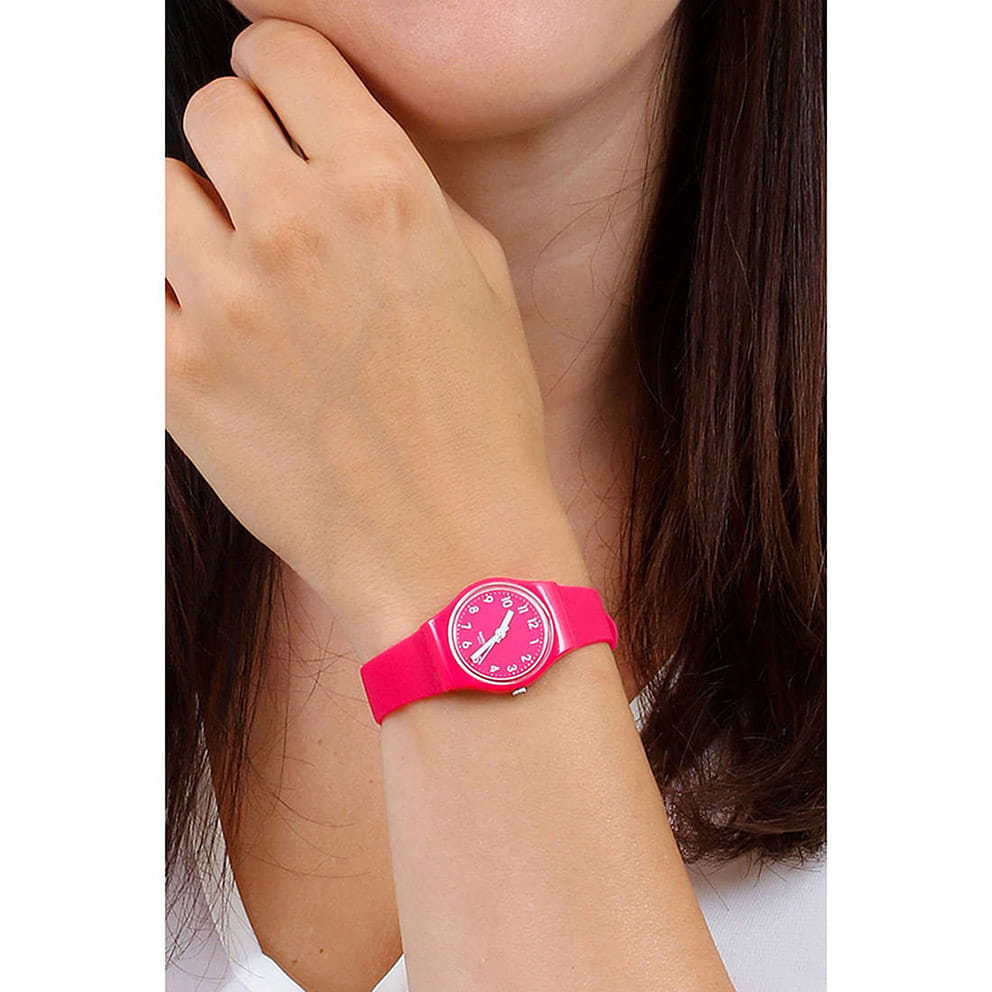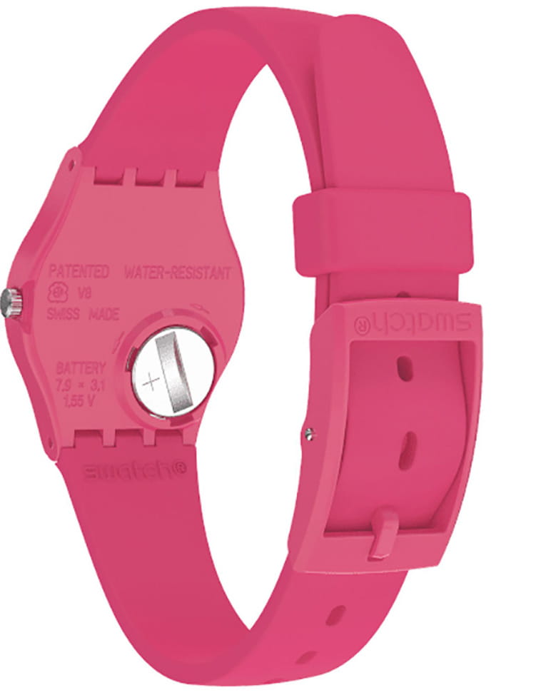 Швейцарские наручные часы Swatch LR123C. Эти современные и легкие женские часы относятся к коллекции Lady. С водозащитой до 30 метров они надежно защищают корпус от случайных брызг и капель дождя. Акриловое стекло, используемое в этих часах, обладает высокой прочностью и трудно разбивается; это легкий прозрачный пластик, который может прогибаться при ударах и не разлетается на осколки. Кроме того, акрил устойчив к перепадам температуры и высокому давлению. Корпус часов ярко-розового цвета выполнен из полимера, а механизм — кварцевый. Кварцевые часы обеспечивают большую точность по сравнению с механическими, с погрешностью хода около 20 секунд в месяц. Они не требуют завода, достаточно менять батарейку раз в несколько лет. Ремешок силиконовый, с классической застежкой.