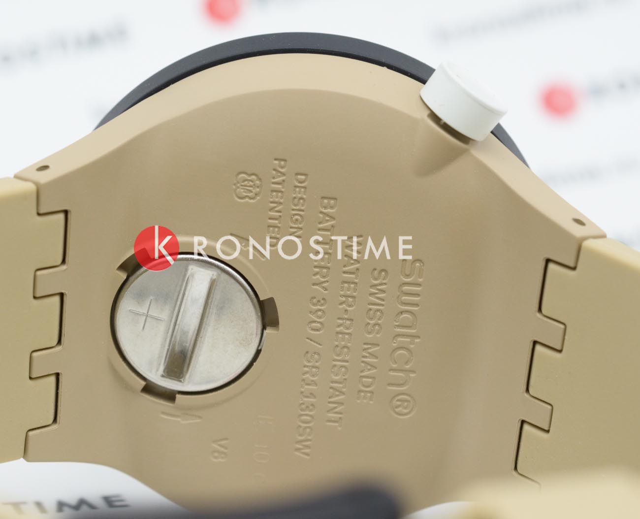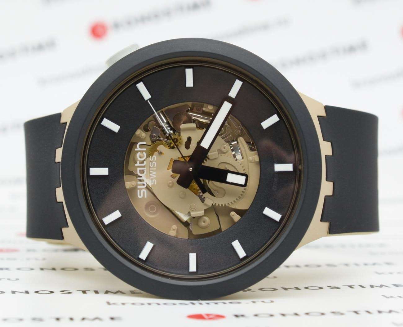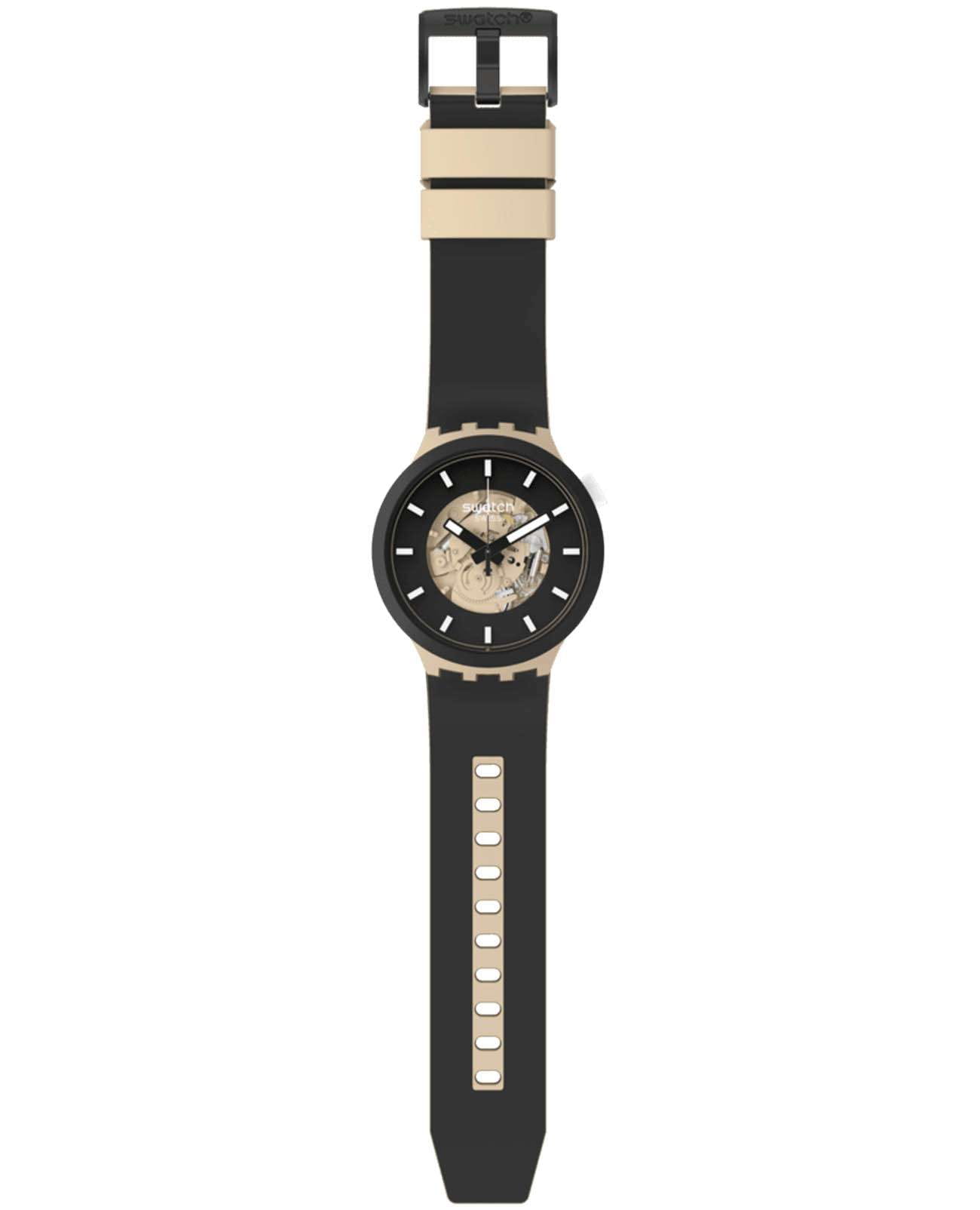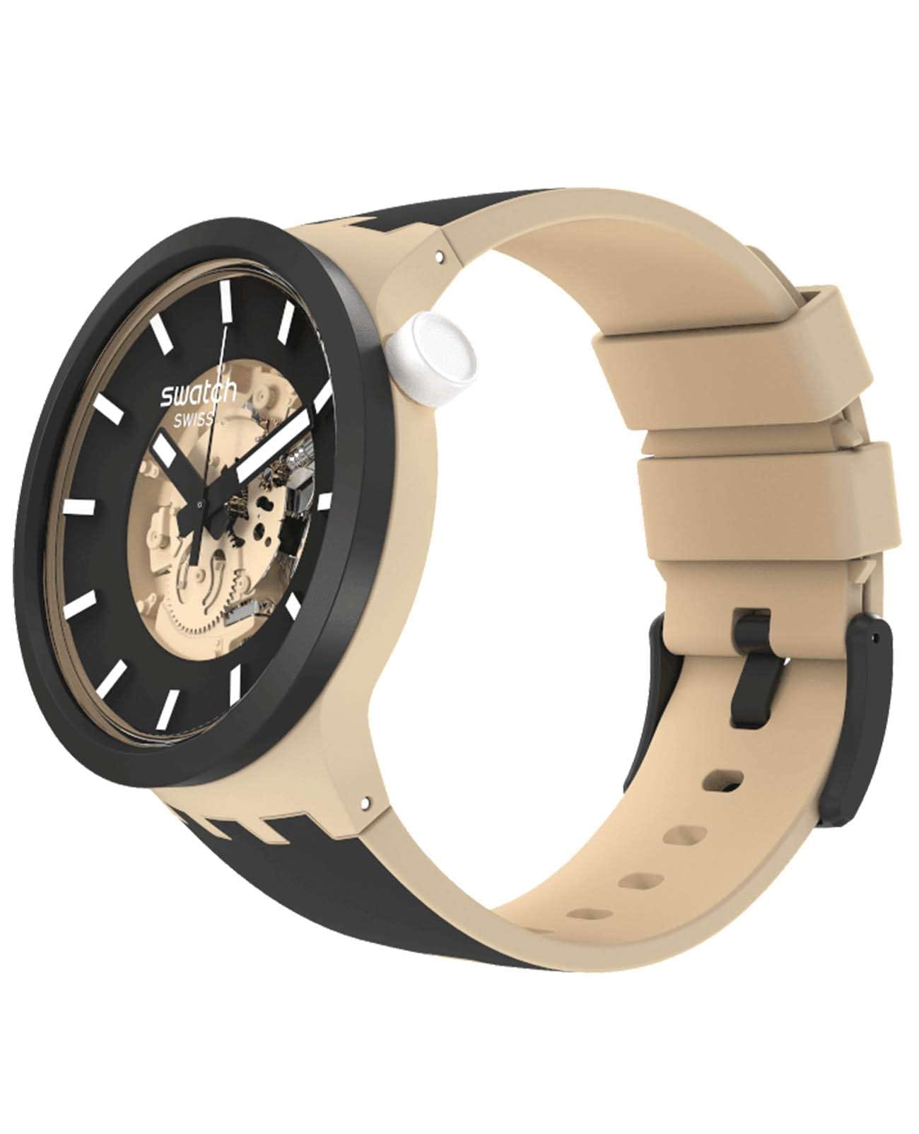 Часы Swatch SB03C100 — это стильный и современный аксессуар для тех, кто ценит лёгкость и комфорт. Часы идеально подойдут как для мужчин, так и для женщин. Центральный элемент этой модели часов — большой корпус со стеклом из био-материала, украшенный 3D-циферблатом с принтами на индексах. Корпус и безельБезельВнешний ободок, закрепляющий стекло. В спортивных часах так называется поворотное кольцо с делениями на циферблате, выполняет роль таймера – замеряет отрезки времени на шкале. Неподвижный безель – элемент декора. Однонаправленно вращающийся безель на дайверских часах позволяет фиксировать моменты погружения и выныривания на поверхность. из биокерамикиБиокерамикаБиокерамика — это материал, который на две трети состоит из керамики, на одну треть — из биопластика. Он сочетает в себе лучшие качества обоих материалов и обладает прочностью и шелковистой на ощупь текстурой., а также силиконовые тренчики подчеркивают бежевый принт на силиконовом ремешке этих огромных часов. На часовую, минутную стрелки нанесено люминесцентное покрытиеЛюминесцентное покрытиеПозволяет считывать показания времени в темноте. Производители наносят на стрелки, часовые индексы, безель или поверхность циферблата светонакопительный состав, дающий холодное свечение., которое светится в темноте, создавая необычное изображение. Водозащита 30 метров делает часы практичными для повседневного использования. Эти часы подойдут для повседневного ношения и станут ярким акцентом в вашем наряде.