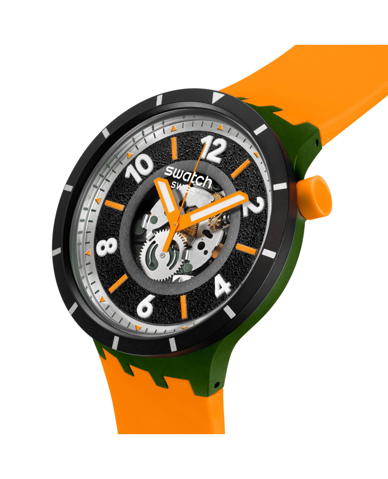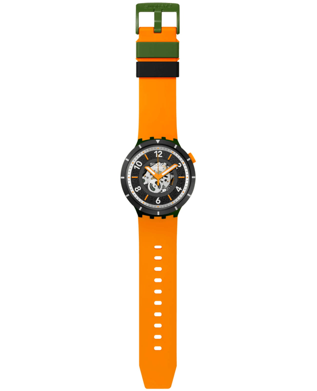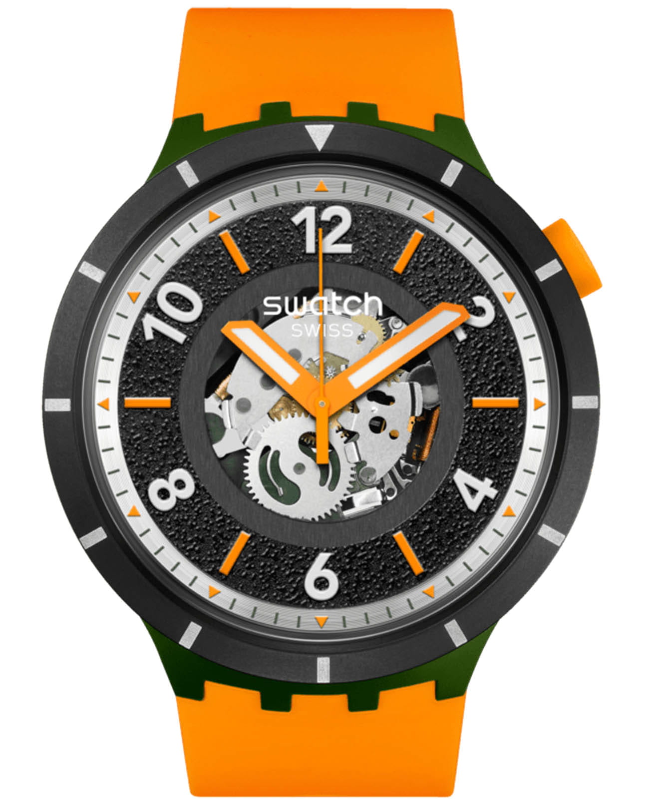 Часы Swatch SB03G107— это стильный и современный аксессуар для тех, кто ценит лёгкость и комфорт. Часы идеально подойдут как для мужчин, так и для женщин. Эти часы большого размера имеют черно-серебристый циферблат в матово-зеленом корпусе из биокерамикиБиокерамикаБиокерамика — это материал, который на две трети состоит из керамики, на одну треть — из биопластика. Он сочетает в себе лучшие качества обоих материалов и обладает прочностью и шелковистой на ощупь текстурой. со стеклом из биосодержащих материалов и матово-черным безелем БезельВнешний ободок, закрепляющий стекло. В спортивных часах так называется поворотное кольцо с делениями на циферблате, выполняет роль таймера – замеряет отрезки времени на шкале. Неподвижный безель – элемент декора. Однонаправленно вращающийся безель на дайверских часах позволяет фиксировать моменты погружения и выныривания на поверхность. из биокерамикиБиокерамикаБиокерамика — это материал, который на две трети состоит из керамики, на одну треть — из биопластика. Он сочетает в себе лучшие качества обоих материалов и обладает прочностью и шелковистой на ощупь текстурой.. Оранжевые стрелки и белые цифры с люминесцентным покрытиемЛюминесцентное покрытиеПозволяет считывать показания времени в темноте. Производители наносят на стрелки, часовые индексы, безель или поверхность циферблата светонакопительный состав, дающий холодное свечение. прекрасно сочетаются с матово-оранжевым ремешком с матово-зелеными и черными петлями и матово-зеленой пряжкой. Водозащита 30 метров делает часы практичными для повседневного использования. Эти часы подойдут для повседневного ношения и станут ярким акцентом в вашем наряде.