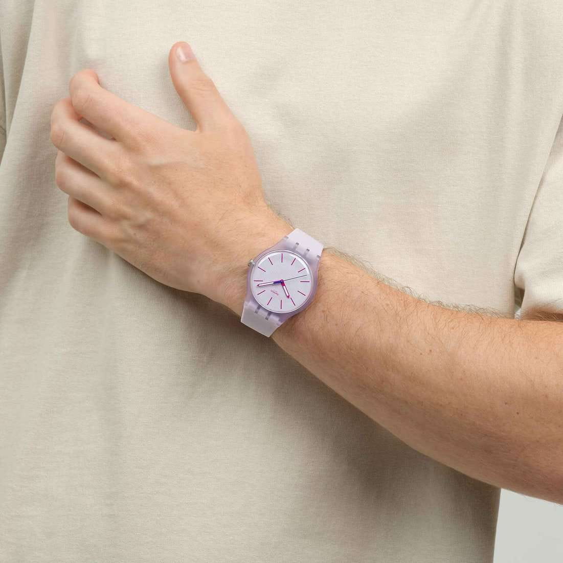 Мужские наручные часы Swatch LAVENDAZE SO29V101 — это стильный и современный аксессуар для тех, кто ценит лёгкость и комфорт. Корпус выполнен из пластика, диаметром 41 мм и толщиной 9.85 мм, что обеспечивает долговечность и утончённый внешний вид. Циферблат защищён органическим стеклом, устойчивым к повреждениям. Модель оснащена кварцевым механизмом, обеспечивающим высокую точность хода. Часовая и минутная стрелки с люминесцентным покрытиемЛюминесцентное покрытиеПозволяет считывать показания времени в темноте. Производители наносят на стрелки, часовые индексы, безель или поверхность циферблата светонакопительный состав, дающий холодное свечение.. Силиконовый текстурированный матово-фиолетовый ремешок на стандартной застёжке гармонично дополняет корпус и обеспечивает комфортное ношение. Водозащита 30 метров позволит защитить корпус от случайных брызг или капель дождя. Эти часы подойдут для повседневного ношения и станут ярким акцентом в вашем наряде.