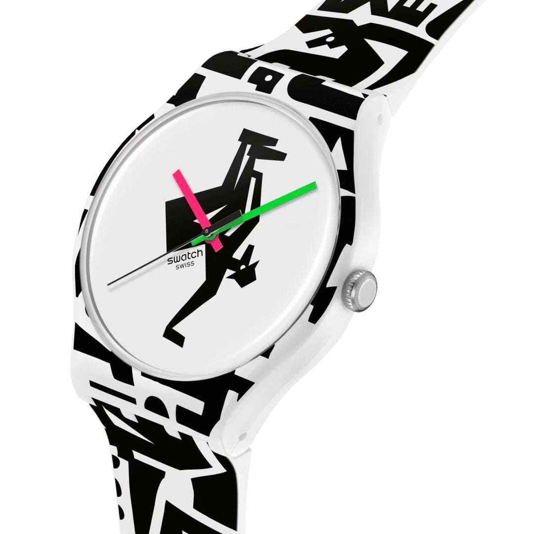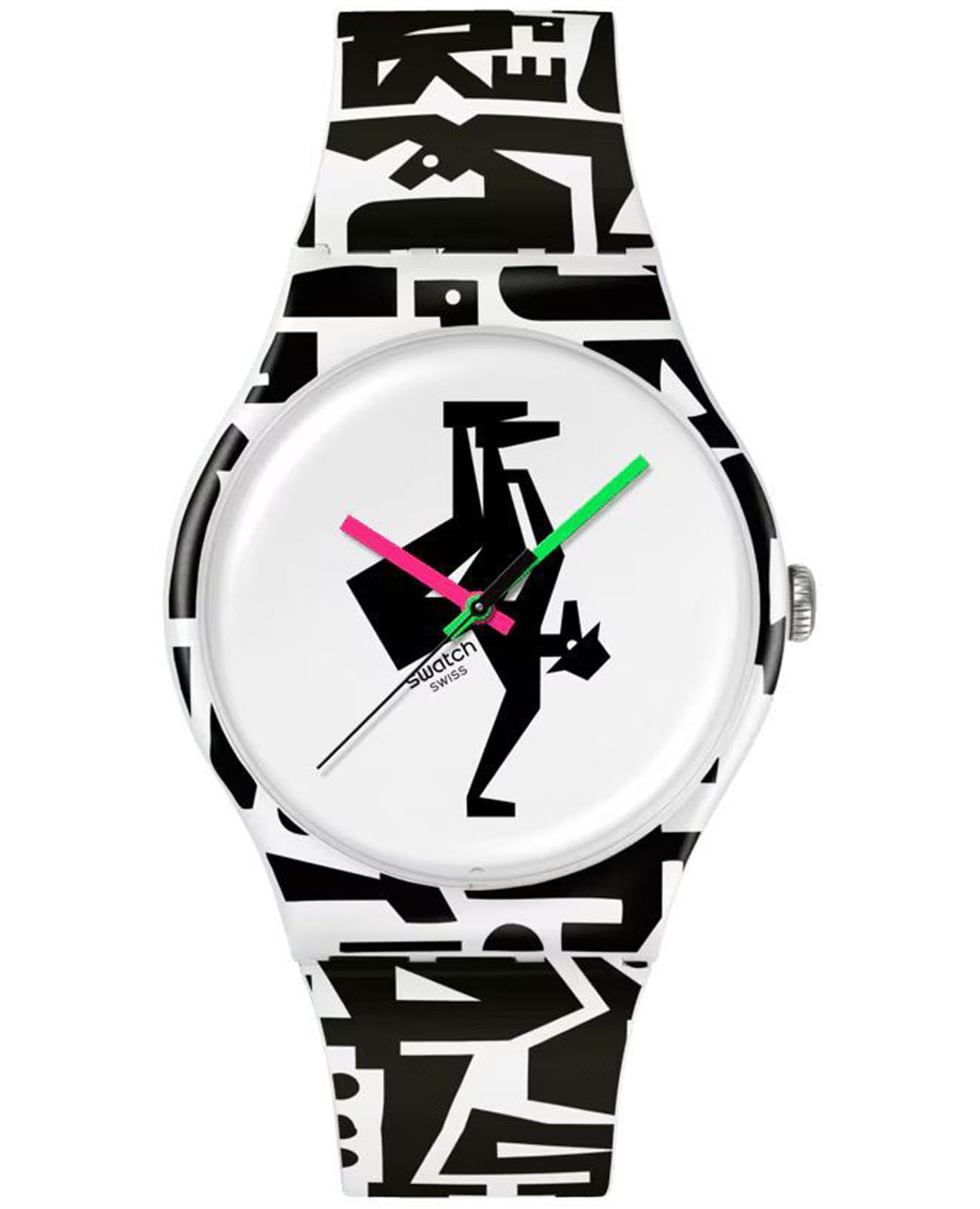 Часы Swatch SO29Z147 —  стильный и удобный аксессуар. Эти веселые часы были созданы в сотрудничестве с художником и графическим дизайнером Grotesk. Белый циферблат украшен черной печатью, а также розовой часовой стрелкой, зеленой минутной стрелкой и черной секундной стрелкой, все под стеклом из биоматериала. Черный дизайн напечатан на матовом белом ремешке, петле и корпусе из биоматериала. Белая пряжка завершает образ этих часов. Ремешок силиконовый на стандартной застёжке. Внутри часов установлен надежный кварцевый механизм, который обеспечивает точность хода. Эти часы водонепроницаемы до 30 метров, что позволяет не беспокоиться о случайных брызгах или дождевых каплях. Swatch SO29Z147 — это идеальный выбор для тех, кто ценит сочетание стиля, комфорта и функциональности в одном аксессуаре.