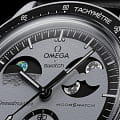 Часы Swatch Bioceramic Moonswatch MISSION TO EARTHPHASE SO33M700 — это стильный и современный аксессуар для тех, кто ценит лёгкость и комфорт. Часы идеально подойдут как для мужчин, так и для женщин. Корпус диаметром 42 мм и пряжка этих уникальных часов изготовлены из биокерамикиБиокерамикаБиокерамика — это материал, который на две трети состоит из керамики, на одну треть — из биопластика. Он сочетает в себе лучшие качества обоих материалов и обладает прочностью и шелковистой на ощупь текстурой. серой расцветки, напоминающей нержавеющую сталь. Модель оснащена серым циферблатом и черным биокерамическим безелемБезельВнешний ободок, закрепляющий стекло. В спортивных часах так называется поворотное кольцо с делениями на циферблате, выполняет роль таймера – замеряет отрезки времени на шкале. Неподвижный безель – элемент декора. Однонаправленно вращающийся безель на дайверских часах позволяет фиксировать моменты погружения и выныривания на поверхность. с нанесенной на него шкалой тахиметраТахиметрРазмеченная шкала, располагается на ободке или безеле часов. Тахиметр позволяет рассчитать скорость на определённом участке пути, расстояние измеряется в километрах или милях., а также черным ремешком с липучкой VELCRO®. Часовые отметки, часовая и минутная стрелки, а также кончик секундной стрелки хронографаХронографФункция позволяет измерять отрезки времени с особой точностью: часы, минуты, секунды. Верным признаком хронографа является наличие на циферблате 3 дополнительных окошек-счётчиков. покрыты люминесцентным покрытиемЛюминесцентное покрытиеПозволяет считывать показания времени в темноте. Производители наносят на стрелки, часовые индексы, безель или поверхность циферблата светонакопительный состав, дающий холодное свечение. Super-LumiNova® класса А, благодаря чему они прекрасно светятся в темноте (зеленым свечением). В честь Луны и Земли они оснащены индикатором лунных фаз и запатентованным указателем земных фаз. На диске индикатора фаз Луны, вращающемся на дополнительном циферблате в районе отметки 2 часа, размещены две крупные Луны с покрытием Super-LumiNova® (с белым свечением).
