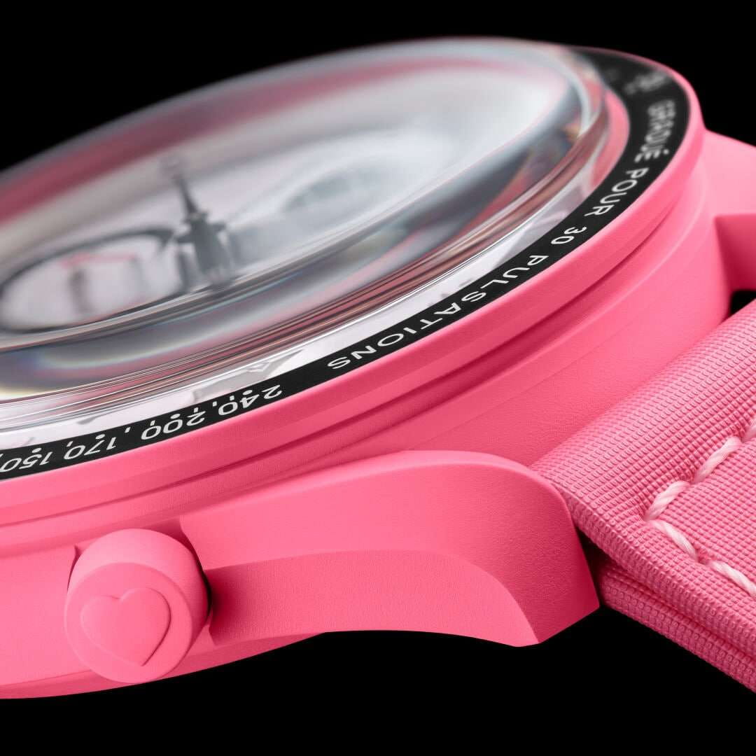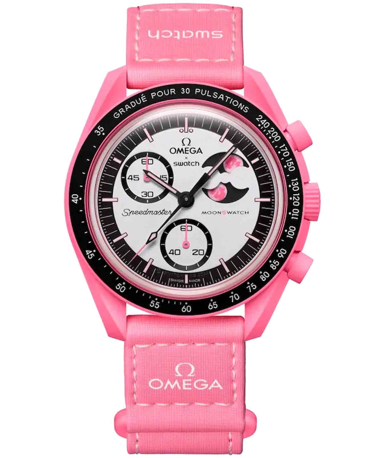 Швейцарские часы Swatch x Omega Bioceramic Moonswatch Mission to The Pink Moonphase SO33P700 с хронографом