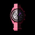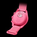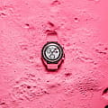 Часы Swatch Bioceramic Moonswatch MISSION TO THE PINK MOONPHASE SO33P700 — это стильный и современный аксессуар для тех, кто ценит лёгкость и комфорт. Корпус диаметром 42 мм и пряжка этих уникальных часов изготовлены из биокерамикиБиокерамикаБиокерамика — это материал, который на две трети состоит из керамики, на одну треть — из биопластика. Он сочетает в себе лучшие качества обоих материалов и обладает прочностью и шелковистой на ощупь текстурой., а также розовый ремешок VELCRO®. Модель оснащена белым циферблатом и черным биокерамическим безелемБезельВнешний ободок, закрепляющий стекло. В спортивных часах так называется поворотное кольцо с делениями на циферблате, выполняет роль таймера – замеряет отрезки времени на шкале. Неподвижный безель – элемент декора. Однонаправленно вращающийся безель на дайверских часах позволяет фиксировать моменты погружения и выныривания на поверхность.. Выдающейся особенностью этой модели является самое поэтичное часовое усложнение – индикатор фаз Луны. Черный диск индикатора фаз вращается на дополнительном циферблате в районе отметки 2 часа, и на его фоне отчетливо выделяются две луны розового цвета. Индексы, часовая, минутная и секундная стрелки хронографаХронографФункция позволяет измерять отрезки времени с особой точностью: часы, минуты, секунды. Верным признаком хронографа является наличие на циферблате 3 дополнительных окошек-счётчиков. покрыты люминесцентным покрытиемЛюминесцентное покрытиеПозволяет считывать показания времени в темноте. Производители наносят на стрелки, часовые индексы, безель или поверхность циферблата светонакопительный состав, дающий холодное свечение. Super-LumiNova® класса А (с розовым свечением), благодаря чему они светятся в темноте. Циферблаты каждых часов в данной коллекции украшены фирменным знаком OMEGA X Swatch, культовым логотипом Speedmaster и логотипом MoonSwatch.
