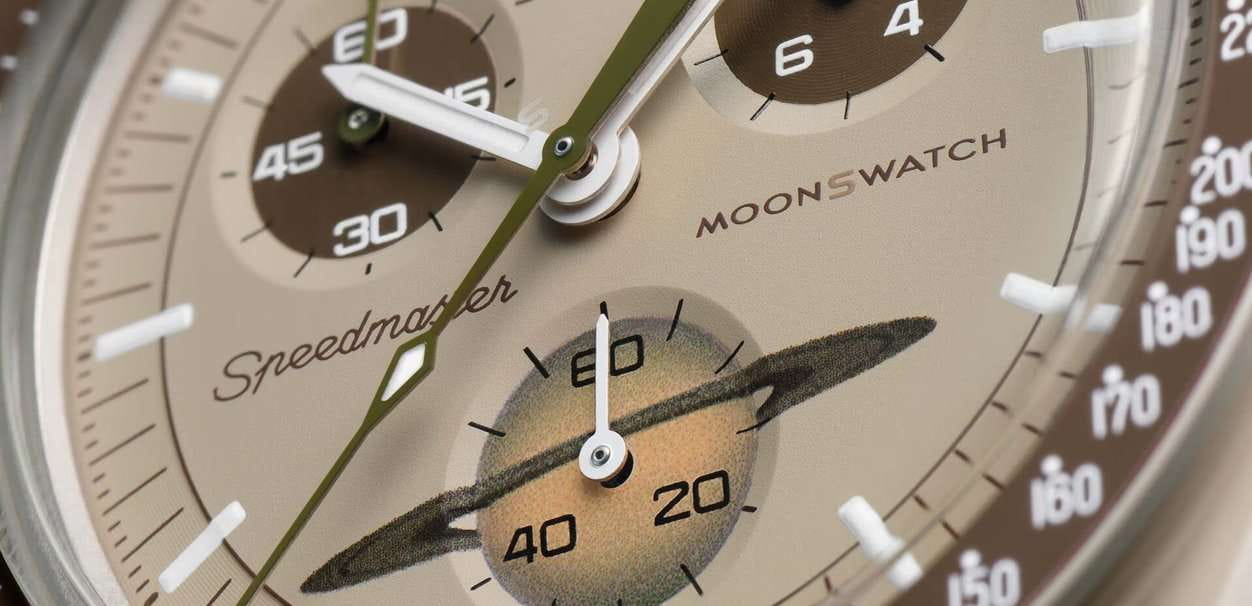 Часы Swatch Bioceramic Moonswatch MISSION TO SATURN SO33T100 — это стильный и современный аксессуар для тех, кто ценит лёгкость и комфорт. Корпус диаметром 42 мм и пряжка этих уникальных часов изготовлены из биокерамикиБиокерамикаБиокерамика — это материал, который на две трети состоит из керамики, на одну треть — из биопластика. Он сочетает в себе лучшие качества обоих материалов и обладает прочностью и шелковистой на ощупь текстурой., а также ремешок VELCRO®. Модель оснащена бежевым циферблатом и биокерамическим безелемБезельВнешний ободок, закрепляющий стекло. В спортивных часах так называется поворотное кольцо с делениями на циферблате, выполняет роль таймера – замеряет отрезки времени на шкале. Неподвижный безель – элемент декора. Однонаправленно вращающийся безель на дайверских часах позволяет фиксировать моменты погружения и выныривания на поверхность. на который нанесена шкала тахиметраТахиметрРазмеченная шкала, располагается на ободке или безеле часов. Тахиметр позволяет рассчитать скорость на определённом участке пути, расстояние измеряется в километрах или милях.. Общими характеристиками всех часов в данной коллекции являются конструкция стекла из биоматериала, «скрытая» в центре кристалла буква "S", тонкий и изящный круговой узор на внешнем кольце циферблата и заглубленных мини-циферблатах, гладкие ушки с заостренными концами, культовая точка над отметкой 90 на тахиметрической шкале безеля и, конечно же, уникальный материал – биокерамика. Индексы, часовая, минутная и секундная стрелки хронографаХронографФункция позволяет измерять отрезки времени с особой точностью: часы, минуты, секунды. Верным признаком хронографа является наличие на циферблате 3 дополнительных окошек-счётчиков. покрыты люминесцентным покрытиемЛюминесцентное покрытиеПозволяет считывать показания времени в темноте. Производители наносят на стрелки, часовые индексы, безель или поверхность циферблата светонакопительный состав, дающий холодное свечение. Super-LumiNova® класса А, благодаря чему они светятся в темноте. Циферблаты каждых часов в данной коллекции украшены фирменным знаком OMEGA X Swatch, культовым логотипом Speedmaster и логотипом MoonSwatch.