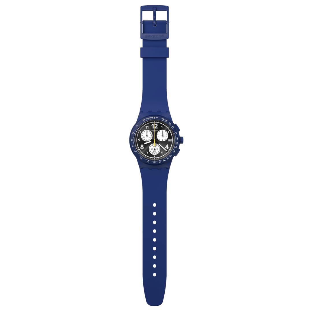 Часы Swatch SUSN418 — это стильный и современный аксессуар для тех, кто ценит лёгкость и комфорт. Часы идеально подойдут как для мужчин, так и для женщин. Этот синий хронографХронографФункция позволяет измерять отрезки времени с особой точностью: часы, минуты, секунды. Верным признаком хронографа является наличие на циферблате 3 дополнительных окошек-счётчиков. имеет черный циферблат с радиальной полировкой, часовую и минутную стрелки черного цвета, светящиеся в темноте благодаря люминесцентному покрытиюЛюминесцентное покрытиеПозволяет считывать показания времени в темноте. Производители наносят на стрелки, часовые индексы, безель или поверхность циферблата светонакопительный состав, дающий холодное свечение., желтую секундную стрелку и окошко календаря на уровне 3-часовой отметки. Над фоне матового корпуса и такого же ремешка с тренчиком и пряжкой в тон рельефно выделяется темно-синий безельБезельВнешний ободок, закрепляющий стекло. В спортивных часах так называется поворотное кольцо с делениями на циферблате, выполняет роль таймера – замеряет отрезки времени на шкале. Неподвижный безель – элемент декора. Однонаправленно вращающийся безель на дайверских часах позволяет фиксировать моменты погружения и выныривания на поверхность. с белым принтом. Водозащита 30 метров делает часы практичными для повседневного использования. Эти часы подойдут для повседневного ношения и станут ярким акцентом в вашем наряде.