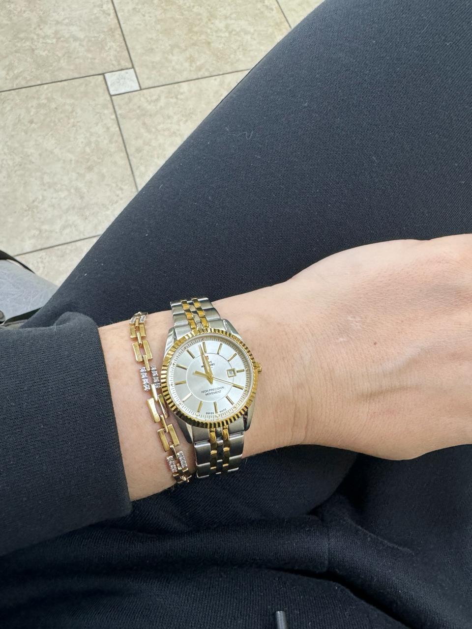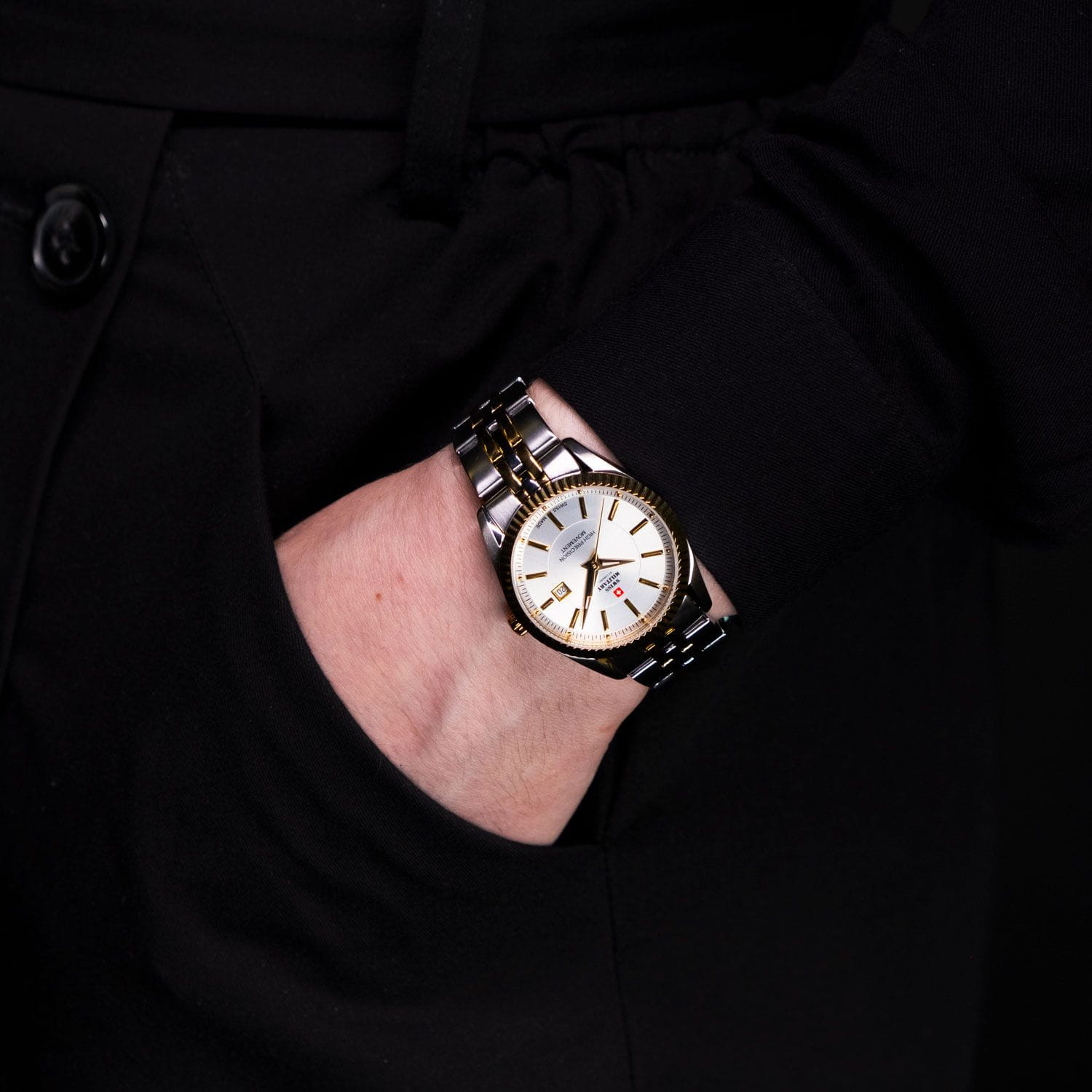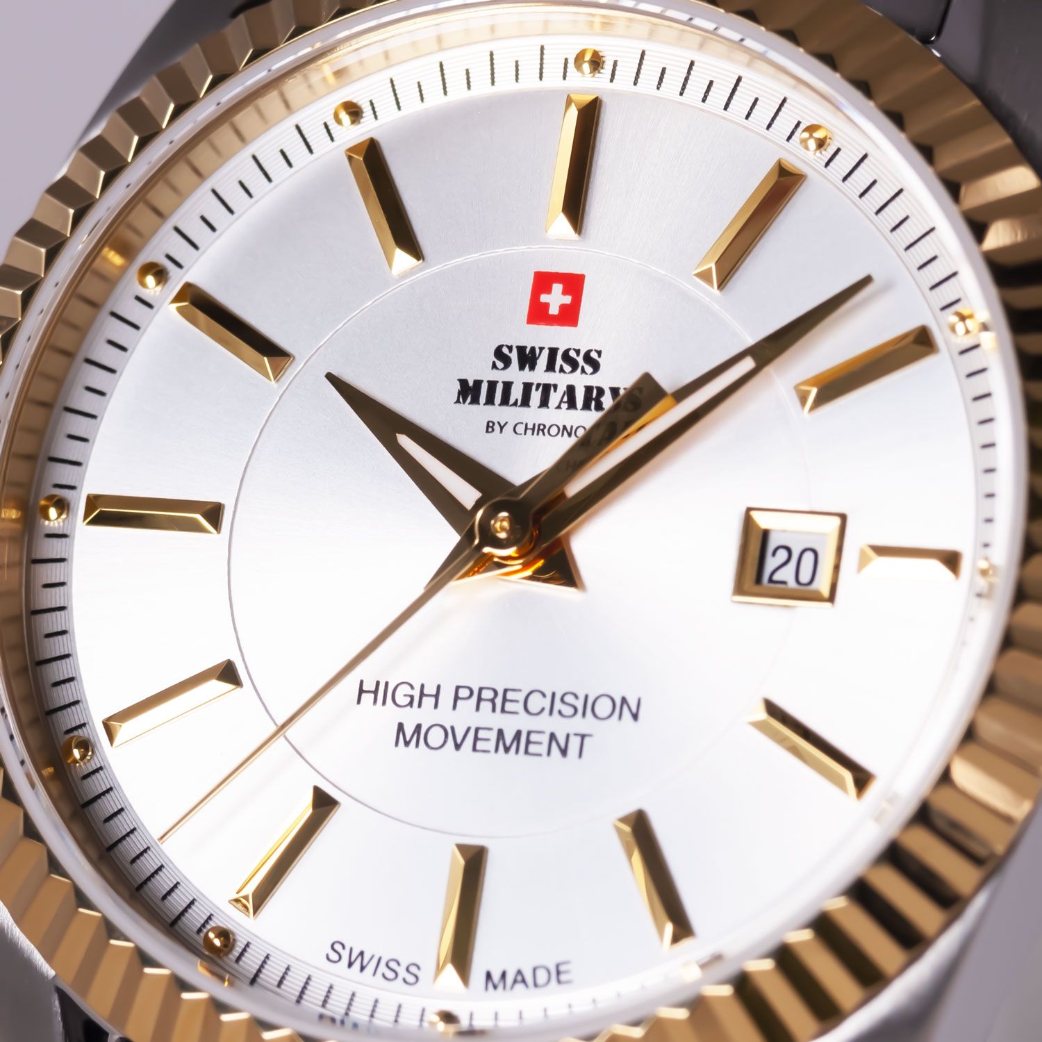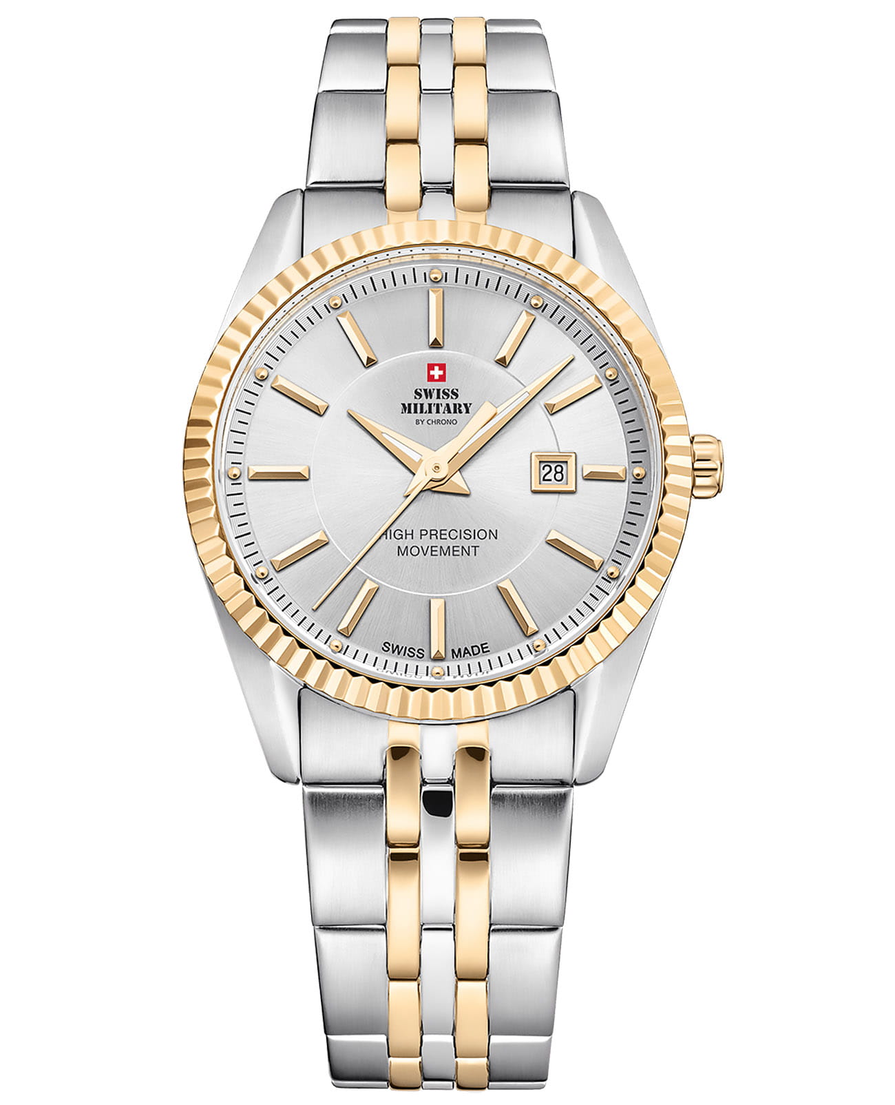 Женские швейцарские наручные часы Swiss Military by Chrono SM34066.05, кварцевый механизм с высокой точностью. Минеральное стеклоМинеральное стеклоМинеральное стекло представляет собой искусственно выращенный минерал кварца. Такое стекло отличается особой устойчивостью к повреждениям и царапинам. Уступает по некоторым качествам сапфировому стеклу. устойчивое к появлению царапин, обладающее высокой прозрачностью. Класс водозащиты: 50 метров, позволит защитить корпус от случайных брызг или капель дождя. Корпус часов изготовлен из стали.БезельБезельВнешний ободок, закрепляющий стекло. В спортивных часах так называется поворотное кольцо с делениями на циферблате, выполняет роль таймера – замеряет отрезки времени на шкале. Неподвижный безель – элемент декора. Однонаправленно вращающийся безель на дайверских часах позволяет фиксировать моменты погружения и выныривания на поверхность. с PVD-покрытиемPVDУльтратонкое покрытие наносится в технике вакуумного напыления, сочетает в себе нитрид титана особой прочности со слоем золота или оксида хрома. Несёт в себе декоративную или защитную функцию.. Браслет с раскладной застёжкойРаскладная застёжкаТакой тип застёжки используется только на браслетах из металла. Она никогда не раскрывается полностью, происходит разделение на 2 и более частей. Раскладывающая застёжка снизит вероятность потери часов к минимуму. и с частичным PVD-покрытиемPVDУльтратонкое покрытие наносится в технике вакуумного напыления, сочетает в себе нитрид титана особой прочности со слоем золота или оксида хрома. Несёт в себе декоративную или защитную функцию..
