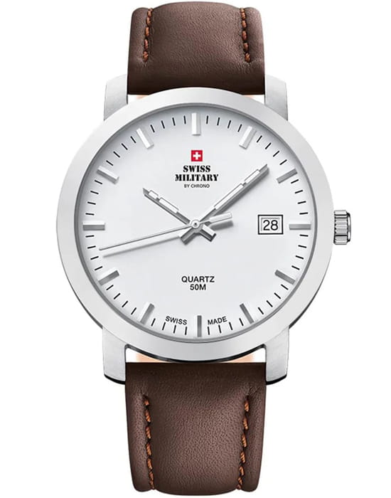 Мужские швейцарские наручные часы Swiss Military by Chrono SM34083.05, Кварцевый механизм с высокой точностью. Класс водозащиты: 50 метров, позволит защитить корпус от случайных брызг или капель дождя. Стрелки и метки с люминесцентным покрытиемЛюминесцентное покрытиеПозволяет считывать показания времени в темноте. Производители наносят на стрелки, часовые индексы, безель или поверхность циферблата светонакопительный состав, дающий холодное свечение.. Корпус выполнен из нержавеющей стали. Устойчивое к возникновению царапин минеральное стеклоМинеральное стеклоМинеральное стекло представляет собой искусственно выращенный минерал кварца. Такое стекло отличается особой устойчивостью к повреждениям и царапинам. Уступает по некоторым качествам сапфировому стеклу.. Кожаный ремень.