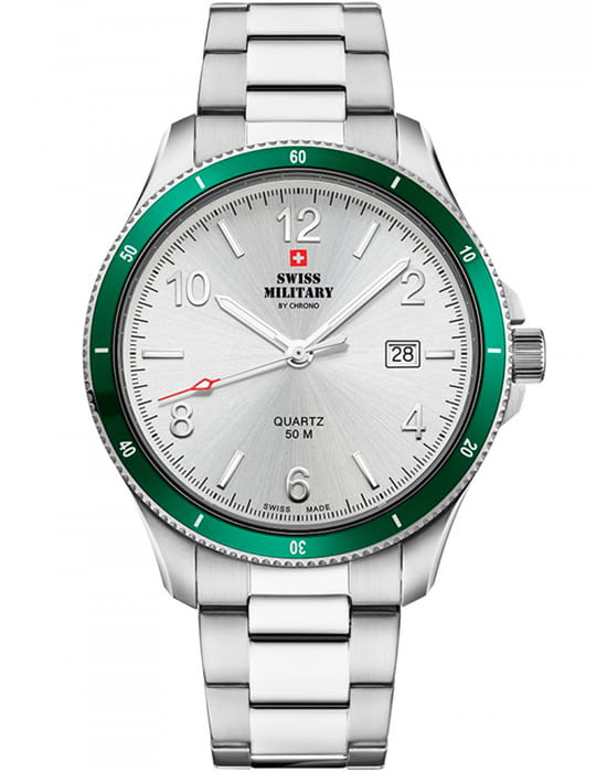 Мужские швейцарские наручные часы Swiss Military by Chrono SM34096.04, Кварцевый механизм с высокой точностью. Класс водозащиты: 50 метров, позволит защитить корпус от случайных брызг или капель дождя. Стрелки и метки с люминесцентным покрытиемЛюминесцентное покрытиеПозволяет считывать показания времени в темноте. Производители наносят на стрелки, часовые индексы, безель или поверхность циферблата светонакопительный состав, дающий холодное свечение.. Корпус выполнен из нержавеющей стали. Устойчивое к возникновению царапин минеральное стеклоМинеральное стеклоМинеральное стекло представляет собой искусственно выращенный минерал кварца. Такое стекло отличается особой устойчивостью к повреждениям и царапинам. Уступает по некоторым качествам сапфировому стеклу.. Браслет выполнен из нержавеющей стали. Вращающийся безельБезельВнешний ободок, закрепляющий стекло. В спортивных часах так называется поворотное кольцо с делениями на циферблате, выполняет роль таймера – замеряет отрезки времени на шкале. Неподвижный безель – элемент декора. Однонаправленно вращающийся безель на дайверских часах позволяет фиксировать моменты погружения и выныривания на поверхность. с минутной шкалой.