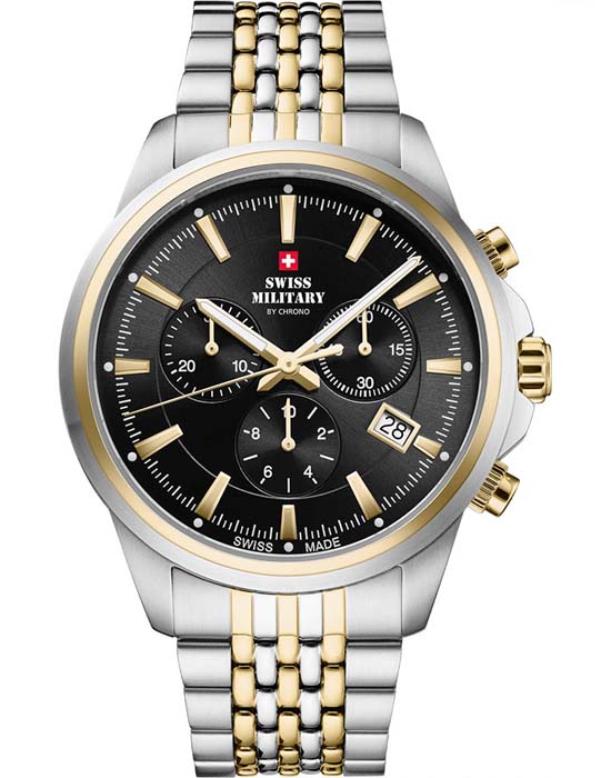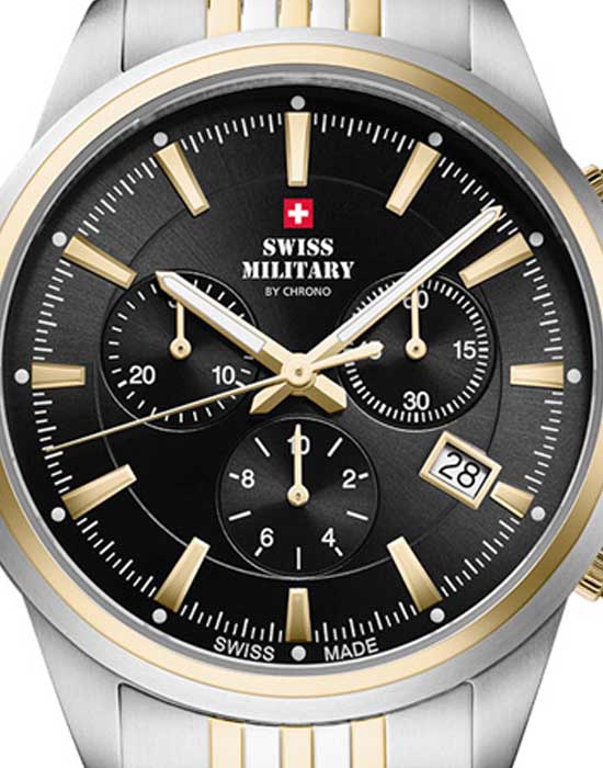 Часы Swiss Military SM34107.05— это хронограф, сочетающий стиль и функциональность. Корпус диаметром 40 мм выполнен из нержавеющей стали, что обеспечивает долговечность и надёжность. Циферблат с солнечным узором украшен белыми люминесцентными индексамиЛюминесцентное покрытиеПозволяет считывать показания времени в темноте. Производители наносят на стрелки, часовые индексы, безель или поверхность циферблата светонакопительный состав, дающий холодное свечение. и стрелками, что позволяет легко считывать время в любых условиях. Защиту циферблата обеспечивает сапфировое стеклоСапфировое стеклоПрочный и надёжный материал из кристалла сапфира синтетического происхождения, характеризующийся особой твёрдостью и устойчивостью к царапинам и повреждениям., устойчивое к царапинам. БезельБезельВнешний ободок, закрепляющий стекло. В спортивных часах так называется поворотное кольцо с делениями на циферблате, выполняет роль таймера – замеряет отрезки времени на шкале. Неподвижный безель – элемент декора. Однонаправленно вращающийся безель на дайверских часах позволяет фиксировать моменты погружения и выныривания на поверхность. с PVD-покрытиемPVDУльтратонкое покрытие наносится в технике вакуумного напыления, сочетает в себе нитрид титана особой прочности со слоем золота или оксида хрома. Несёт в себе декоративную или защитную функцию.. Водозащита до 10 ATM делает часы подходящими для плавания и других водных активностей. Швейцарский кварцевый механизм обеспечивает высокую точность измерения времени и функции хронографа. Стальной браслет с PVD-покрытиемPVDУльтратонкое покрытие наносится в технике вакуумного напыления, сочетает в себе нитрид титана особой прочности со слоем золота или оксида хрома. Несёт в себе декоративную или защитную функцию. на раскладной застёжкеРаскладная застёжкаТакой тип застёжки используется только на браслетах из металла. Она никогда не раскрывается полностью, происходит разделение на 2 и более частей. Раскладывающая застёжка снизит вероятность потери часов к минимуму. гарантирует комфортное ношение и надёжную фиксацию. Часы сопровождаются 5-летней международной гарантией, подтверждающей их высокое качество и надёжность. Swiss Military — это идеальный выбор для мужчин, которые ценят швейцарское качество и ведут активный образ жизни.