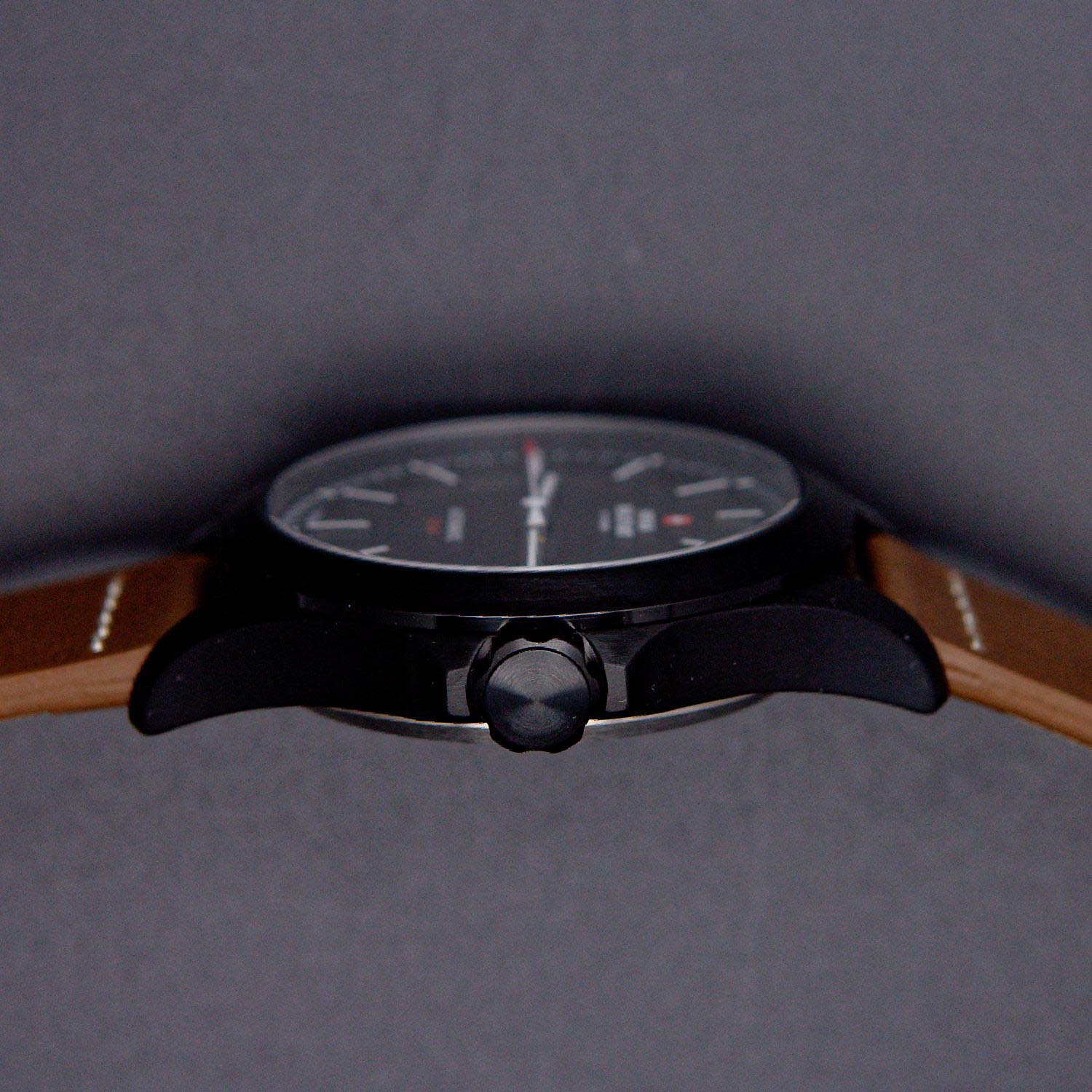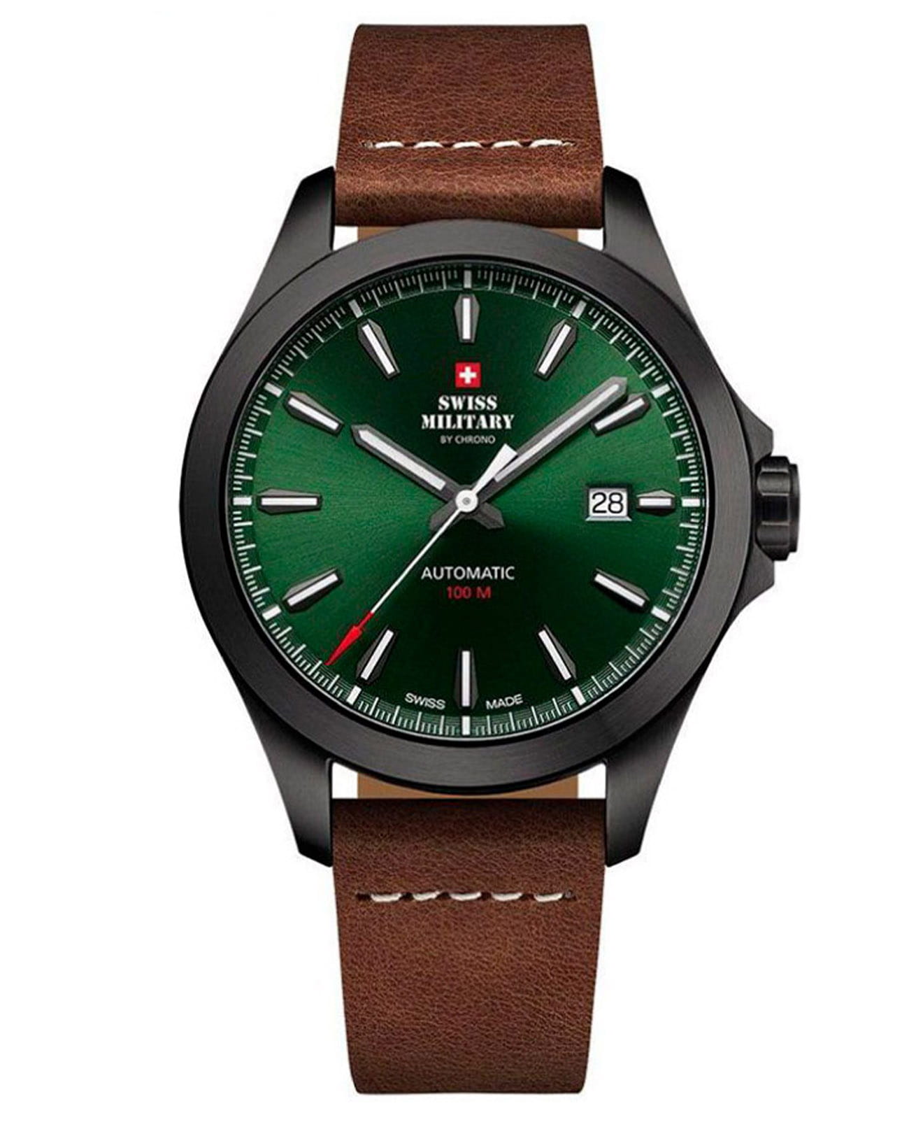 Мужские швейцарские механические часы с автоподзаводом Swiss Military by Chrono Automatic Collection SMA34077.12, механический механизм (автоматический калибр) с высокой точностью. Сапфировое стеклоСапфировое стеклоПрочный и надёжный материал из кристалла сапфира синтетического происхождения, характеризующийся особой твёрдостью и устойчивостью к царапинам и повреждениям. устойчивое к появлению царапин, обладающее высокой прозрачностью. Класс водозащиты: 100 метров, позволит плавать, нырять и заниматься другими водными видами спорта. Корпус часов изготовлен из матовой стали с PVDPVDУльтратонкое покрытие наносится в технике вакуумного напыления, сочетает в себе нитрид титана особой прочности со слоем золота или оксида хрома. Несёт в себе декоративную или защитную функцию. покрытием черного цвета. Апертура даты в позиции 3 часов. Коричневый кожаный ремешок с классической пряжкой.