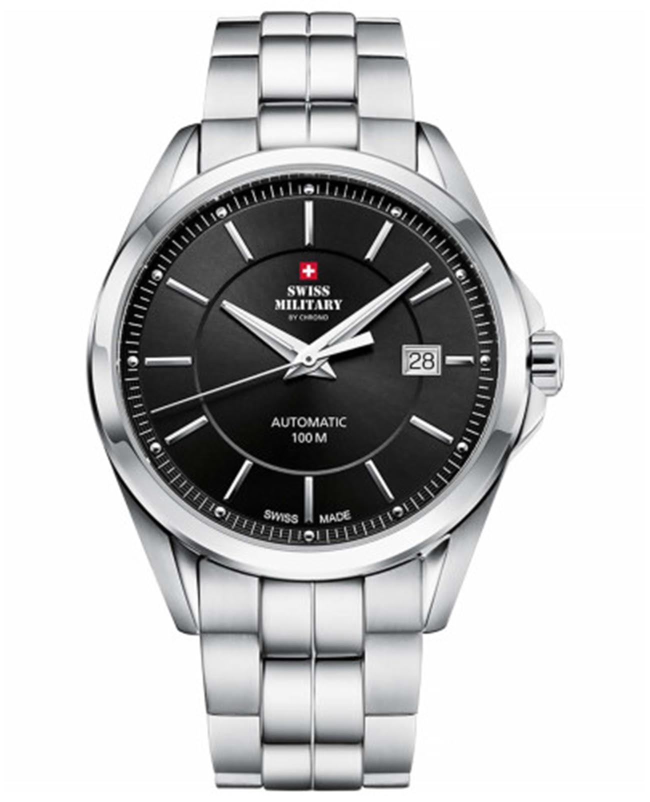 Мужские швейцарские наручные часы Swiss Military by Chrono SMA34085.01, механический механизм (автоматический калибр) с высокой точностью. Сапфировое стеклоСапфировое стеклоПрочный и надёжный материал из кристалла сапфира синтетического происхождения, характеризующийся особой твёрдостью и устойчивостью к царапинам и повреждениям. устойчивое к появлению царапин, обладающее высокой прозрачностью. Класс водозащиты: 100 метров, позволит плавать, нырять и заниматься другими водными видами спорта. Корпус часов изготовлен из стали, серебристого цвета. Люминесцентная подсветкаЛюминесцентное покрытиеПозволяет считывать показания времени в темноте. Производители наносят на стрелки, часовые индексы, безель или поверхность циферблата светонакопительный состав, дающий холодное свечение. стрелок. Браслет с раскладной застёжкойРаскладная застёжкаТакой тип застёжки используется только на браслетах из металла. Она никогда не раскрывается полностью, происходит разделение на 2 и более частей. Раскладывающая застёжка снизит вероятность потери часов к минимуму..