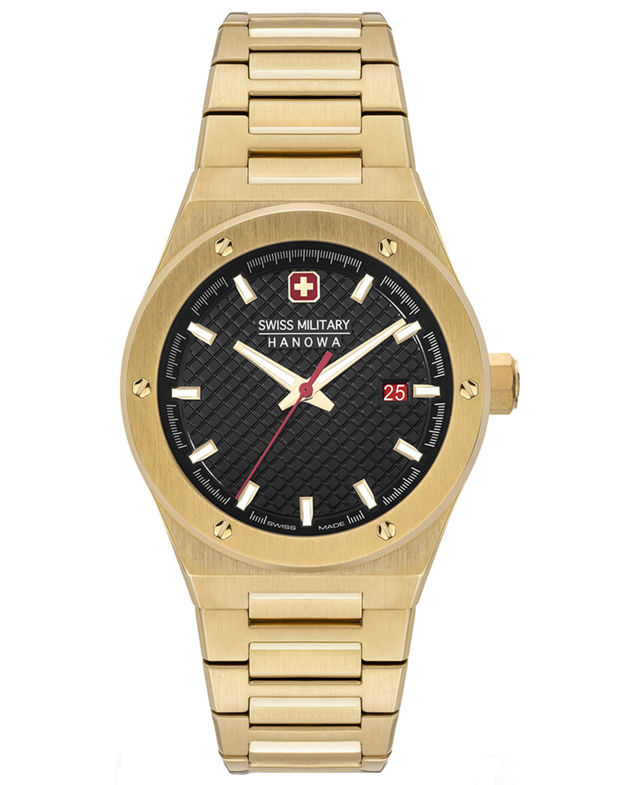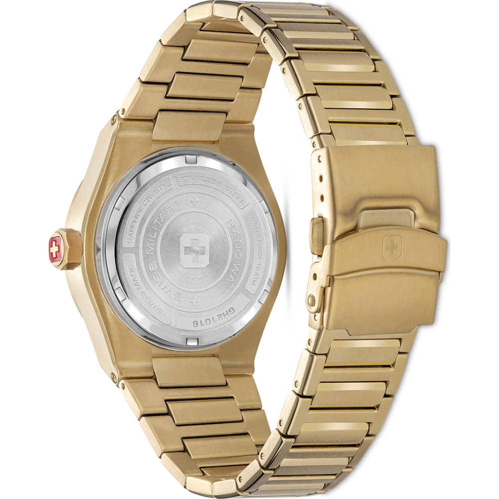 Мужские швейцарские часы с сапфировым стеклом Swiss Military Hanowa Sidewinder SMWGH2101610, кварцевый механизм с высокой точностью. Сапфировое стекло устойчивое к появлению царапин, обладающее высокой прозрачностью. Класс водозащиты: 100 метров, позволит плавать, нырять и заниматься другими водными видами спорта. Корпус часов изготовлен из стали, золотистого цвета.