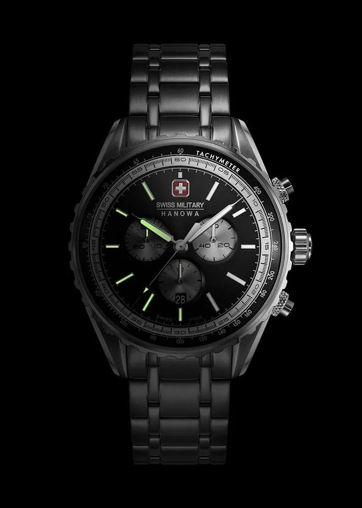 Мужские швейцарские часы Swiss Military Hanowa Afterburn Chrono SMWGI0000309 с хронографомХронографФункция позволяет измерять отрезки времени с особой точностью: часы, минуты, секунды. Верным признаком хронографа является наличие на циферблате 3 дополнительных окошек-счётчиков. и секундомеромСекундомерСекундоме́р — прибор, способный измерять интервалы времени с точностью до долей секунды.. Сапфировое стеклоСапфировое стеклоПрочный и надёжный материал из кристалла сапфира синтетического происхождения, характеризующийся особой твёрдостью и устойчивостью к царапинам и повреждениям. с антибликовым покрытием защищает циферблат от царапин и обеспечивает отличную читаемость при любом освещении. Корпус из нержавеющей стали диаметром 44 мм сбалансирован и элегантен. Браслет с раскладной застёжкойРаскладная застёжкаТакой тип застёжки используется только на браслетах из металла. Она никогда не раскрывается полностью, происходит разделение на 2 и более частей. Раскладывающая застёжка снизит вероятность потери часов к минимуму. идеально дополняют дизайн часов, обеспечивая комфортное ношение. Люминесцентное покрытиеЛюминесцентное покрытиеПозволяет считывать показания времени в темноте. Производители наносят на стрелки, часовые индексы, безель или поверхность циферблата светонакопительный состав, дающий холодное свечение. стрелок и меток позволит вам следить за временем даже в полной темноте. Стальной безельБезельВнешний ободок, закрепляющий стекло. В спортивных часах так называется поворотное кольцо с делениями на циферблате, выполняет роль таймера – замеряет отрезки времени на шкале. Неподвижный безель – элемент декора. Однонаправленно вращающийся безель на дайверских часах позволяет фиксировать моменты погружения и выныривания на поверхность. с PVD-покрытиемPVDУльтратонкое покрытие наносится в технике вакуумного напыления, сочетает в себе нитрид титана особой прочности со слоем золота или оксида хрома. Несёт в себе декоративную или защитную функцию.. Часы оснащены центральной секундной стрелкой и окошком даты в положении «6 часов», что делает их функциональными для повседневного использования. ТахиметрТахиметрРазмеченная шкала, располагается на ободке или безеле часов. Тахиметр позволяет рассчитать скорость на определённом участке пути, расстояние измеряется в километрах или милях. по внешнему краю. Водонепроницаемость до 100 метров. Идеальный выбор для тех, кто ценит качество и долговечность.