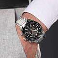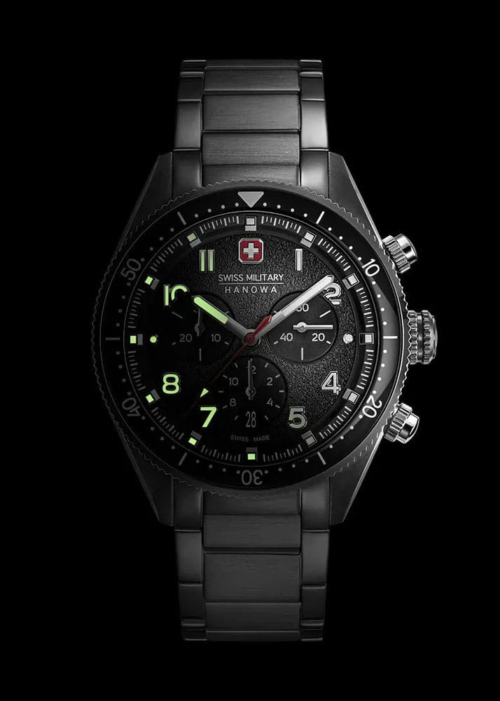 Swiss Military Hanowa Greyhound SMWGI0003803 — мужские часы-хронографХронографФункция позволяет измерять отрезки времени с особой точностью: часы, минуты, секунды. Верным признаком хронографа является наличие на циферблате 3 дополнительных окошек-счётчиков., воплощение швейцарского качества и элегантного дизайна. Эти часы идеально подойдут для уверенного в себе мужчины, ценящего стиль и надежность. Корпус часов выполнен из нержавеющей стали, что придает им современный и мужественный вид. Диаметр корпуса составляет 43 мм, что делает их универсальным аксессуаром для любого случая. Черный циферблат с серыми арабскими цифрами и стрелками светящимися в темноте благодаря люминесцентному покрытиюЛюминесцентное покрытиеПозволяет считывать показания времени в темноте. Производители наносят на стрелки, часовые индексы, безель или поверхность циферблата светонакопительный состав, дающий холодное свечение. обеспечивает отличную читаемость и подчеркивает строгий стиль модели. Сапфировое стеклоСапфировое стеклоПрочный и надёжный материал из кристалла сапфира синтетического происхождения, характеризующийся особой твёрдостью и устойчивостью к царапинам и повреждениям. защищает циферблат от царапин и повреждений, гарантируя долгий срок службы и сохранение первоначального внешнего вида часов. Часы оснащены надежным кварцевым механизмом, который обеспечивает высокую точность хода. Водозащита на уровне 100WR позволяет не беспокоиться о контакте с водой во время повседневной носки. Вращающийся в одном направлении рифленый безельБезельВнешний ободок, закрепляющий стекло. В спортивных часах так называется поворотное кольцо с делениями на циферблате, выполняет роль таймера – замеряет отрезки времени на шкале. Неподвижный безель – элемент декора. Однонаправленно вращающийся безель на дайверских часах позволяет фиксировать моменты погружения и выныривания на поверхность. с IP-покрытиемIP-покрытиеМетод ионного напыления. Демонстрирует повышенную устойчивость к истиранию, окислению и химическим веществам. Под воздействием высокого давления и температуры около 1500°C молекулы металла надёжно соединяются с частицами корпуса часов.. Стальной браслет на раскладной застёжкеРаскладная застёжкаТакой тип застёжки используется только на браслетах из металла. Она никогда не раскрывается полностью, происходит разделение на 2 и более частей. Раскладывающая застёжка снизит вероятность потери часов к минимуму. обеспечивает комфортное ношение на запястье.