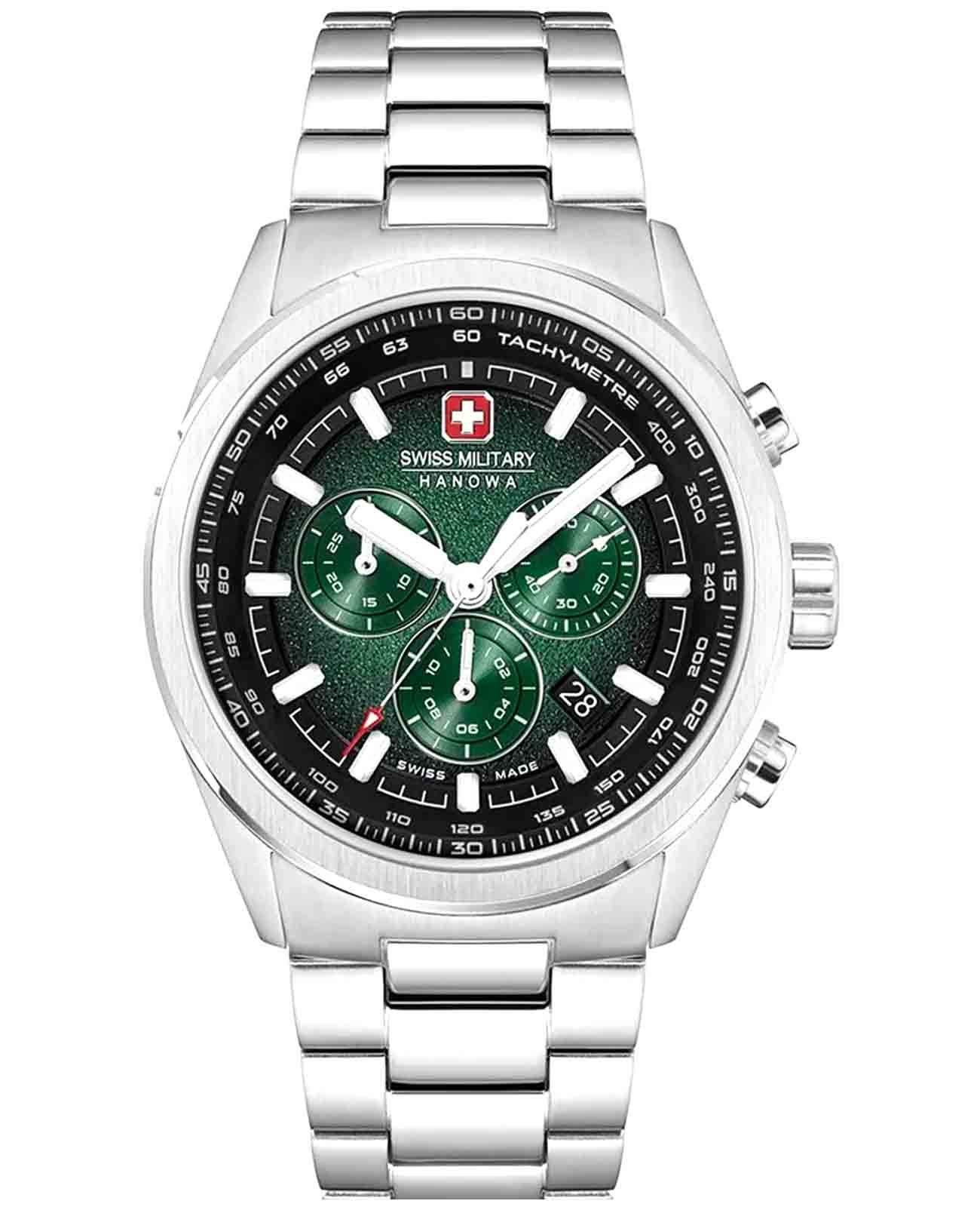 Мужские швейцарские часы Swiss Military Hanowa SMWGI0004206 – это элегантные часы, сочетающие в себе классический дизайн и современную функциональность. Корпус из нержавеющей стали диаметром 43 мм сбалансирован и элегантен. Сапфировое стеклоСапфировое стеклоПрочный и надёжный материал из кристалла сапфира синтетического происхождения, характеризующийся особой твёрдостью и устойчивостью к царапинам и повреждениям. с антибликовым покрытием защищает циферблат от царапин и обеспечивает отличную читаемость при любом освещении. Браслет с раскладной застёжкойРаскладная застёжкаТакой тип застёжки используется только на браслетах из металла. Она никогда не раскрывается полностью, происходит разделение на 2 и более частей. Раскладывающая застёжка снизит вероятность потери часов к минимуму. идеально дополняют дизайн часов, обеспечивая комфортное ношение. Люминесцентное покрытиеЛюминесцентное покрытиеПозволяет считывать показания времени в темноте. Производители наносят на стрелки, часовые индексы, безель или поверхность циферблата светонакопительный состав, дающий холодное свечение. стрелок и меток позволит вам следить за временем даже в полной темноте. Циферблат с точным механизмом хронографаХронографФункция позволяет измерять отрезки времени с особой точностью: часы, минуты, секунды. Верным признаком хронографа является наличие на циферблате 3 дополнительных окошек-счётчиков. и хорошо заметным индикатором даты в положении «4 часа». ТахиметрТахиметрРазмеченная шкала, располагается на ободке или безеле часов. Тахиметр позволяет рассчитать скорость на определённом участке пути, расстояние измеряется в километрах или милях. по внешнему краю. Водонепроницаемость до 100 метров хорошо подходят для повседневного ношения и занятий водными видами спорта.