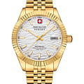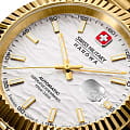 Часы Swiss Military Hanowa Master Diligenter SMWGL0005410 — это образец швейцарской точности и изысканного стиля. Эти механические часы с автоподзаводом оснащены калибром Soprod P024, который обеспечивает надежную работу механизма. Запас хода составляет 38 часов, что гарантирует их бесперебойное функционирование. Элегантный корпус диаметром 41 мм и толщиной 11 мм выполнен из прочной стали с золотистым IP-покрытиемIP-покрытиеМетод ионного напыления. Демонстрирует повышенную устойчивость к истиранию, окислению и химическим веществам. Под воздействием высокого давления и температуры около 1500°C молекулы металла надёжно соединяются с частицами корпуса часов. и украшен рифленым безелемБезельВнешний ободок, закрепляющий стекло. В спортивных часах так называется поворотное кольцо с делениями на циферблате, выполняет роль таймера – замеряет отрезки времени на шкале. Неподвижный безель – элемент декора. Однонаправленно вращающийся безель на дайверских часах позволяет фиксировать моменты погружения и выныривания на поверхность.. Серебристый текстурированный циферблат защищен сапфировым стекломСапфировое стеклоПрочный и надёжный материал из кристалла сапфира синтетического происхождения, характеризующийся особой твёрдостью и устойчивостью к царапинам и повреждениям., которое устойчиво к царапинам и сохраняет безупречный вид. Метки в виде штрихов и стрелки имеют люминесцентное покрытиеЛюминесцентное покрытиеПозволяет считывать показания времени в темноте. Производители наносят на стрелки, часовые индексы, безель или поверхность циферблата светонакопительный состав, дающий холодное свечение., которое обеспечивает видимость в темноте после кратковременной зарядки на свету. Окошко даты с увеличительным стеклом расположено в положении 3 часа, а фирменный логотип Swiss Military Hanowa находится в позиции 12 часов. Заводная головка с рифлением украшена фирменным логотипом, добавляя часам изысканный акцент. Прозрачная задняя крышка позволяет наблюдать за работой механизма, подчеркивая внимание к деталям. Завершает образ стальной браслет с золотистым IP-покрытиемIP-покрытиеМетод ионного напыления. Демонстрирует повышенную устойчивость к истиранию, окислению и химическим веществам. Под воздействием высокого давления и температуры около 1500°C молекулы металла надёжно соединяются с частицами корпуса часов. и раскладной застёжкойРаскладная застёжкаТакой тип застёжки используется только на браслетах из металла. Она никогда не раскрывается полностью, происходит разделение на 2 и более частей. Раскладывающая застёжка снизит вероятность потери часов к минимуму., который удобно сидит на запястье и обеспечивает надежную фиксацию. Часы обладают водозащитой уровня 100WR, что делает их подходящими для повседневного использования и активного образа жизни.